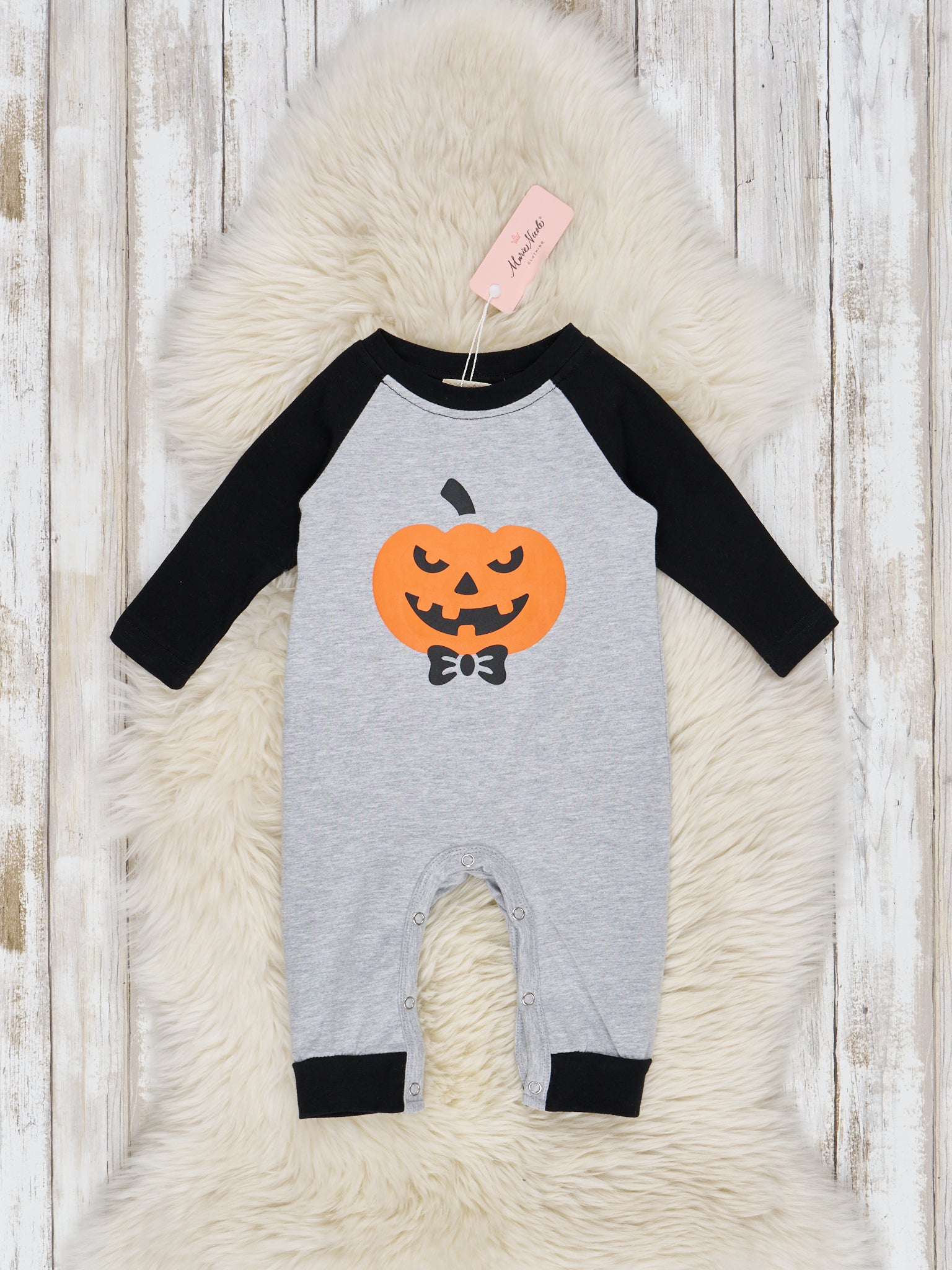 The spookiest brother set is here! Featuring raglan sleeves and jack-o-lantern applique, this super fun romper will have your little Halloween ready!
