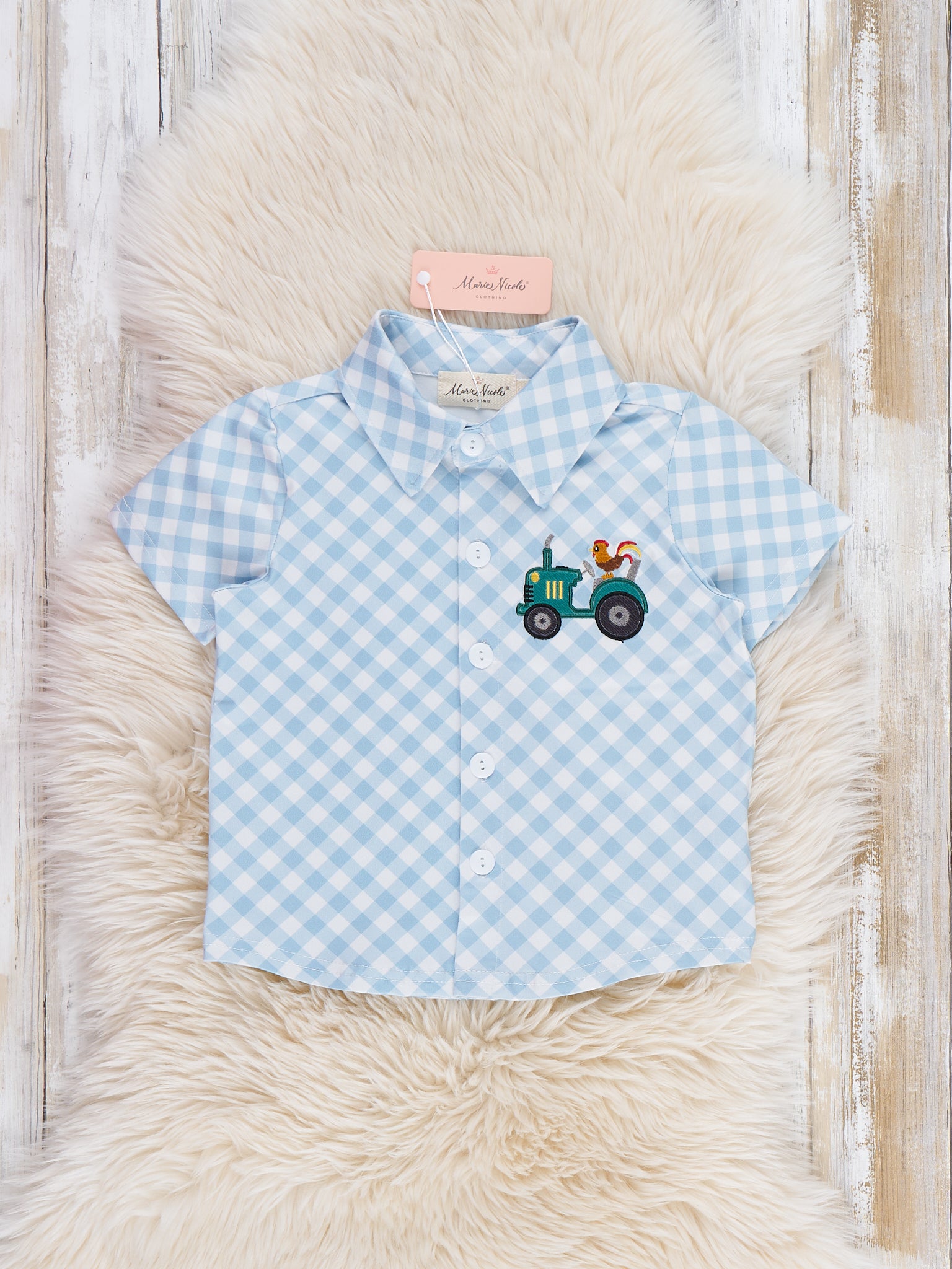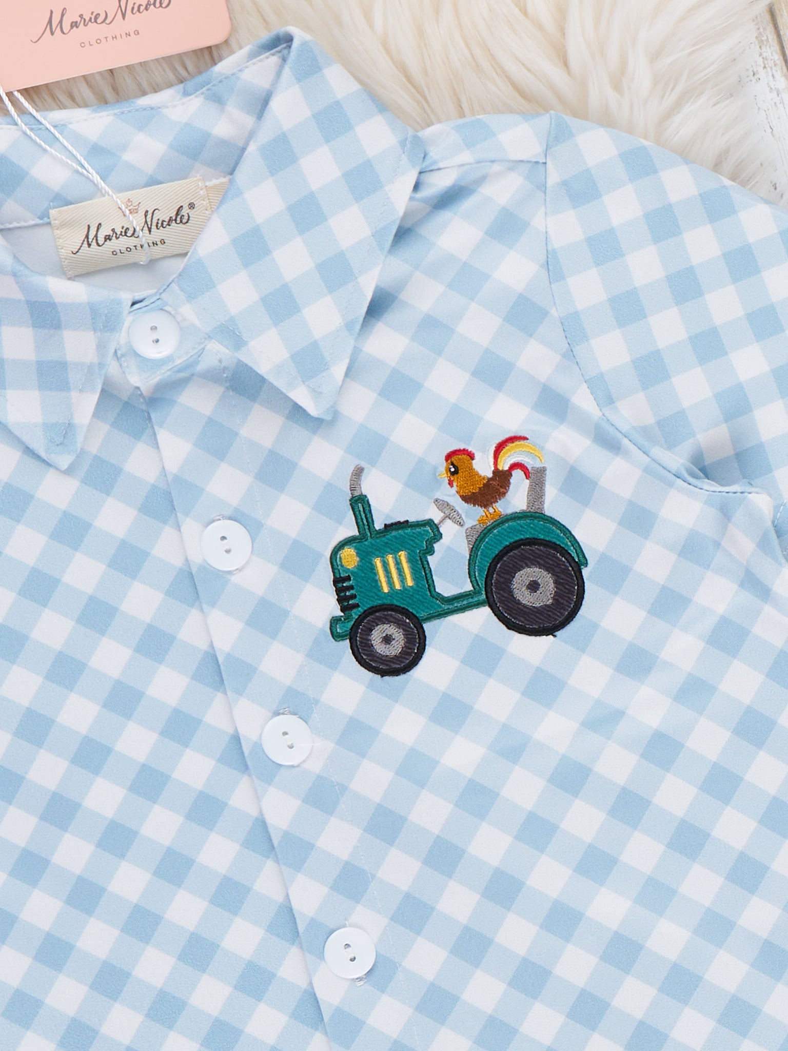 Add some fun to your little one's summer wardrobe with our Embroidered Rooster Tractor Button Up. Featuring a playful rooster riding a tractor on a blue gingham bodice, this brother set will surely delight. With functioning buttons and lightweight fabric, it's perfect for a day on the farm. By Marie Nicole Clothing.