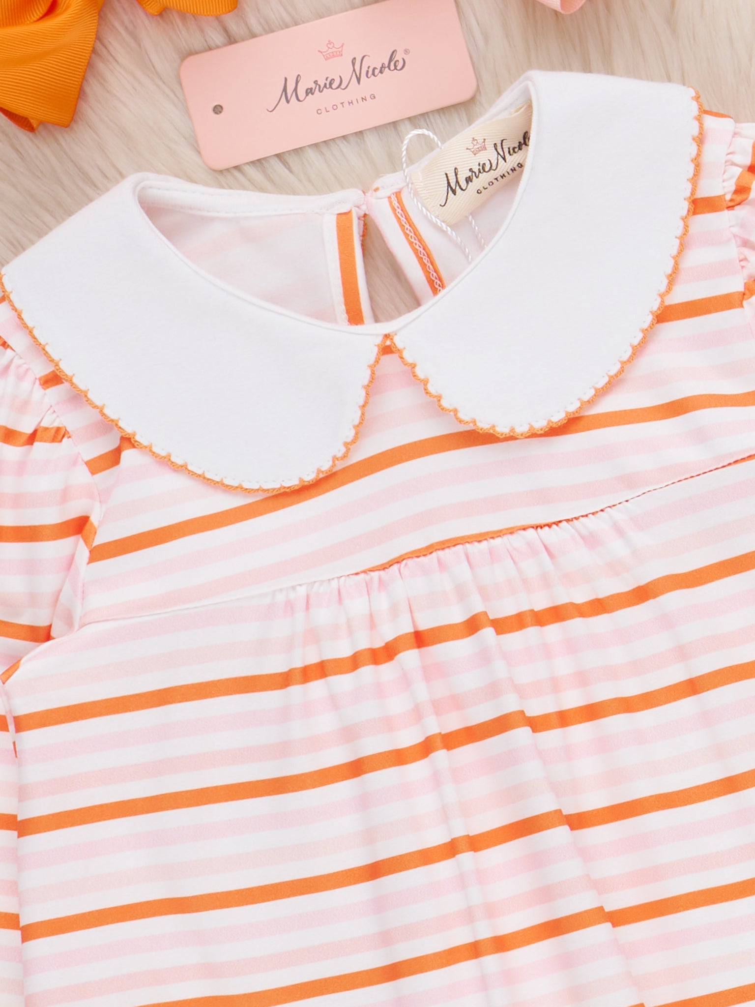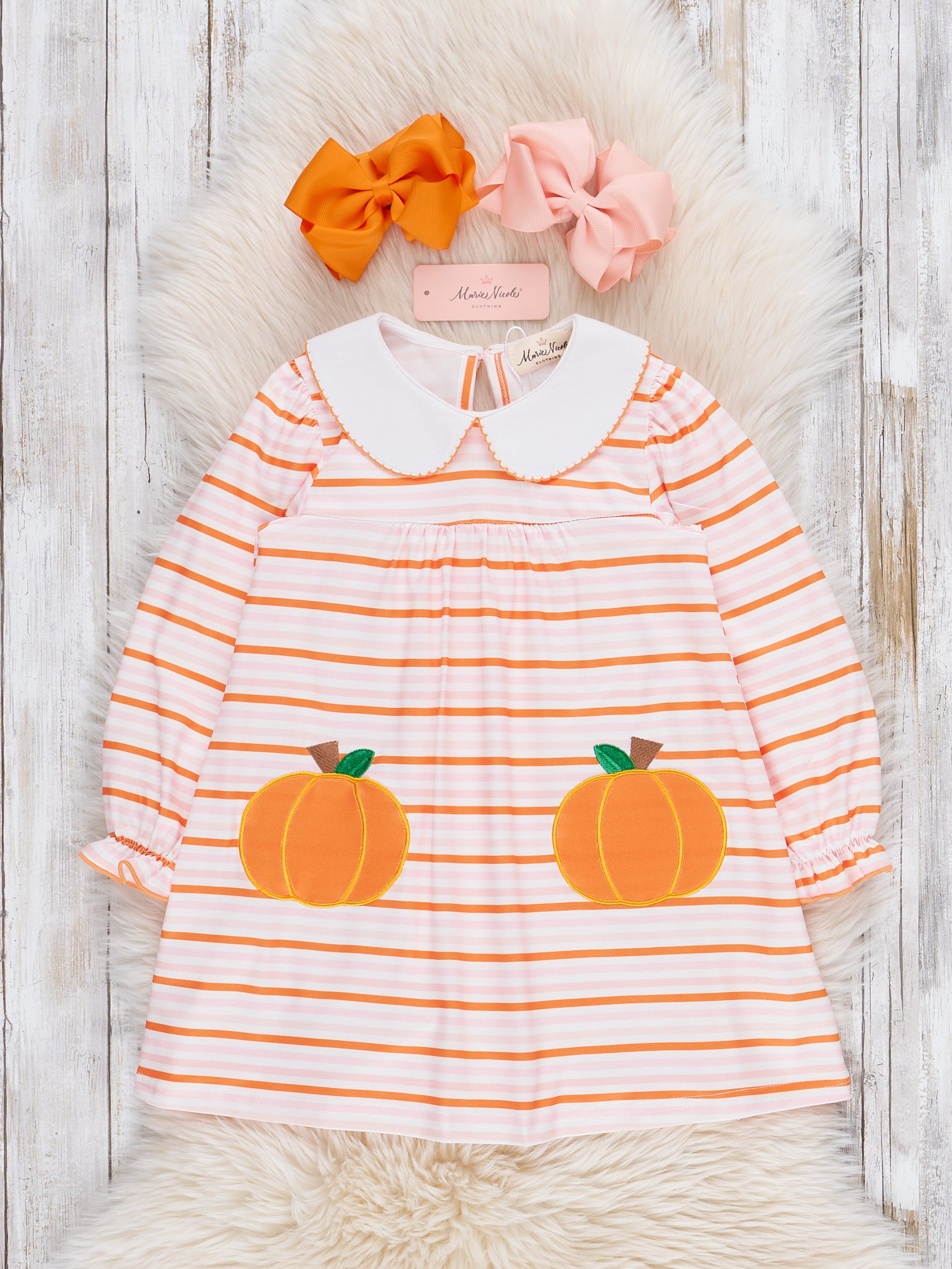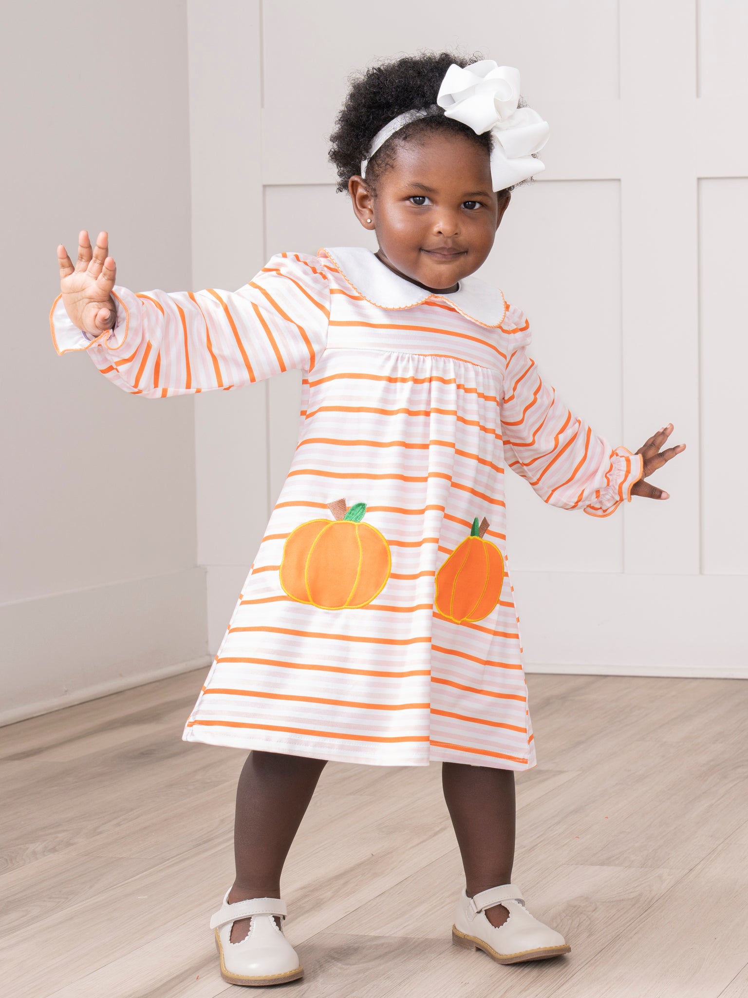 The Embroidered Striped Preppy Pumpkin Dress is a stylish and festive choice for fall fun. Featuring classic stripes paired with charming embroidered pumpkin details, this dress from Marie Nicole Clothing blends preppy with seasonal charm. Made from soft, breathable fabric and finished with subtle ruffle accents, it’s perfect for pumpkin patch visits, family gatherings, and picture-perfect autumn moments.