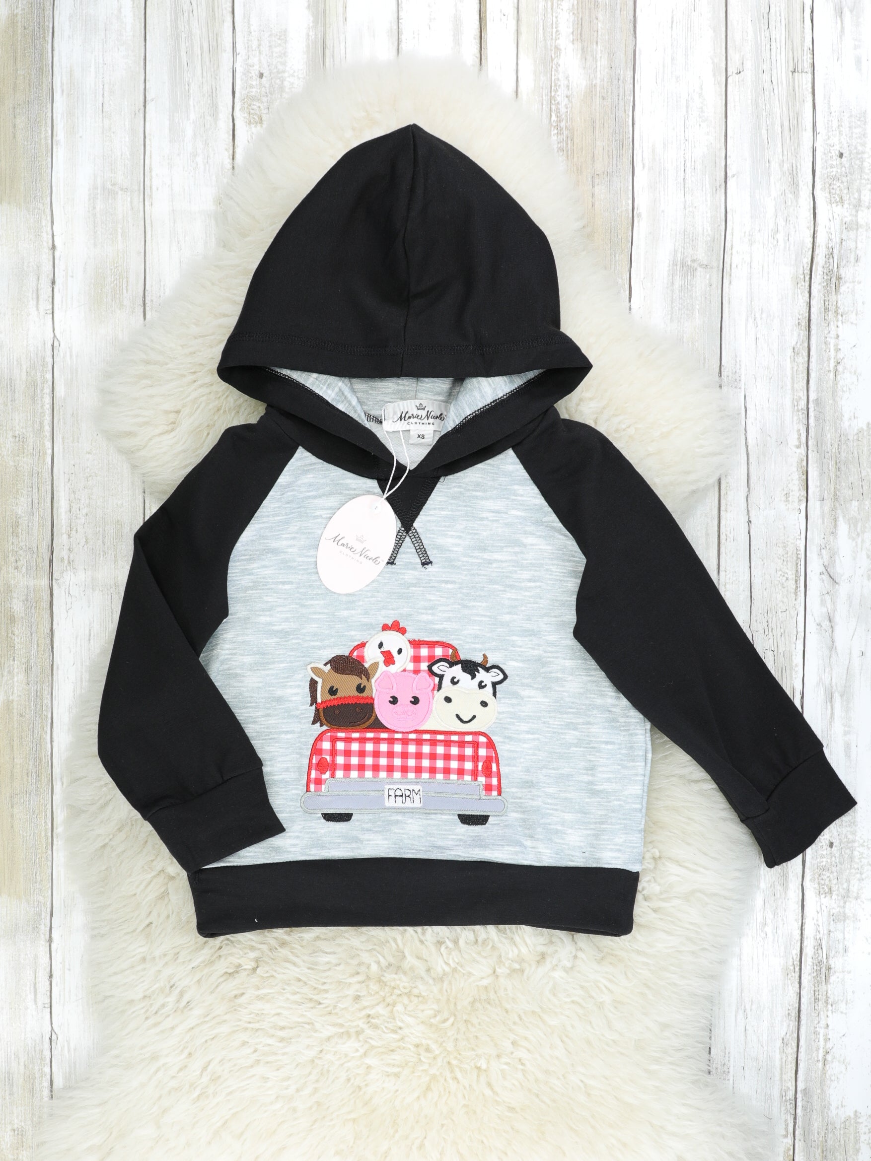 The most charming sibling set for your little farmers! This hoodie features the sweetest farm animals on a road trip appliqué & black raglan sleeves.