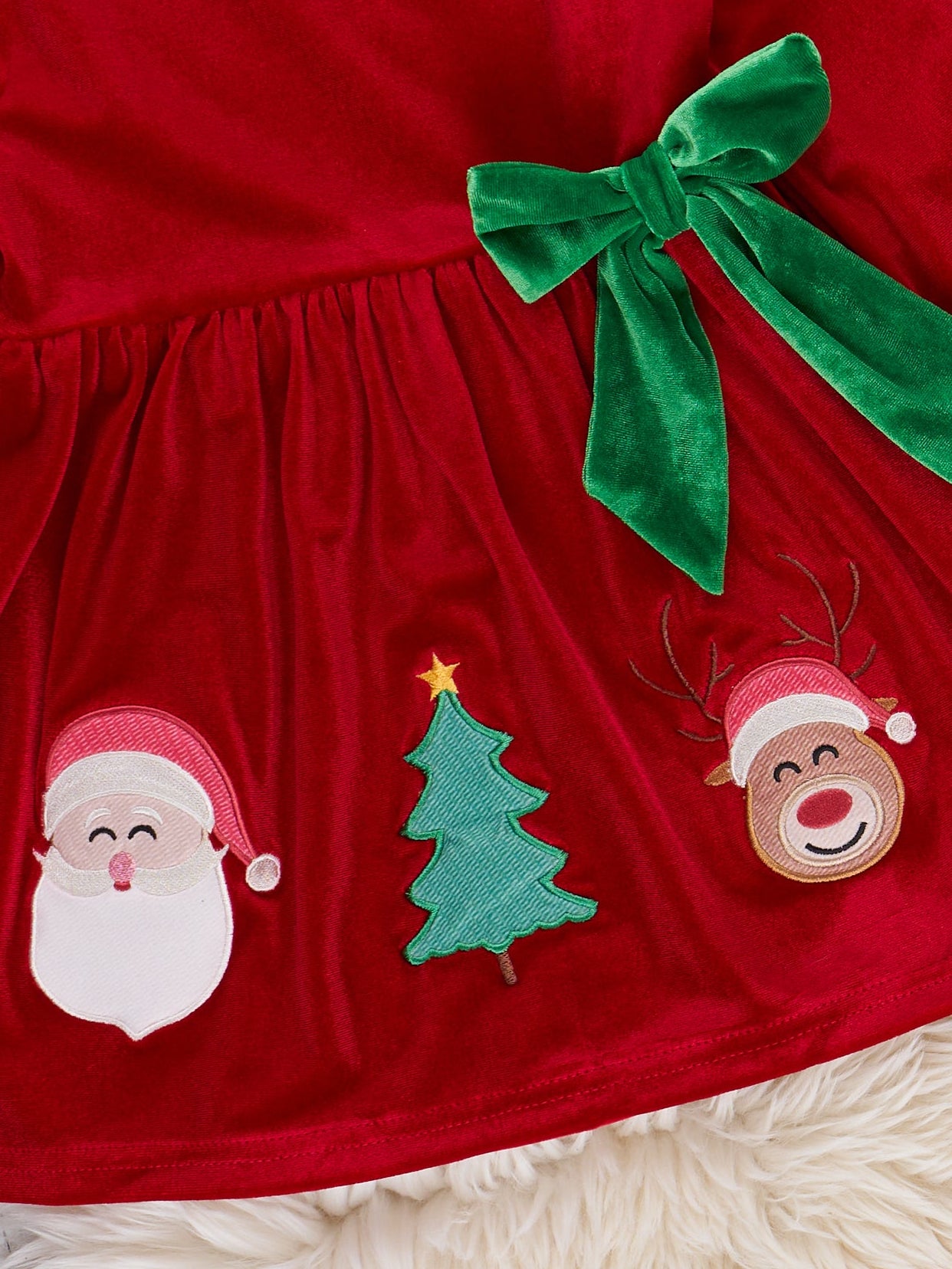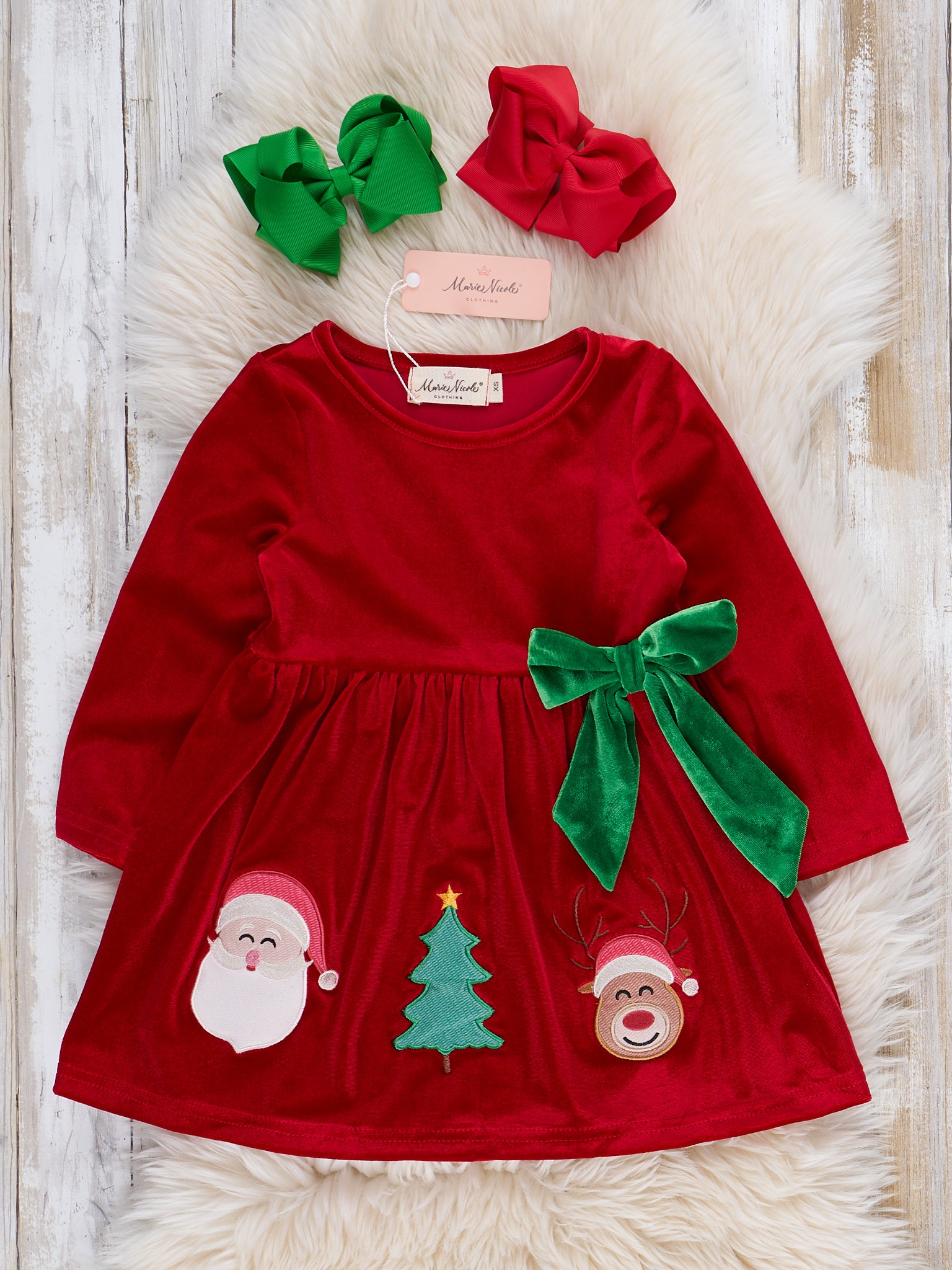 The Festive Friends Embroidered Velvet Dress by Marie Nicole Clothing features a soft velvet fabric adorned with playful holiday appliqués and a festive bow accent. Designed for comfort and seasonal cheer, this dress is perfect for holiday photos, parties, and joyful celebrations, blending classic holiday style with delightful character details.