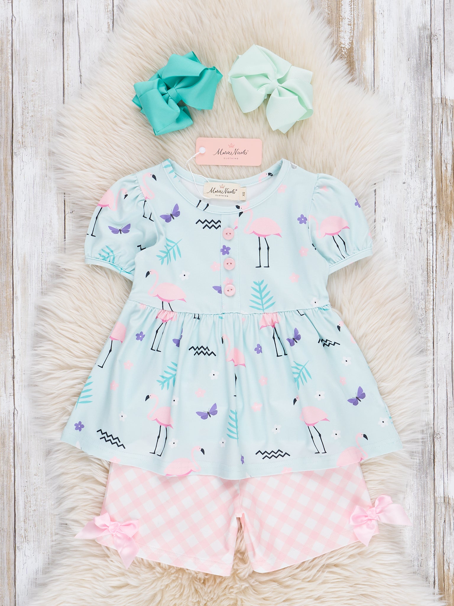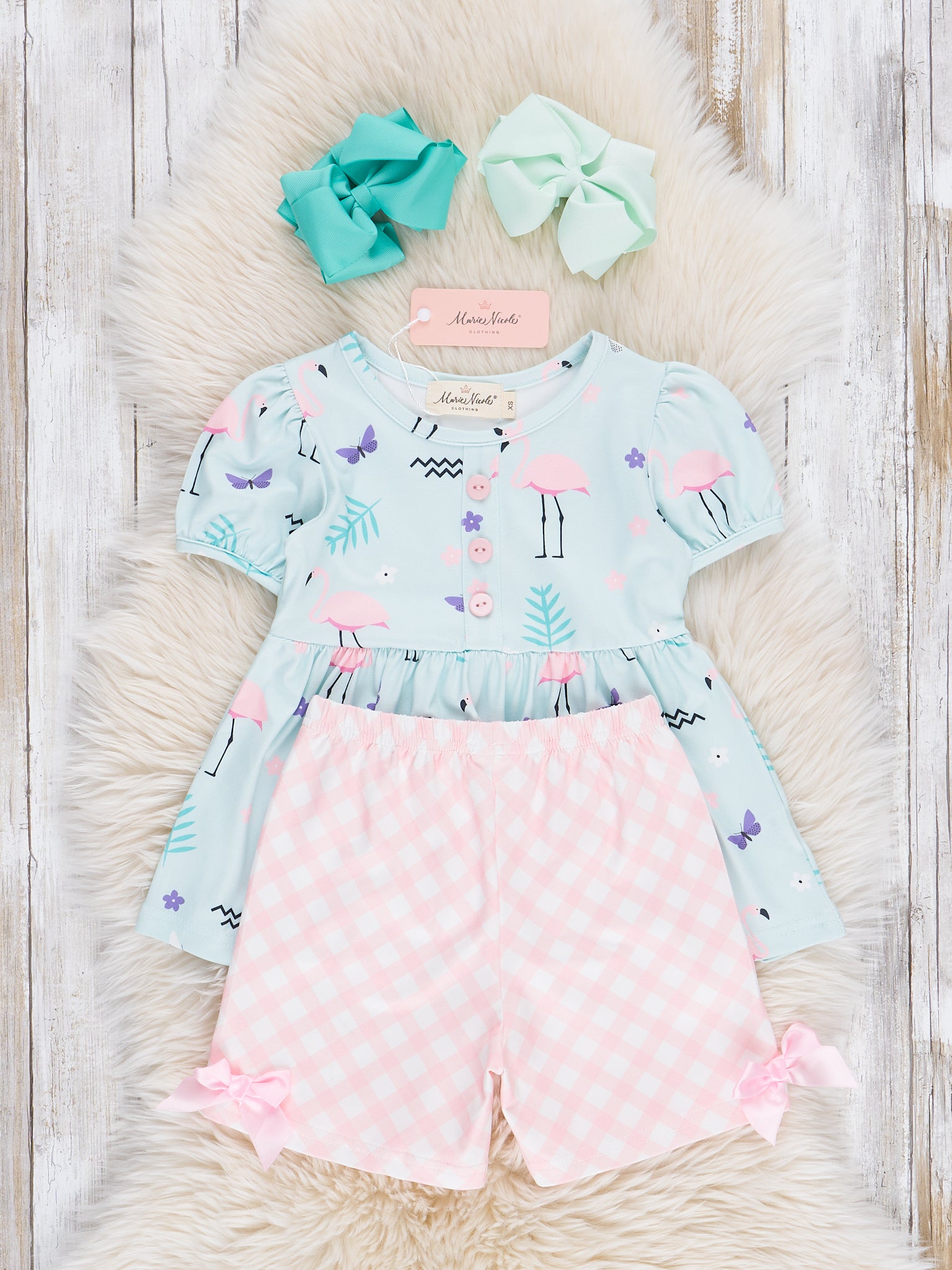 Get ready for a tropical getaway with our Flamingo Paradise Tiered Outfit! This girls shorts set features a playful flamingo print top with a cute Peter Pan collar and matching pink plaid bow accented shorts. Perfect for sisters who want to match on vacation. Designed by Marie Nicole Clothing, this outfit is perfect for summer!