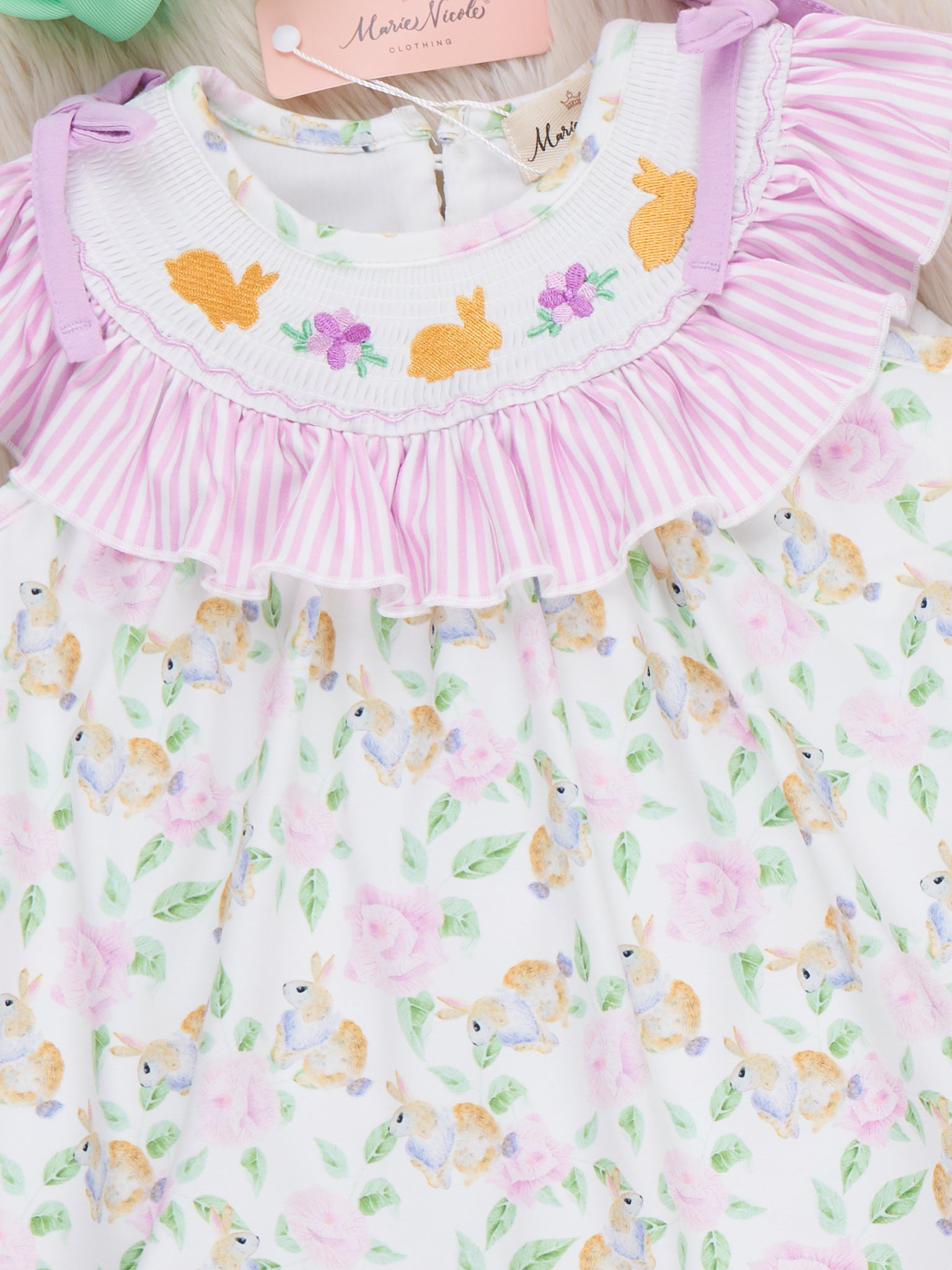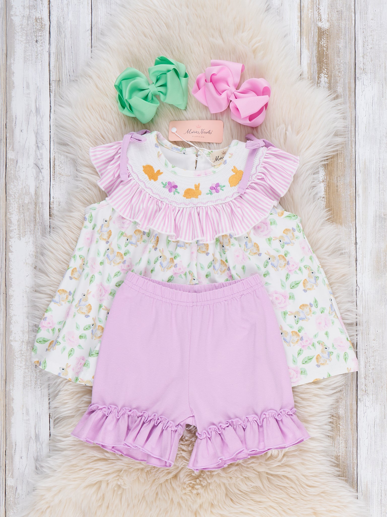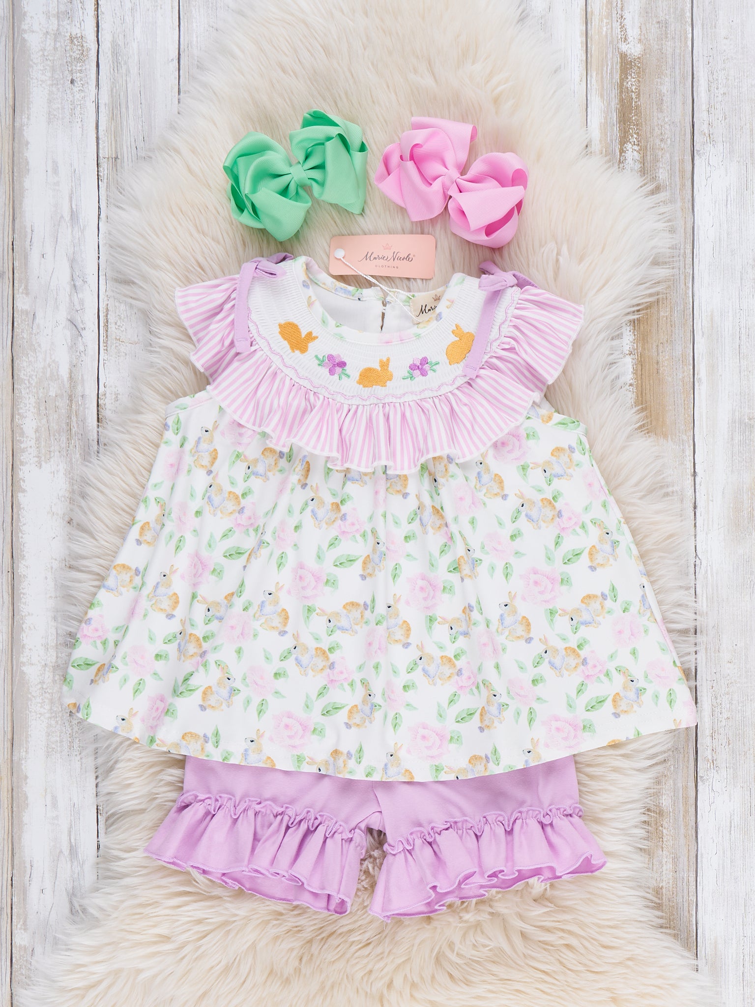 Floral Bunny Rabbits Smocked Ruffle Outfit by Marie Nicole Clothing is a two-piece set featuring a swing top with a sweet floral print, smocked neckline, and ruffle straps paired with coordinating ruffle-hem shorts. The lightweight knit and easy pull-on design make it a comfy, breezy choice for warm-weather playdates, pictures, and everyday wear.