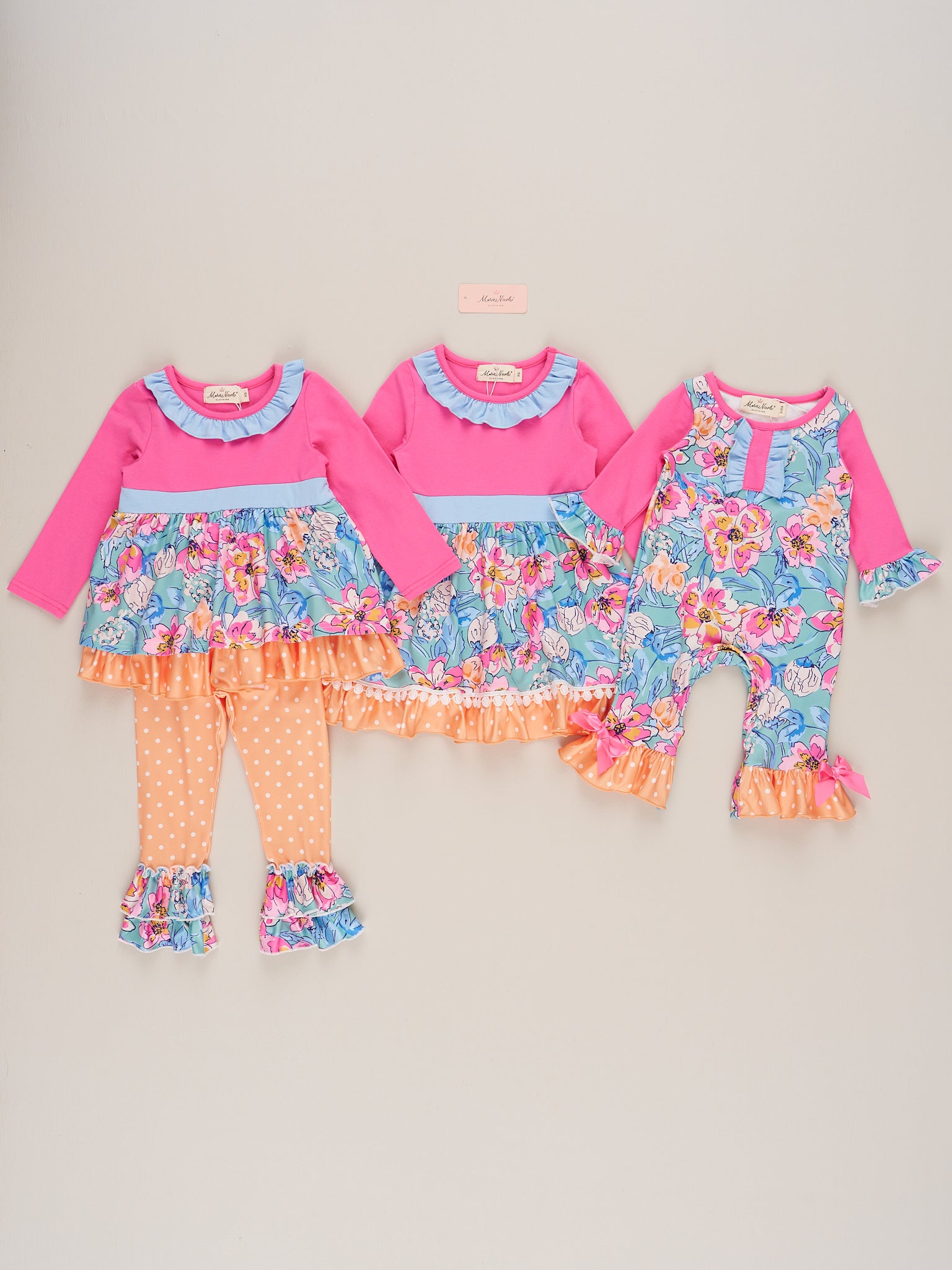 The Floral Daydream Ruffle Outfit is a soft and dreamy choice perfect for sunny days and special moments. Featuring a delicate floral print and finished with gentle ruffle details, this outfit from Marie Nicole Clothing blends timeless charm with lightweight comfort. Ideal for playdates, family gatherings, or twirling through any day she wants to feel like a daydream.