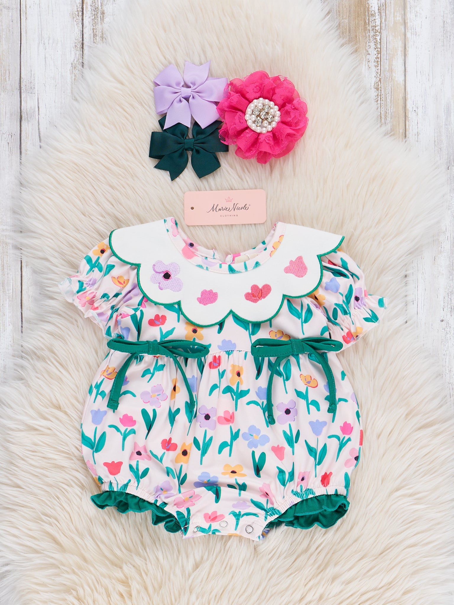 Let your little one bloom with the Flower Picking Embroidered Ruffle Bubble from Marie Nicole Clothing. This girls bubblr features a charming floral print and green bow accents and trim, along with a scallop collar adorned with embroidered flowers. Shop this sweet sister set.