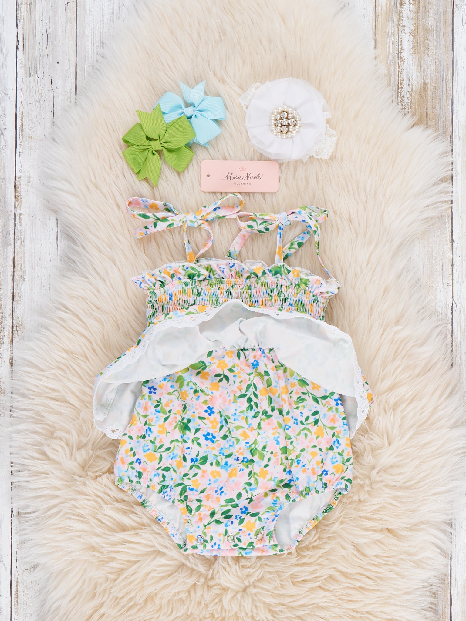 The Flowerfield Twirl Smocked Ruffle Bubble by Marie Nicole Clothing features a stretchy smocked bodice with adjustable shoulder ties and a layered peplum for extra flounce and charm. Soft bubble bottoms with elastic leg openings keep baby comfy and secure for crawling, toddling, and twirling. Delicate floral details and sweet trim make this bubble perfect for sunny outings, playdates, and picture-ready moments.