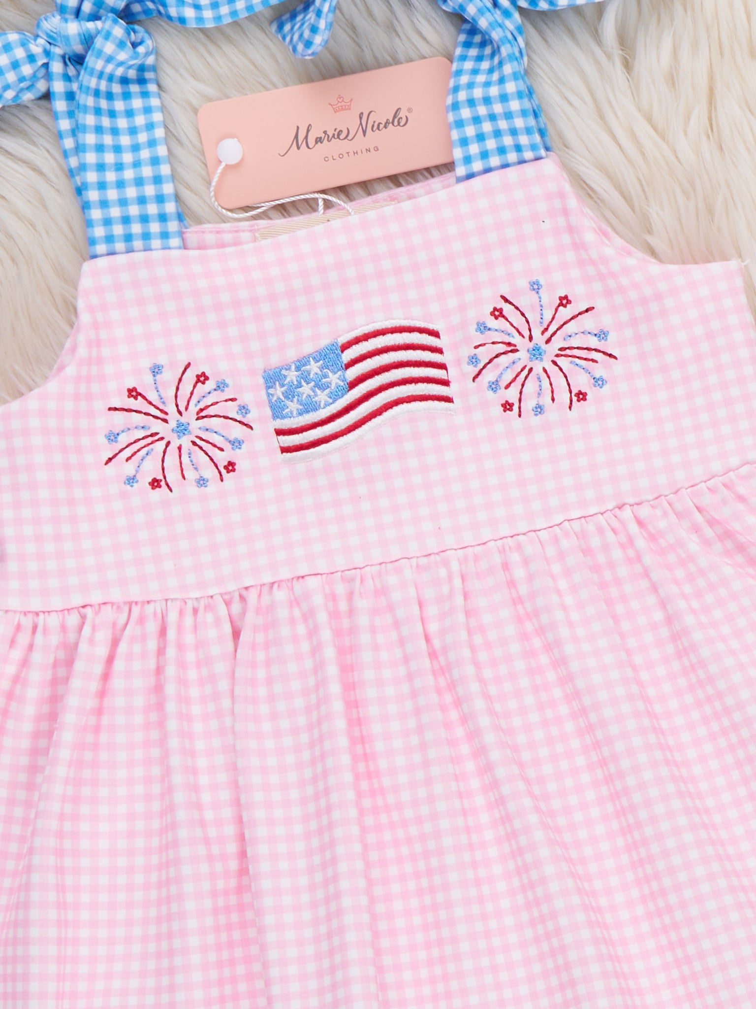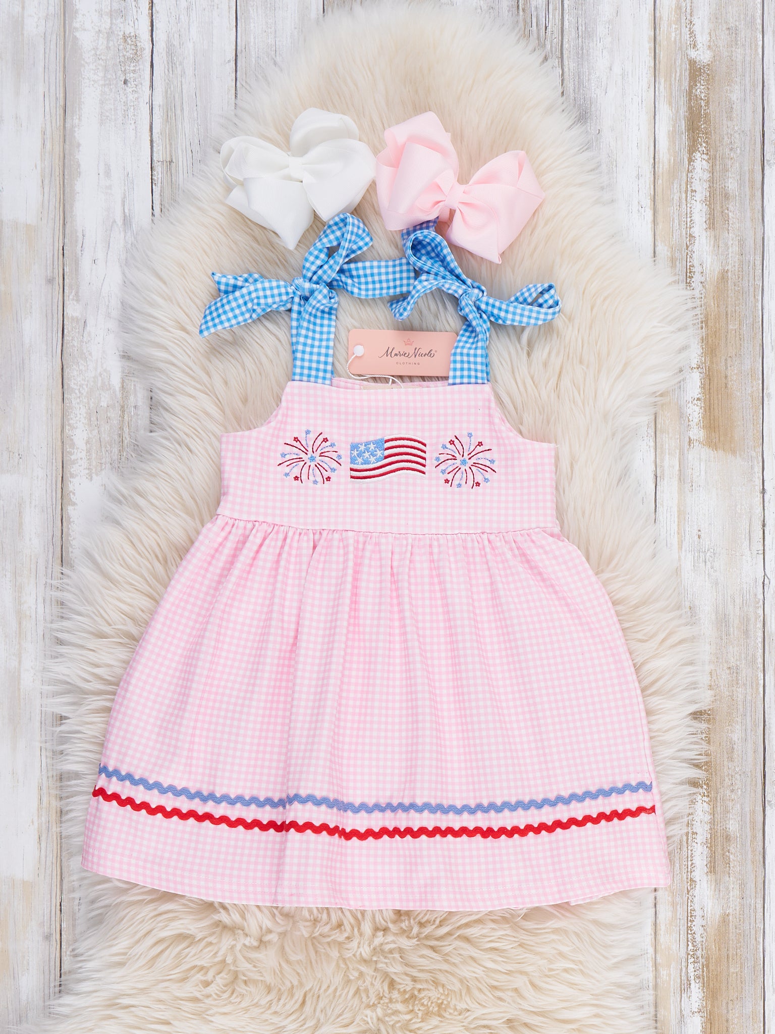 The Freedom Sparkles Embroidered Dress by Marie Nicole Clothing celebrates patriotic charm with its delicate flag embroidery and playful ribbon-tie straps. A scalloped hem adds an extra touch of fun, while the soft, breathable fabric ensures comfort all day long. Perfect for celebrations, parades, or family gatherings, this dress is ready for every sparkling moment.