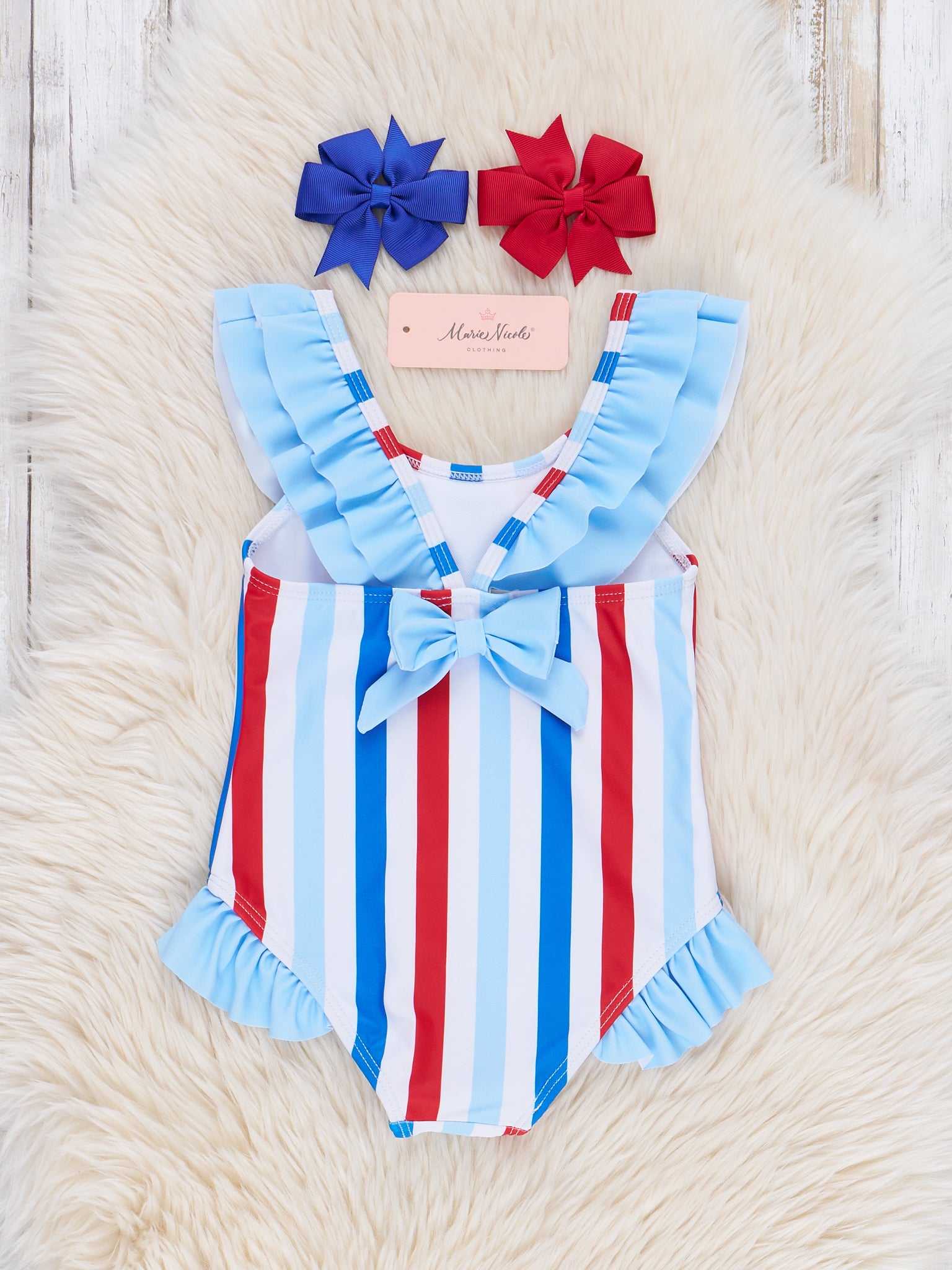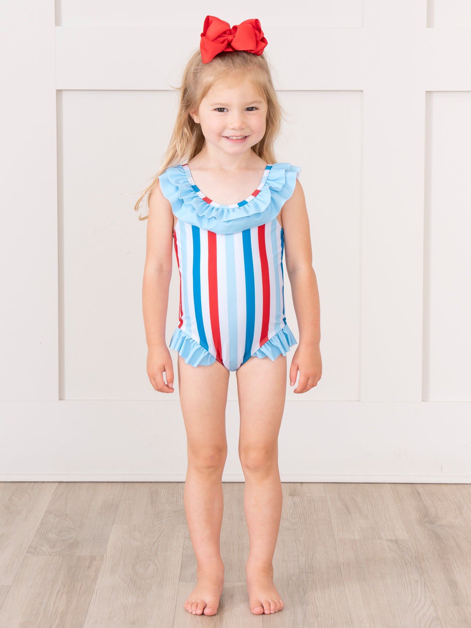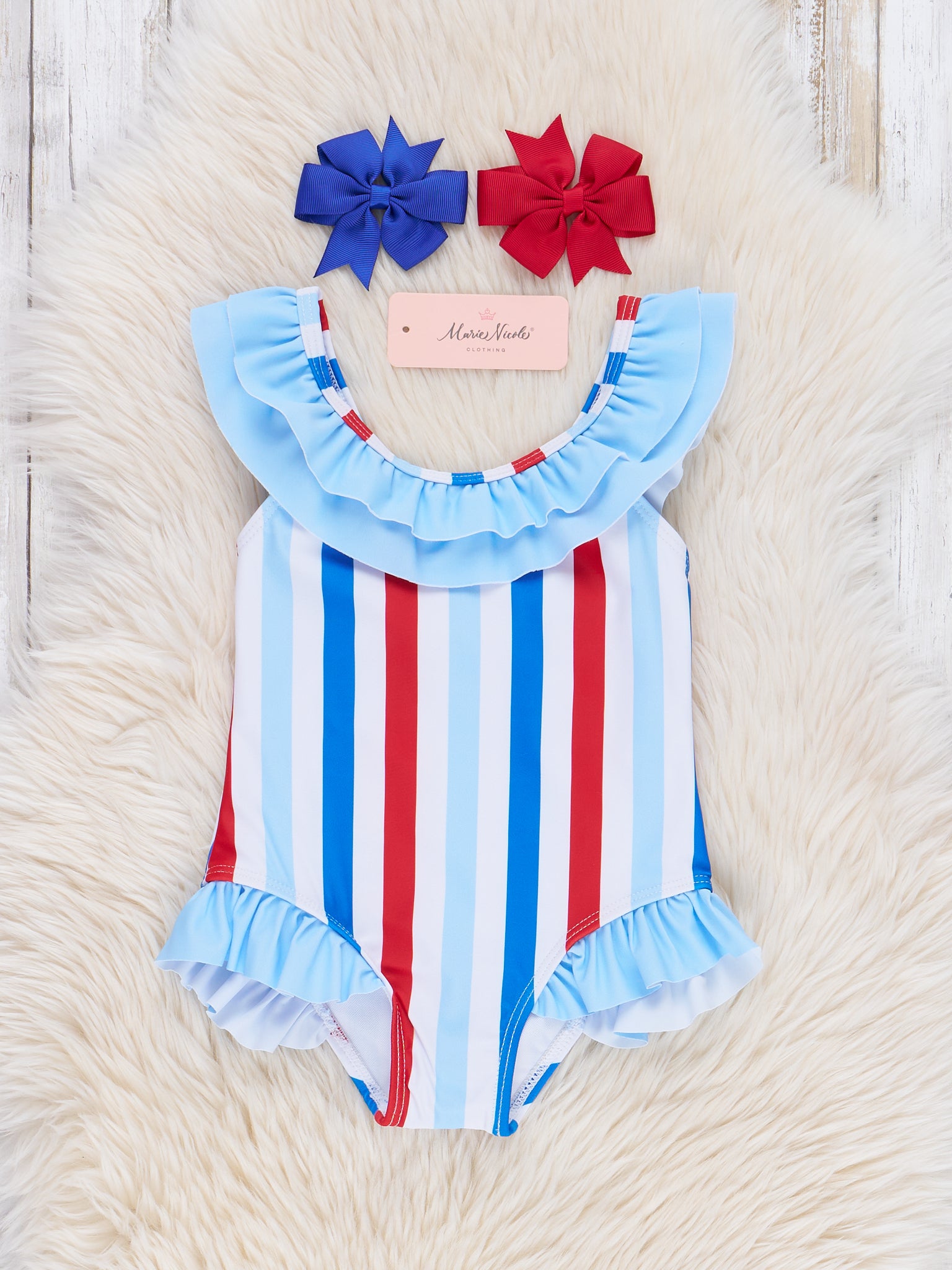 Get ready to make a splash in our Freedom Stripes Ruffle Swimsuit! This girls swimsuit features patriotic red, white, and blue vertical stripes, perfect for showing off your love for your country. The light blue ruffle trim at the collar and legs adds a playful touch. Complete the sibling set with Marie Nicole Clothing.