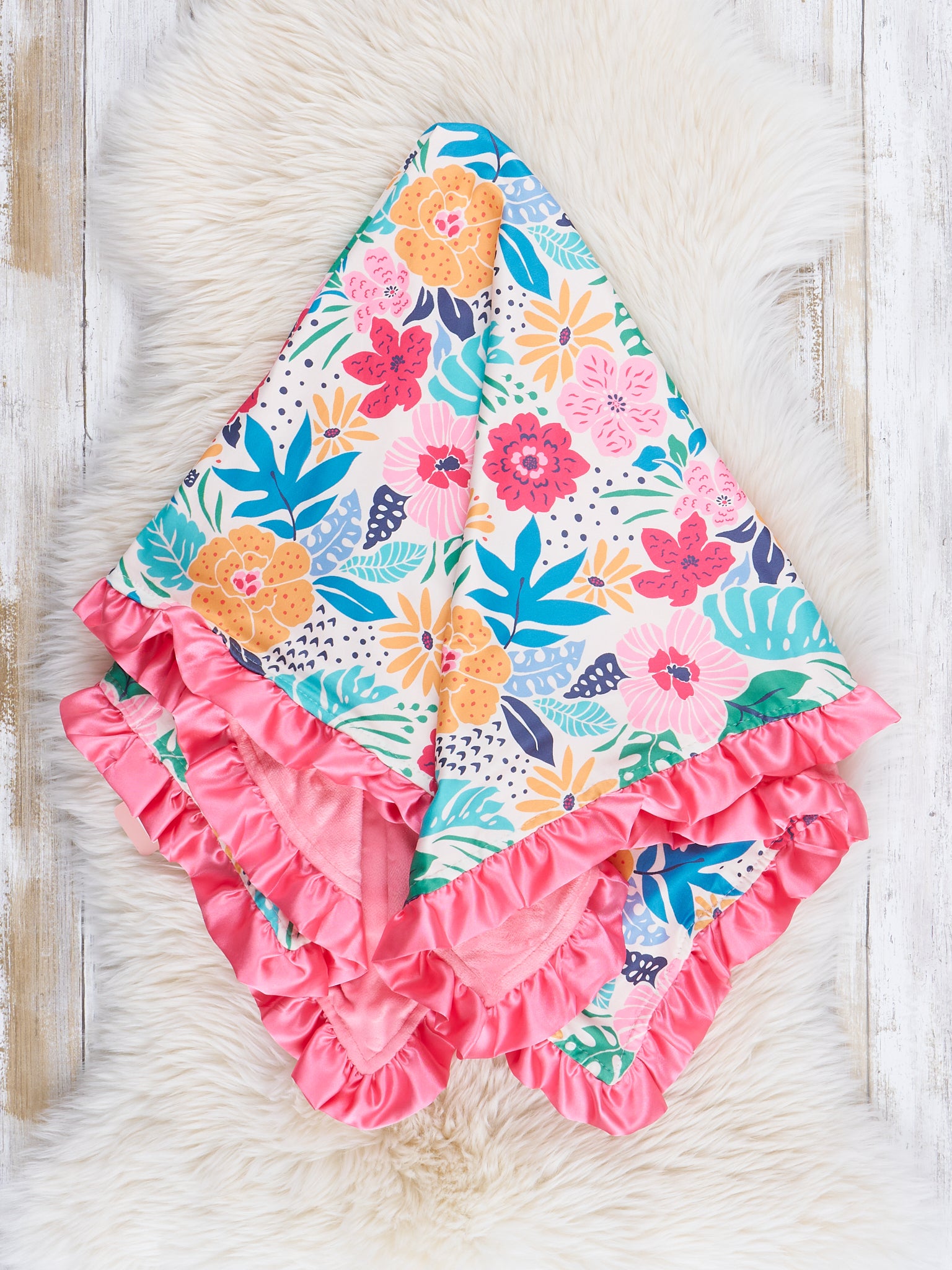Fuchsia Tropical Blossoms Ruffle Minky Blanket