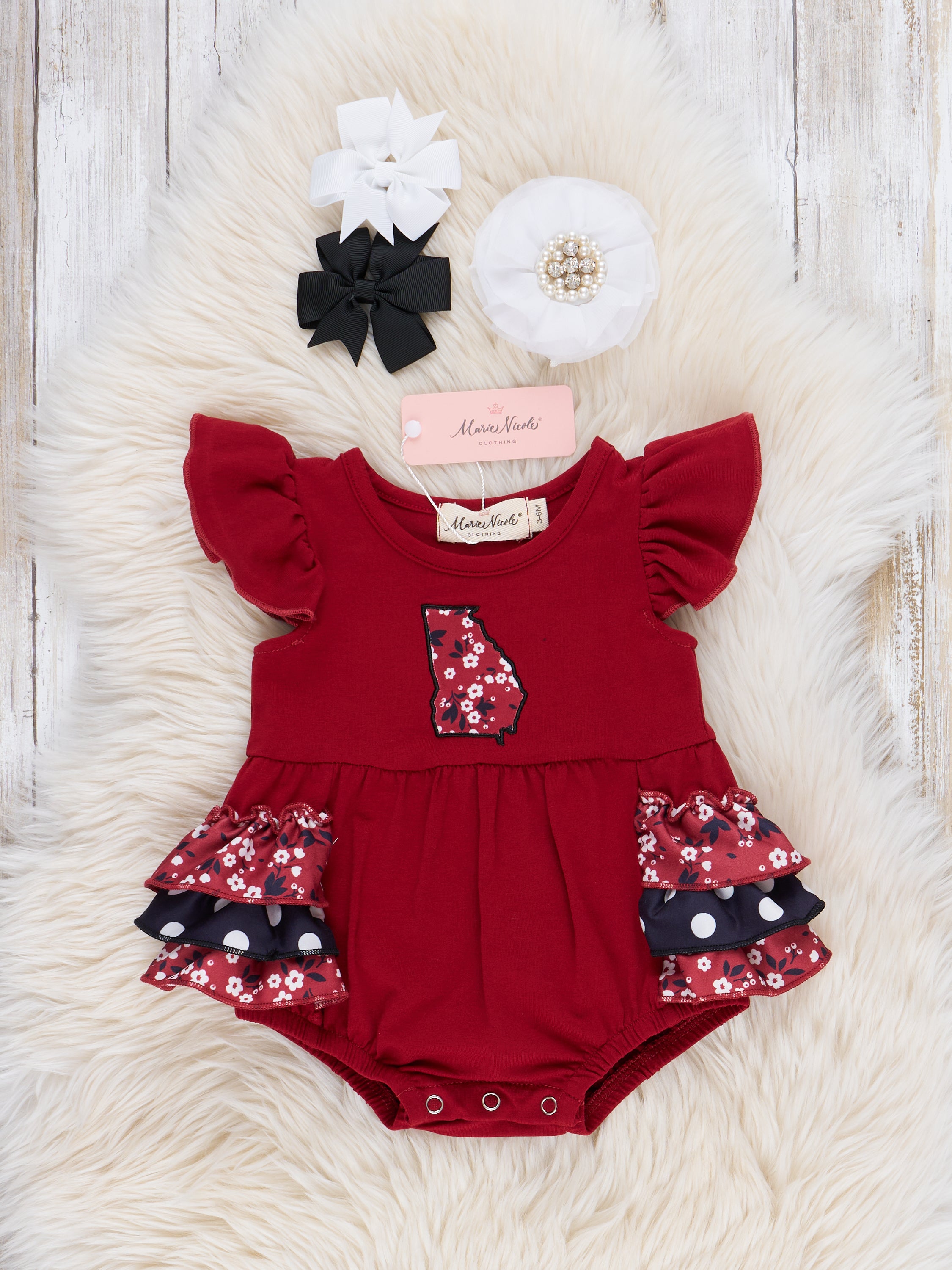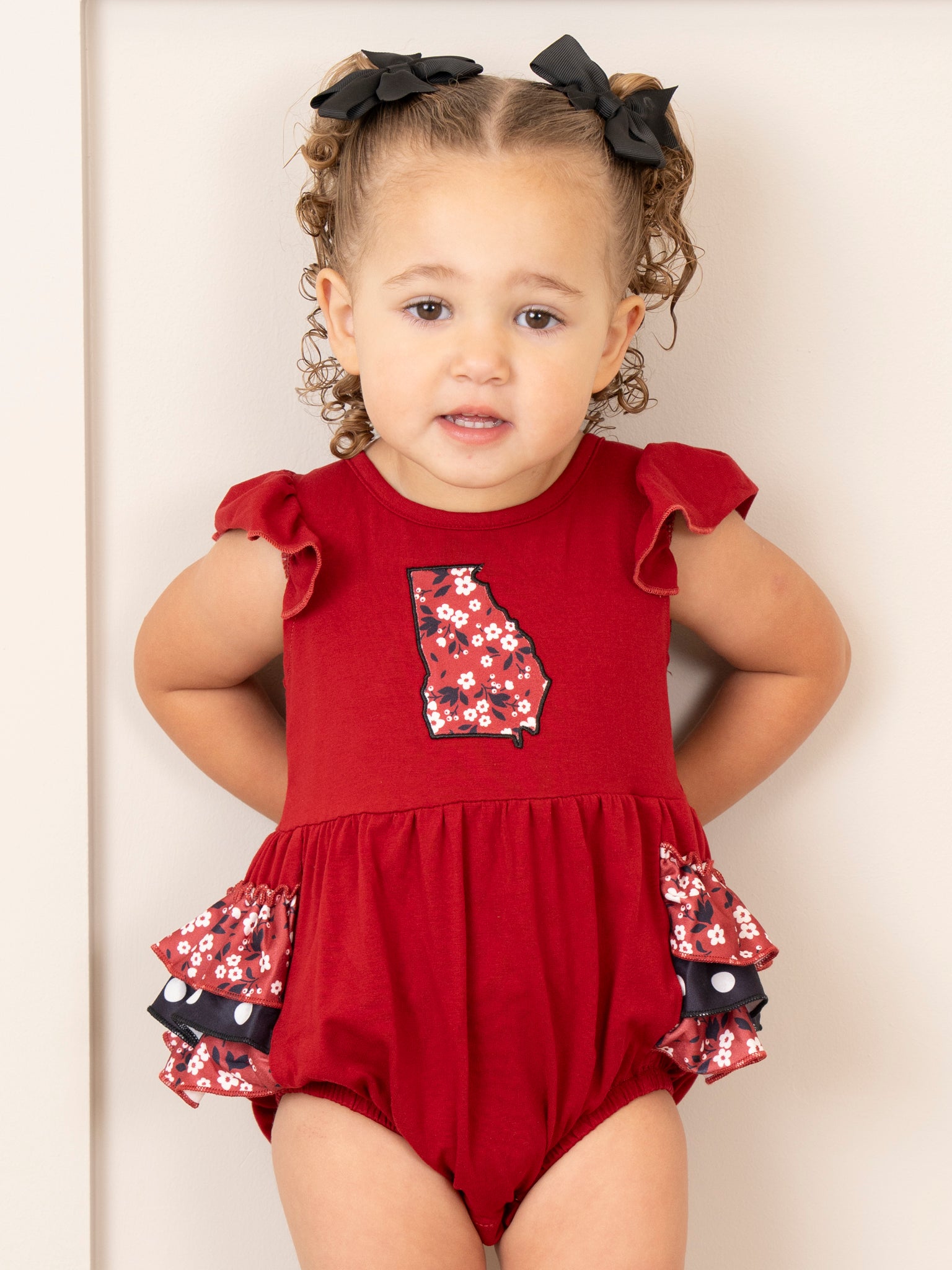 Score an instant win with the 2024 GA Red Sibling Set! Perfect for game-day fun or just a morning playdate, this romper is sure to help the Georgia fans in your fam show off their state pride with delightful Georgia red floral ruffles and embroidered state design.