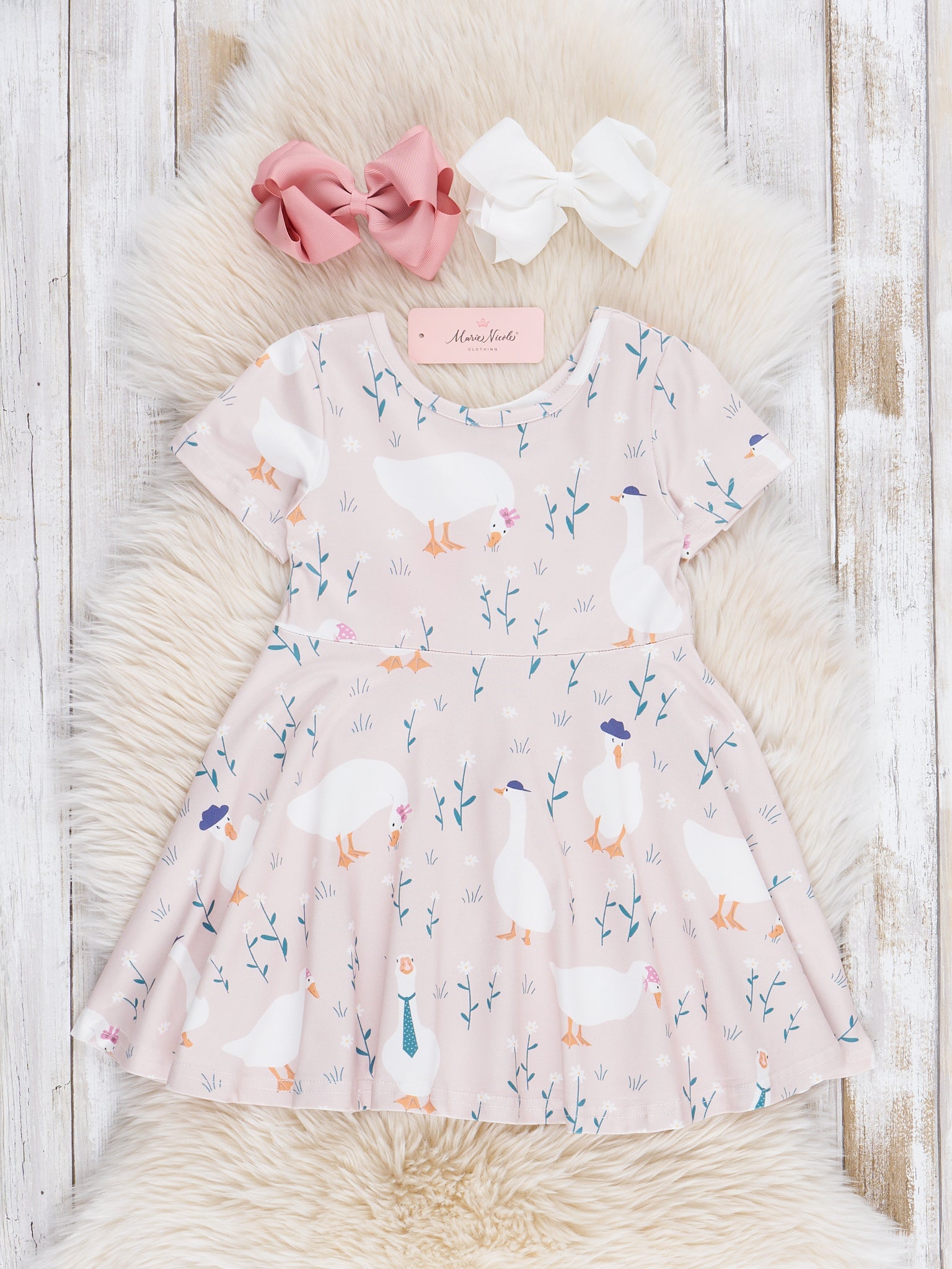Get ready to turn heads with our Geese Swing Dress in Blush! This girls dress features a charming geese print and a classic swing dress silhouette. Perfect for any occasion, this dress is sure to make a statement and have you looking adorable as ever.