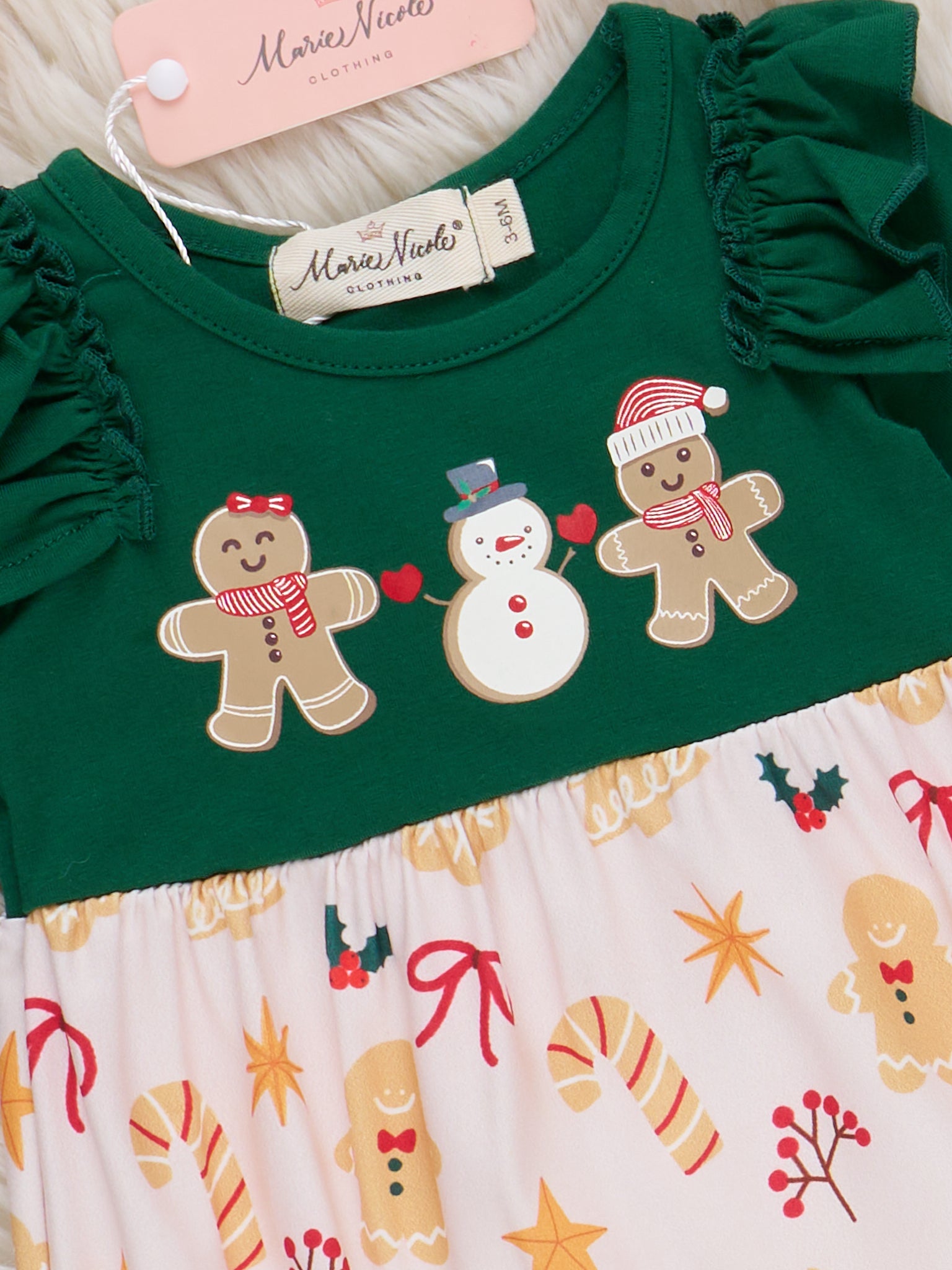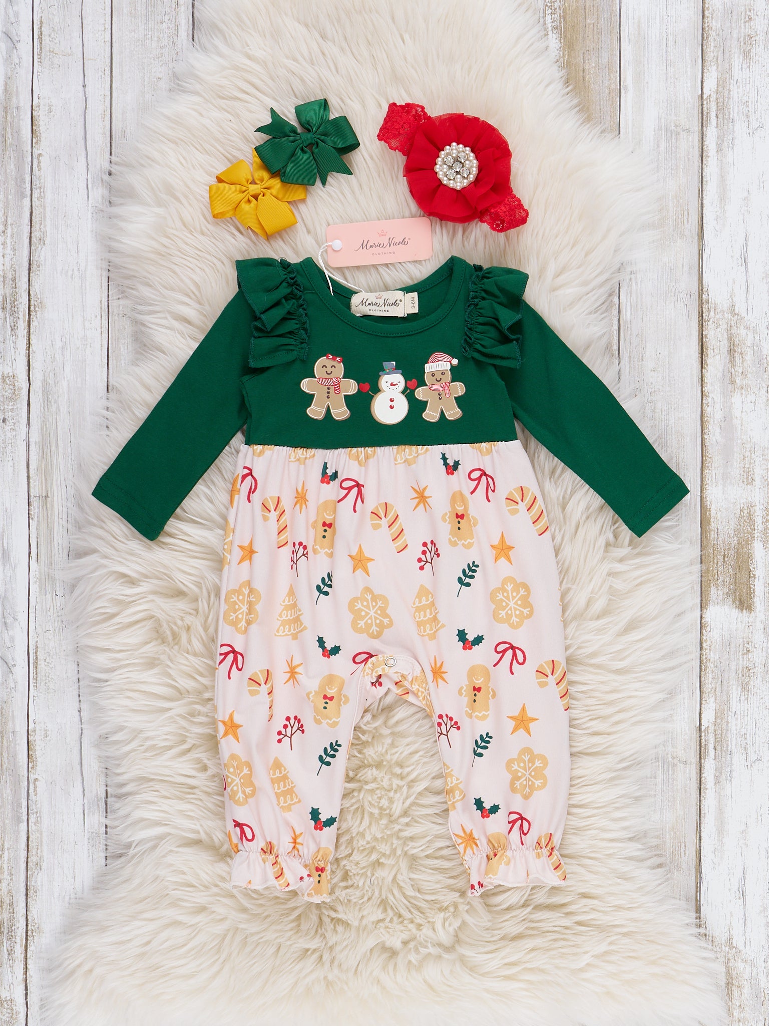 Holiday cheer abounds with this sweet sister set! This Gingerbread Snowmen Building Ruffle Romper by Marie Nicole Clothing features a ruffle top with vinyl print gingerbread & snowman cookies, paired with sweet Christmas print on the bottom.