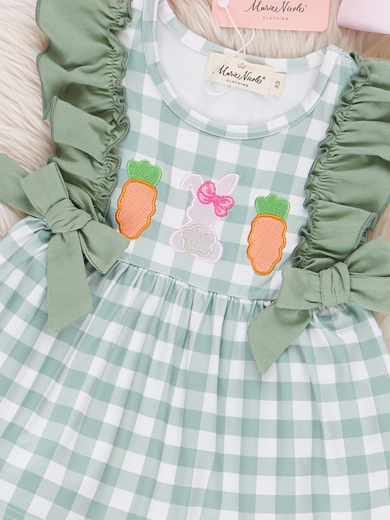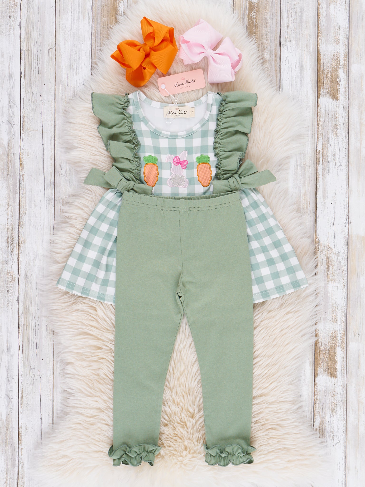 Get ready for Easter with our Gingham Carrot Patch Embroidered Outfit by Marie Nicole Clothing! This playful girls outfit features an adorable embroidered carrots and bunny design, perfect for the holiday. The ruffles & bows detail adds a touch of charm, while the gingham print screams spring along with the ruffle leggings.