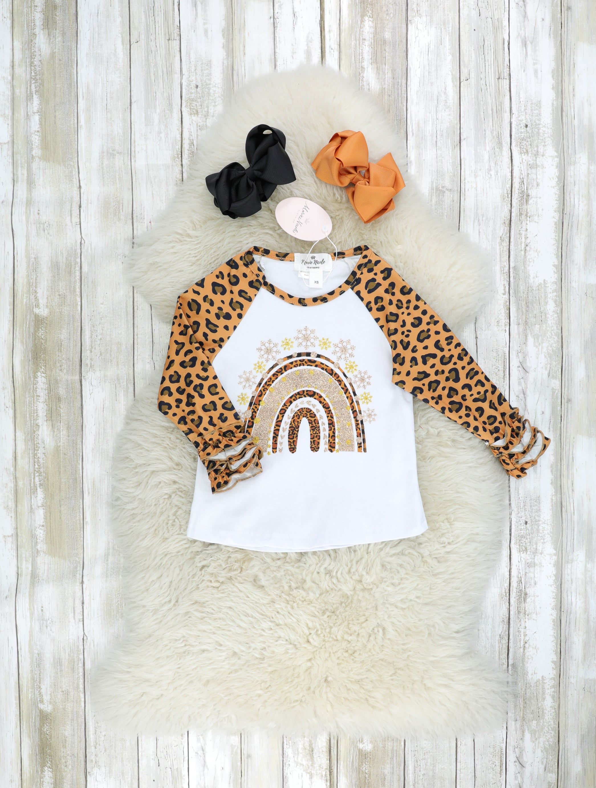 This precious shirt is the gold at the end of the rainbow! This shirt features leopard raglan sleeves, icing ruffles, & a bright gold rainbow detail.