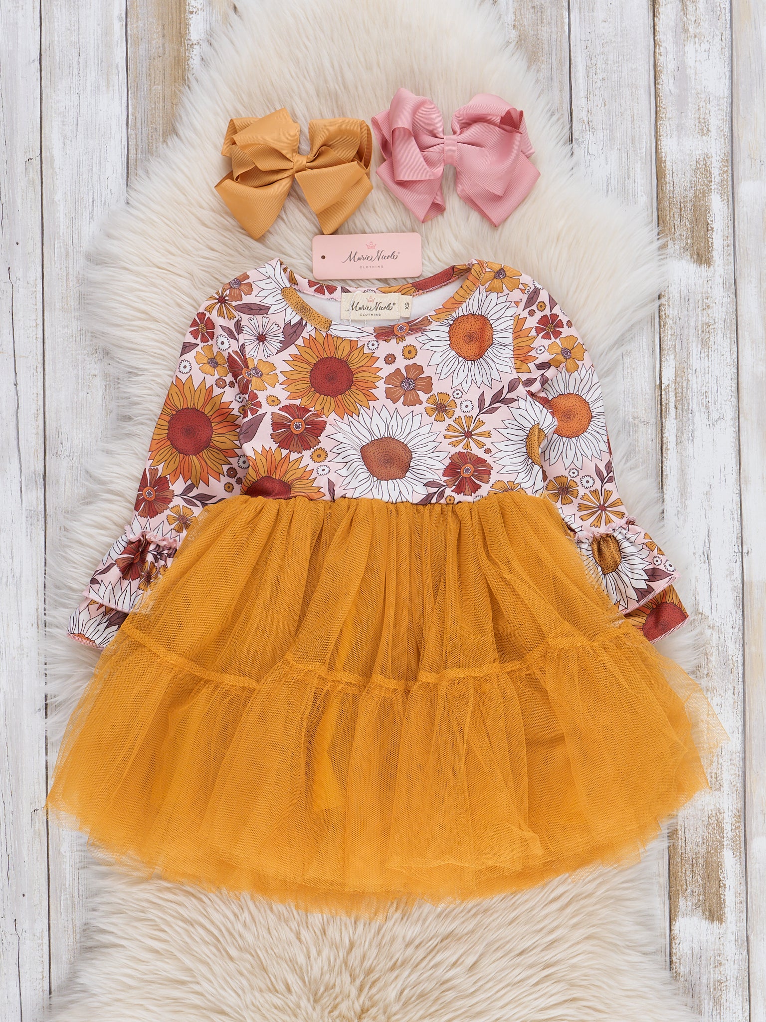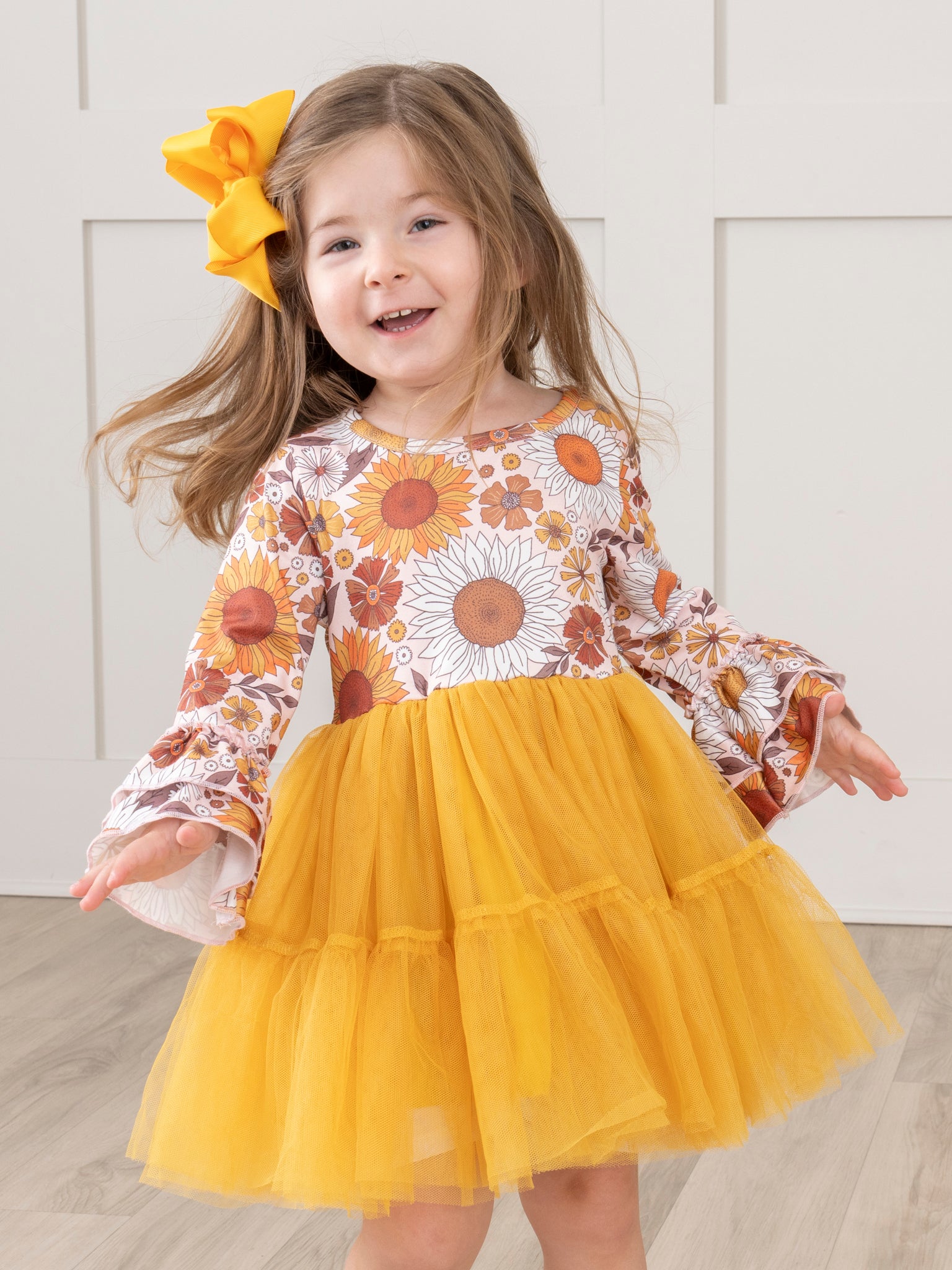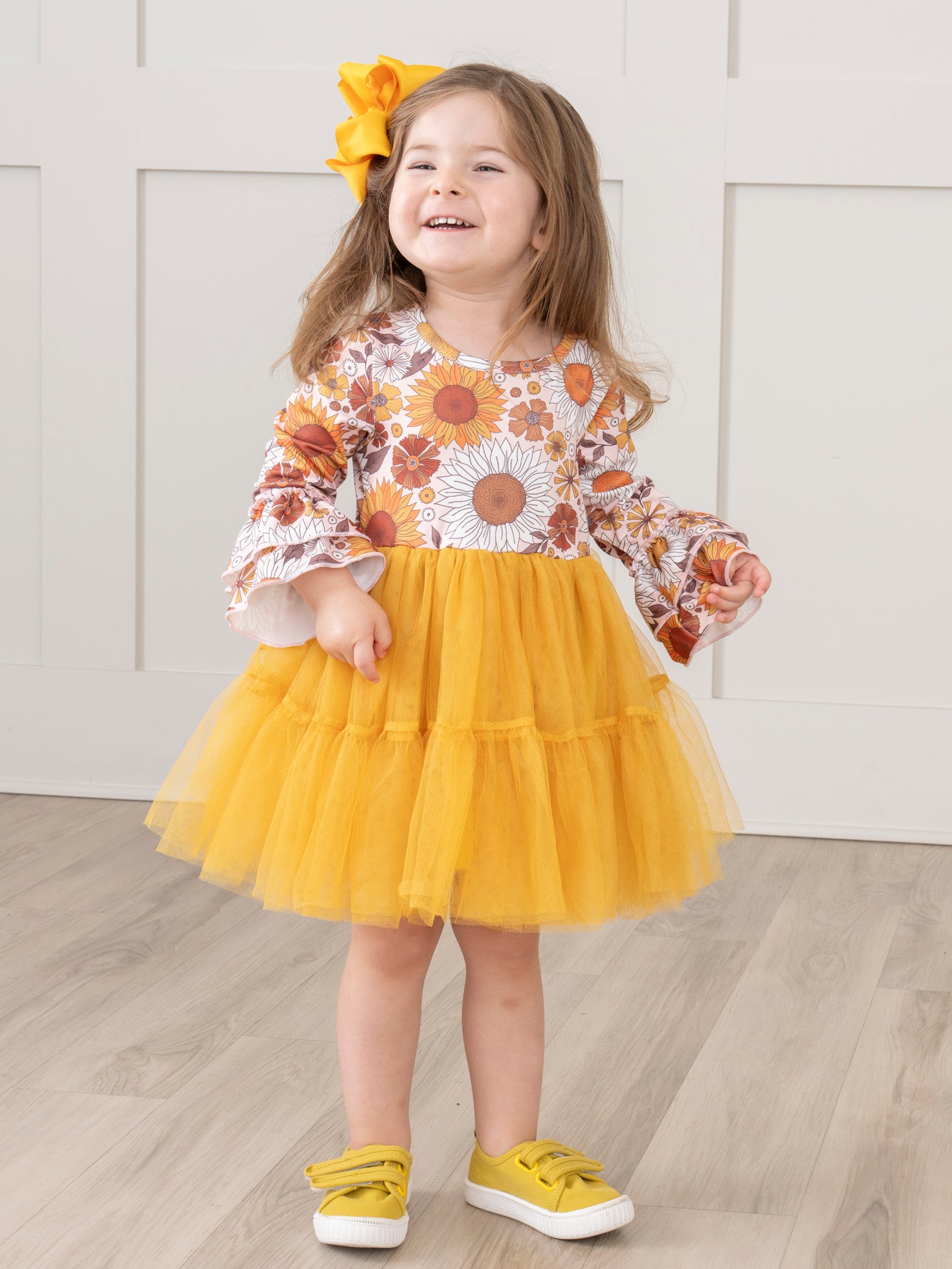 Say hello to autumn with our Golden Sunflowers Bell Sleeve Tulle Dress for girls! This unique dress features a sunflower bodice and tiered bell sleeves, paired with a delicate tiered tulle skirt. Perfect for twirling and adding a touch of sunshine to any occasion.