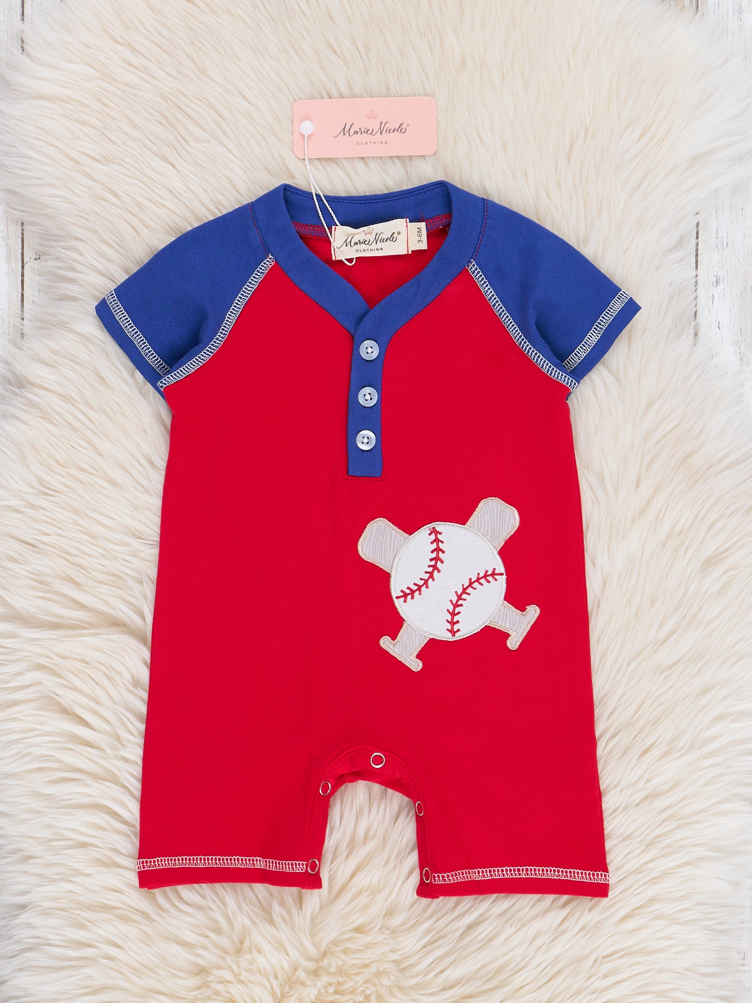 Get ready for a home run in this Marie Nicole Clothing romper. The red bodice and embroidered baseball details coordinates perfectly with the blue raglan sleeves & henley design for a grand slam look. Don't forget to check out the sibling set!