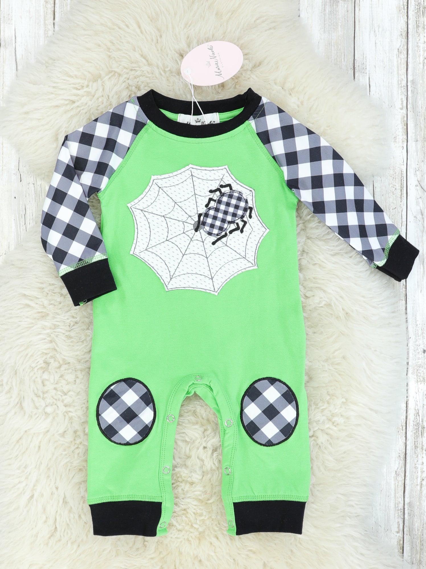 A darling brother set for this Halloween! This green romper features gingham raglan sleeves & knee pads with a spider appliqué.