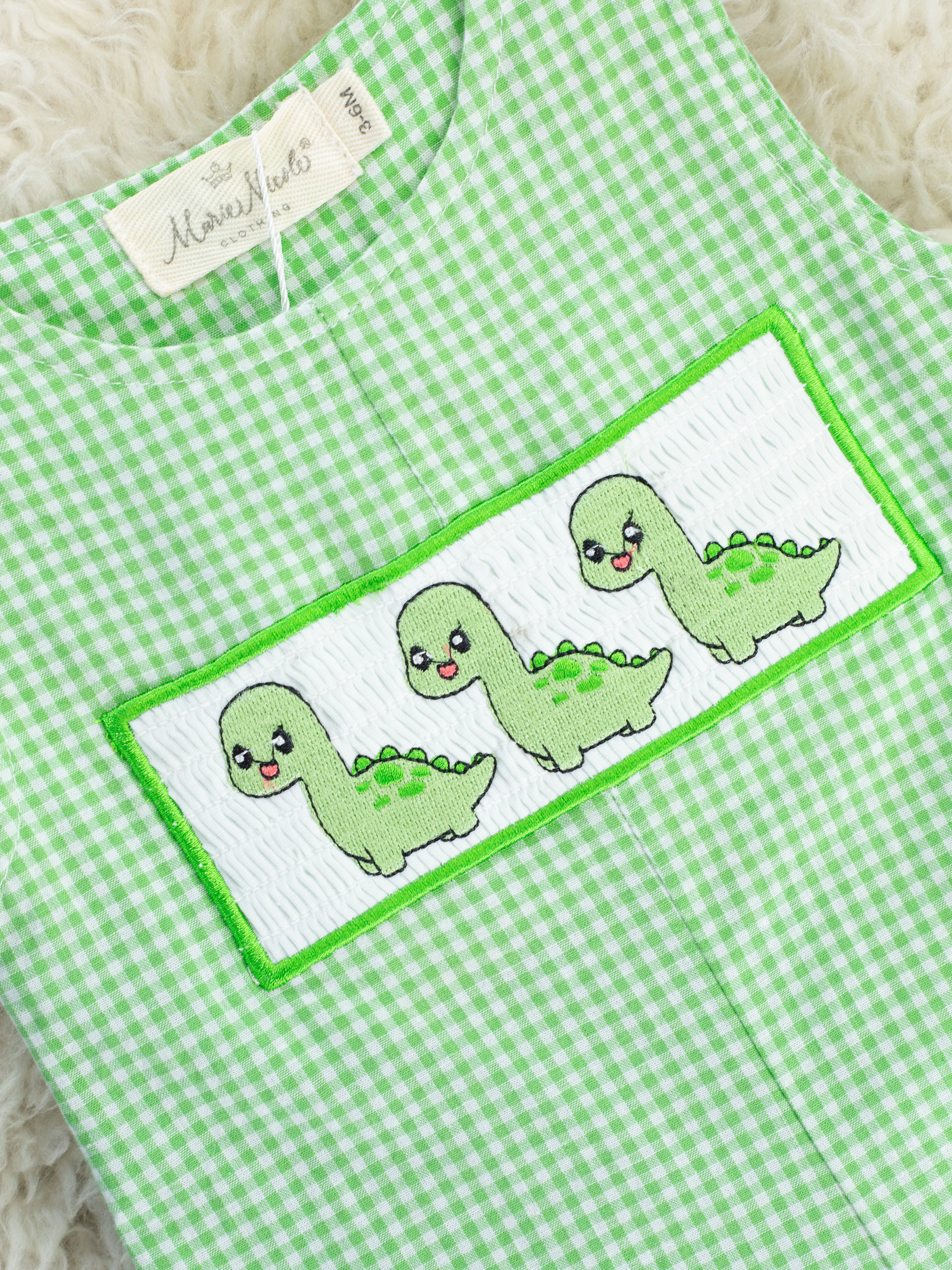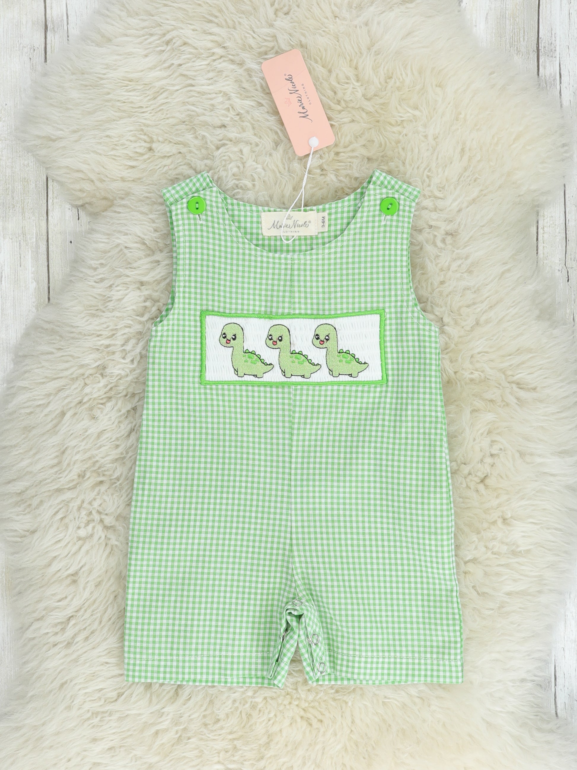 Watch all your kiddos SAUR in this adorable sibling set! This green johnny features smocking, embroidered dinosaurs, & functioning buttons on the shoulders.