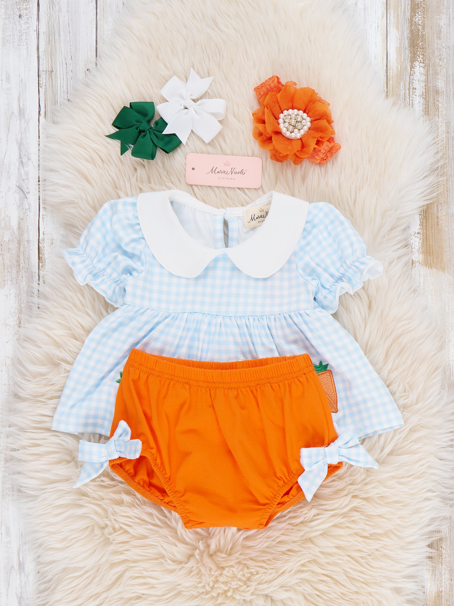 Hop & Harvest Embroidered Bloomers Outfit by Marie Nicole Clothing features an embroidered top with bunny and carrot appliques, scalloped collar, and puff sleeves, paired with coordinating bloomers finished with side bows. The playful mix of festive motifs and comfortable design makes this set ideal for spring occasions, family gatherings, or cheerful everyday wear. It offers a sweet and practical look for active little ones.