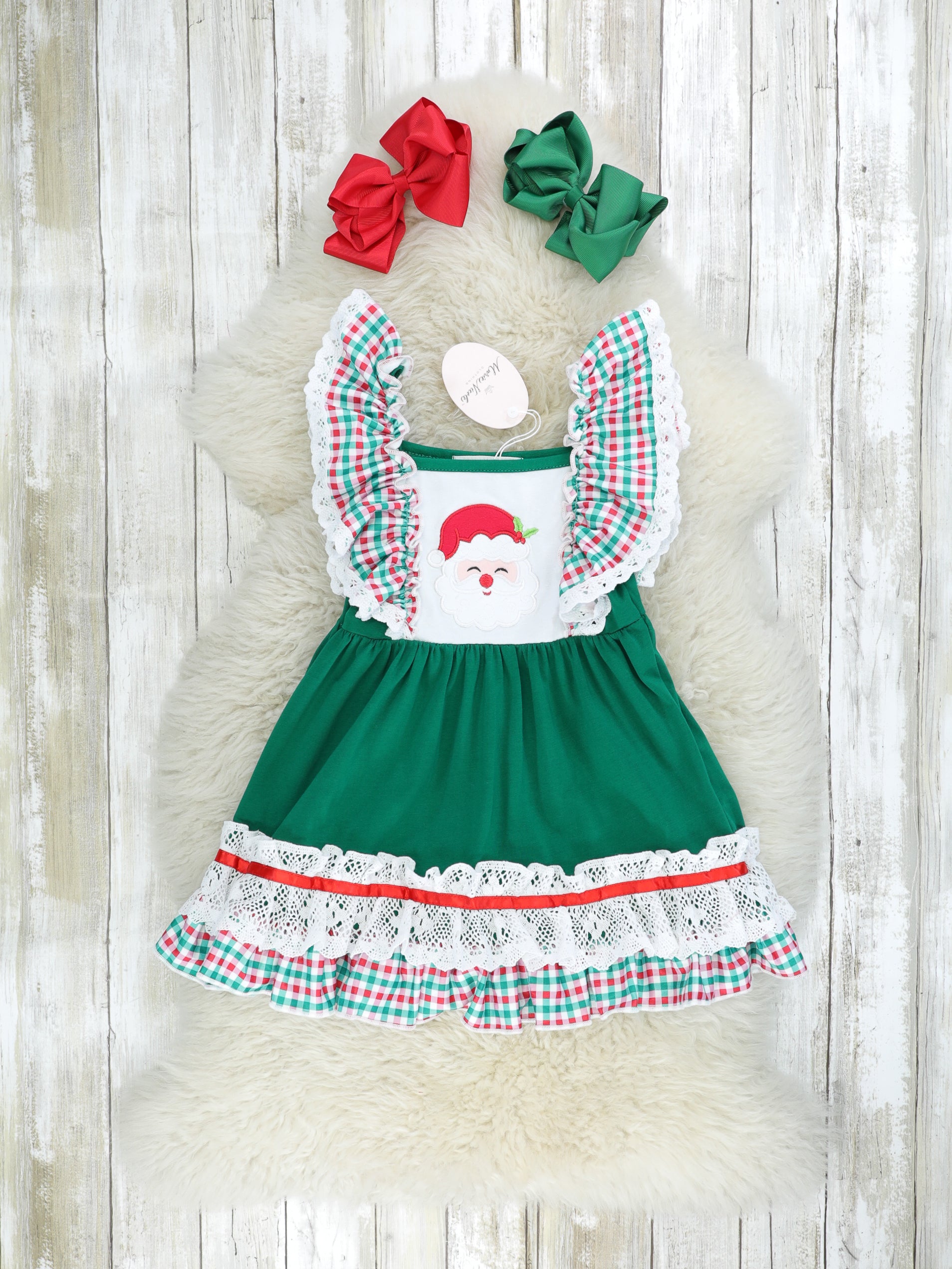 You're just in the Saint Nick of time to grab this precious sister set! This hunter green dress features flutter sleeves, lace trim, ruffle details, & a darling Santa appliqué.
