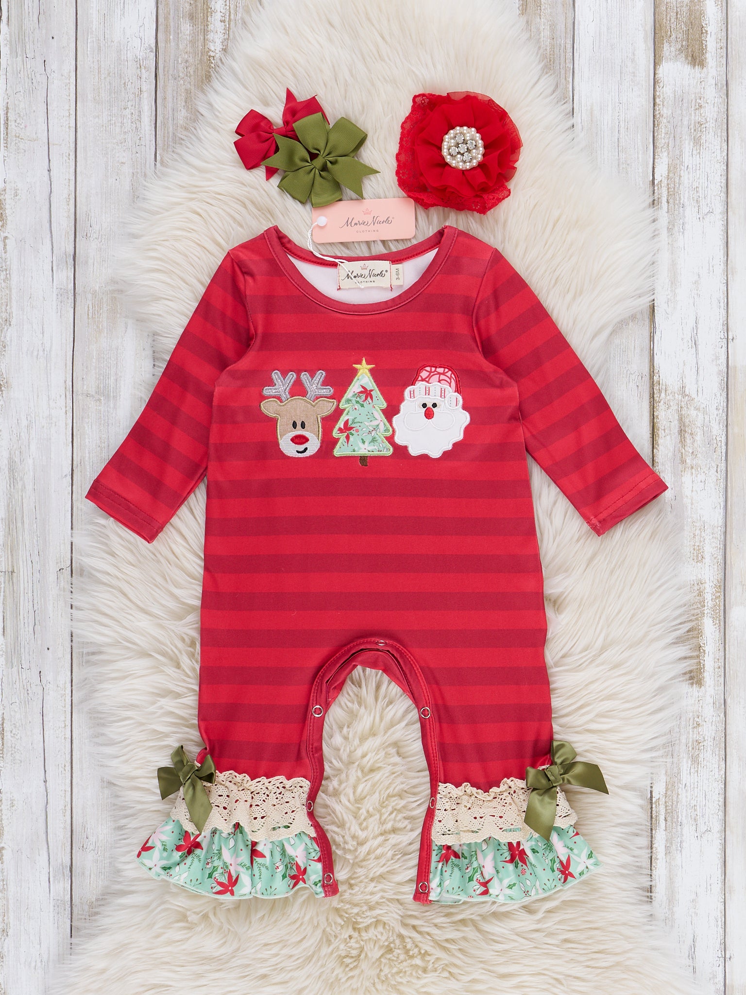 Celebrate the season in style with our Jolly Reindeer Striped Ruffle Romper by Marie Nicole Clothing, featuring festive reindeer, Christmas tree, and Santa appliques along with delicate ruffle lace trim at the legs. Designed for comfort and charm, this romper is perfect for holiday gatherings, cozy days at home, and creating cherished Christmas memories.