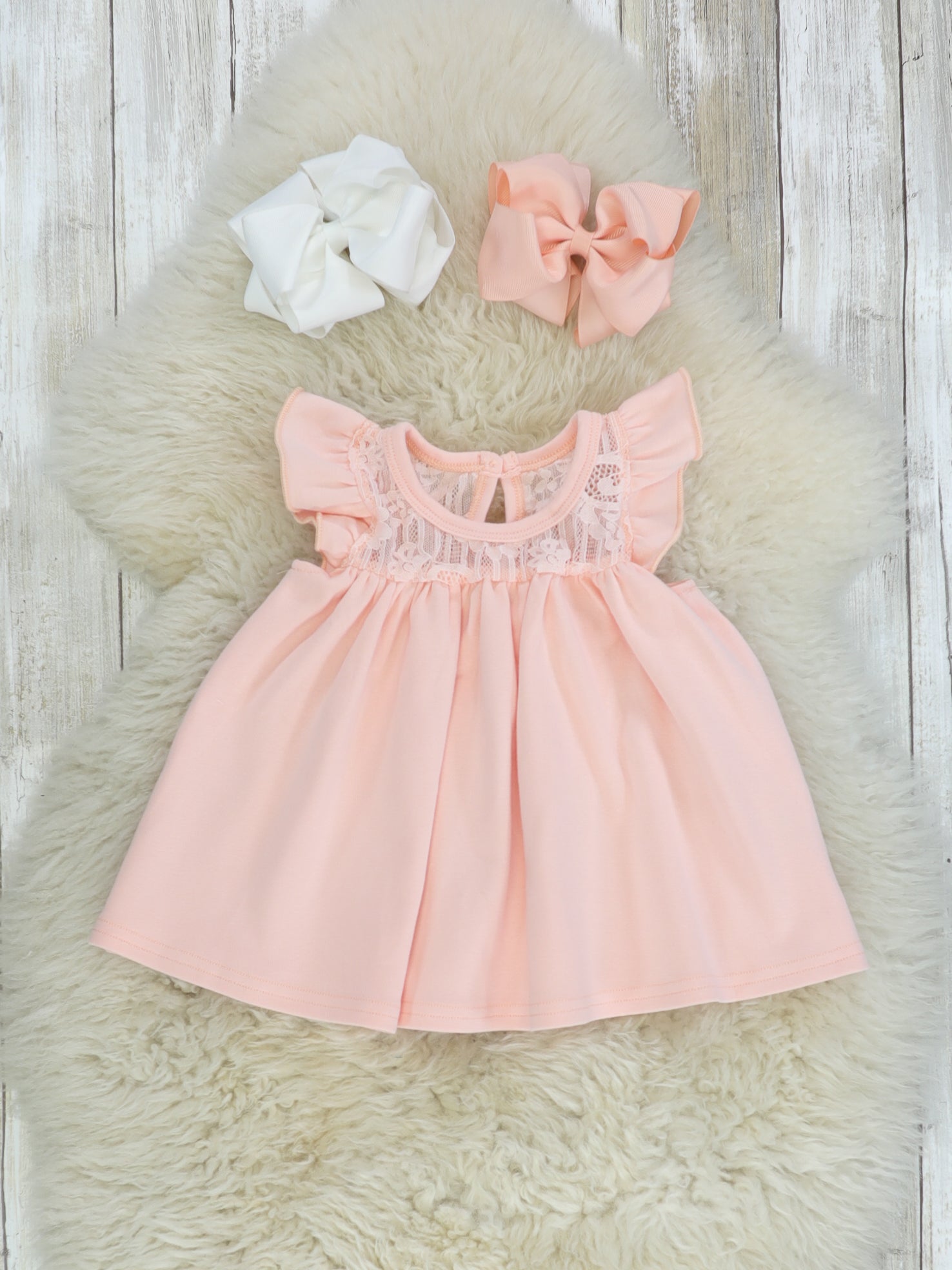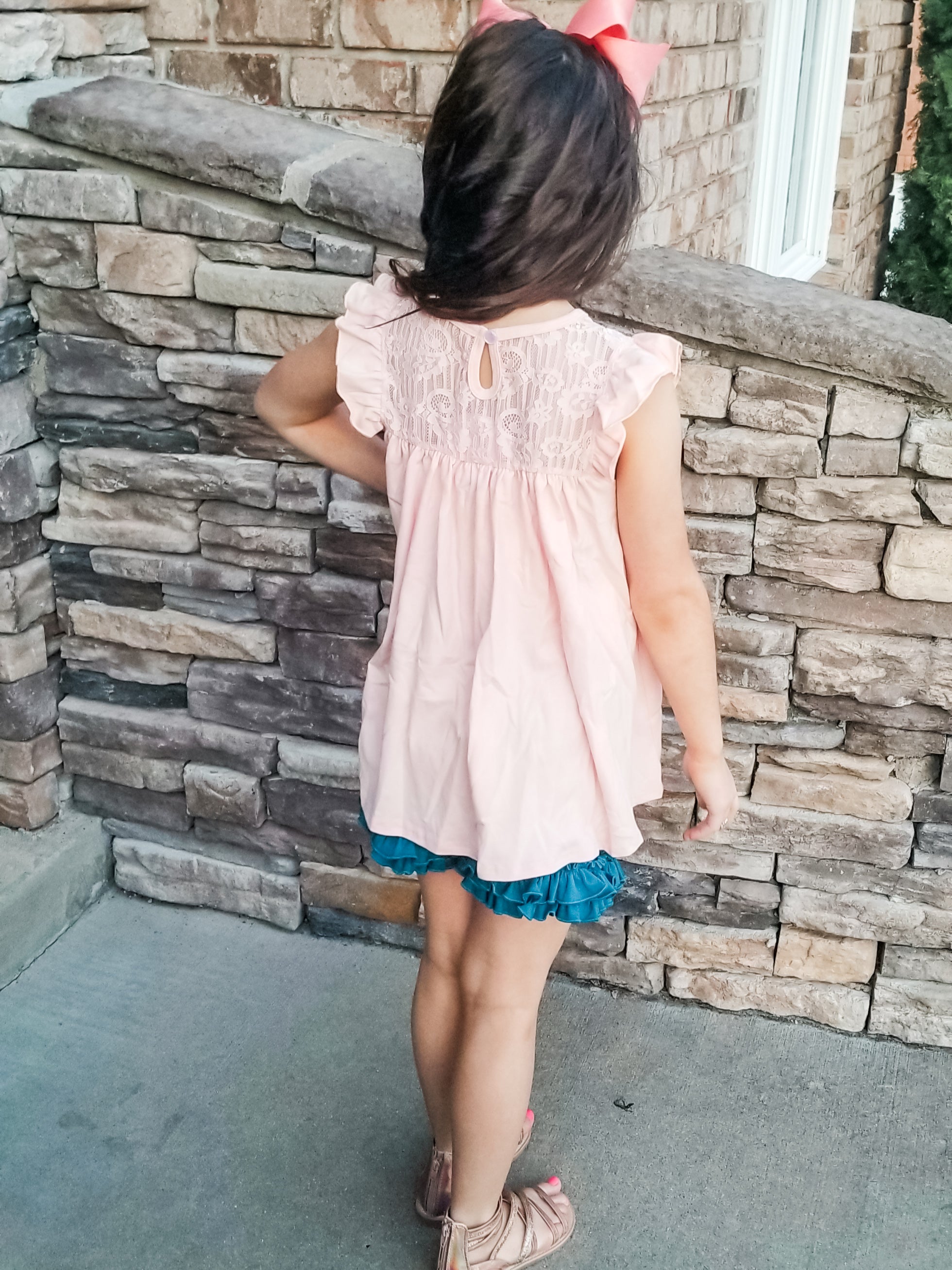 MNC's lace flutter sleeve top in peach! This swing style top features the prettiest lace details and a functional button on the nape of the neck for easy on and off.