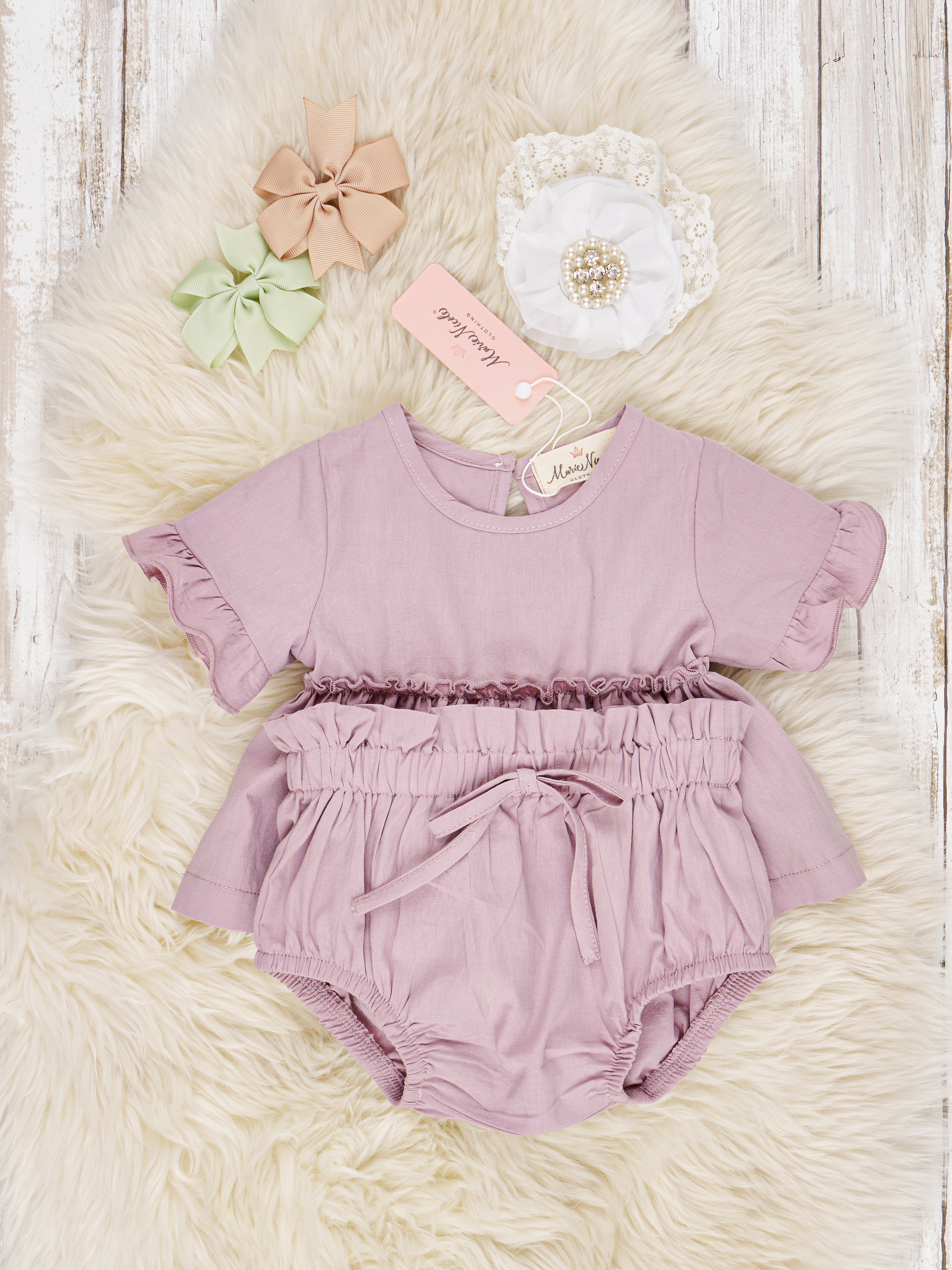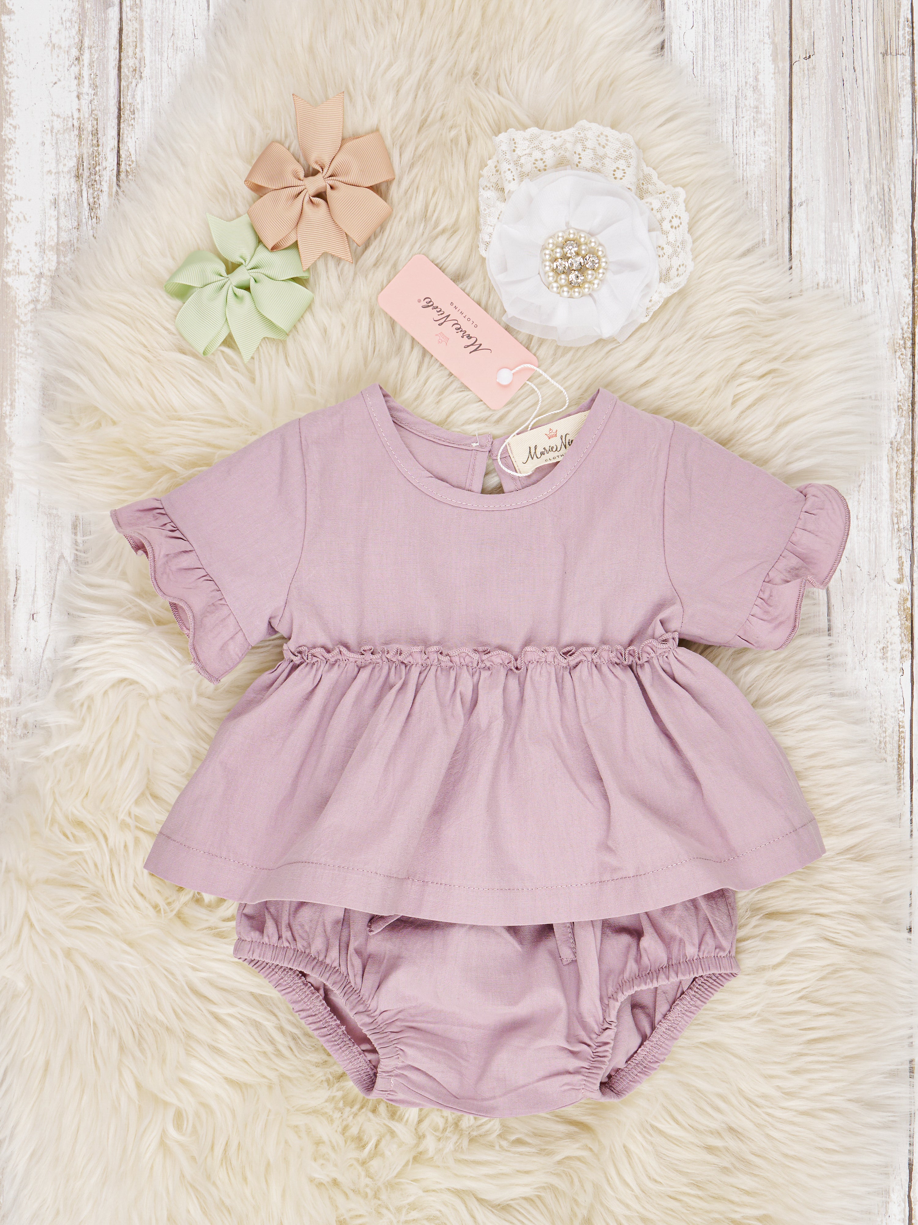 This sassy sister set is the perfect pick for your little ones! Keep them looking cool in the lavender swing top, featuring ruffles and a playful flare. The bloomers feature an elastic waistband for extra comfort!