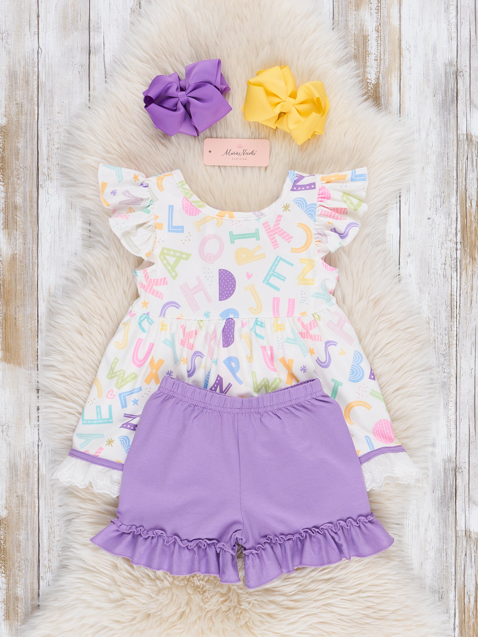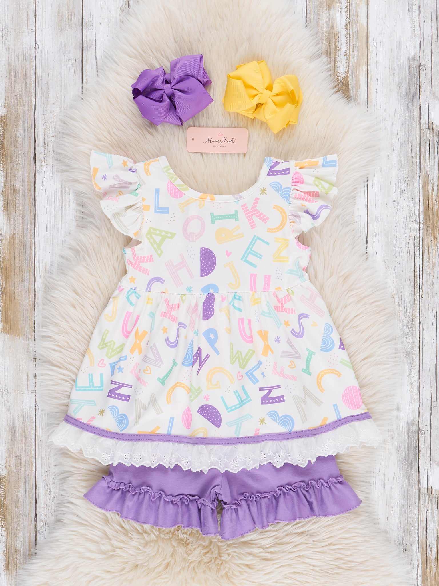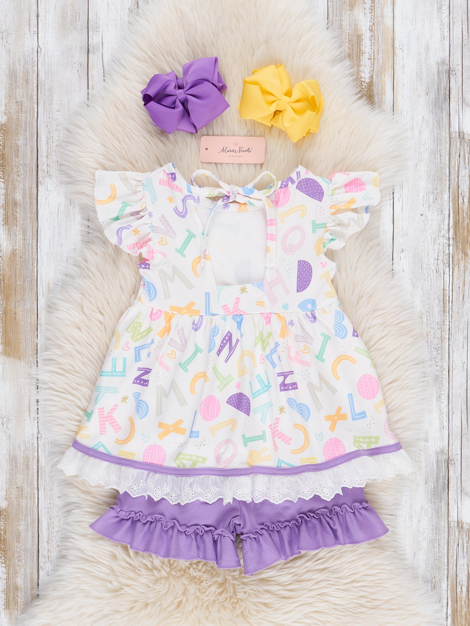 The Learning Letters Lace Hem Outfit is a smart and stylish look that’s perfect for back-to-school fun. Featuring a playful alphabet print and finished with a delicate lace hem, this outfit from Marie Nicole Clothing adds a sweet, classic touch to her everyday wardrobe. Soft, comfy, and easy to move in, it’s ideal for classroom days, storytime, or any moment she’s ready to learn and shine.