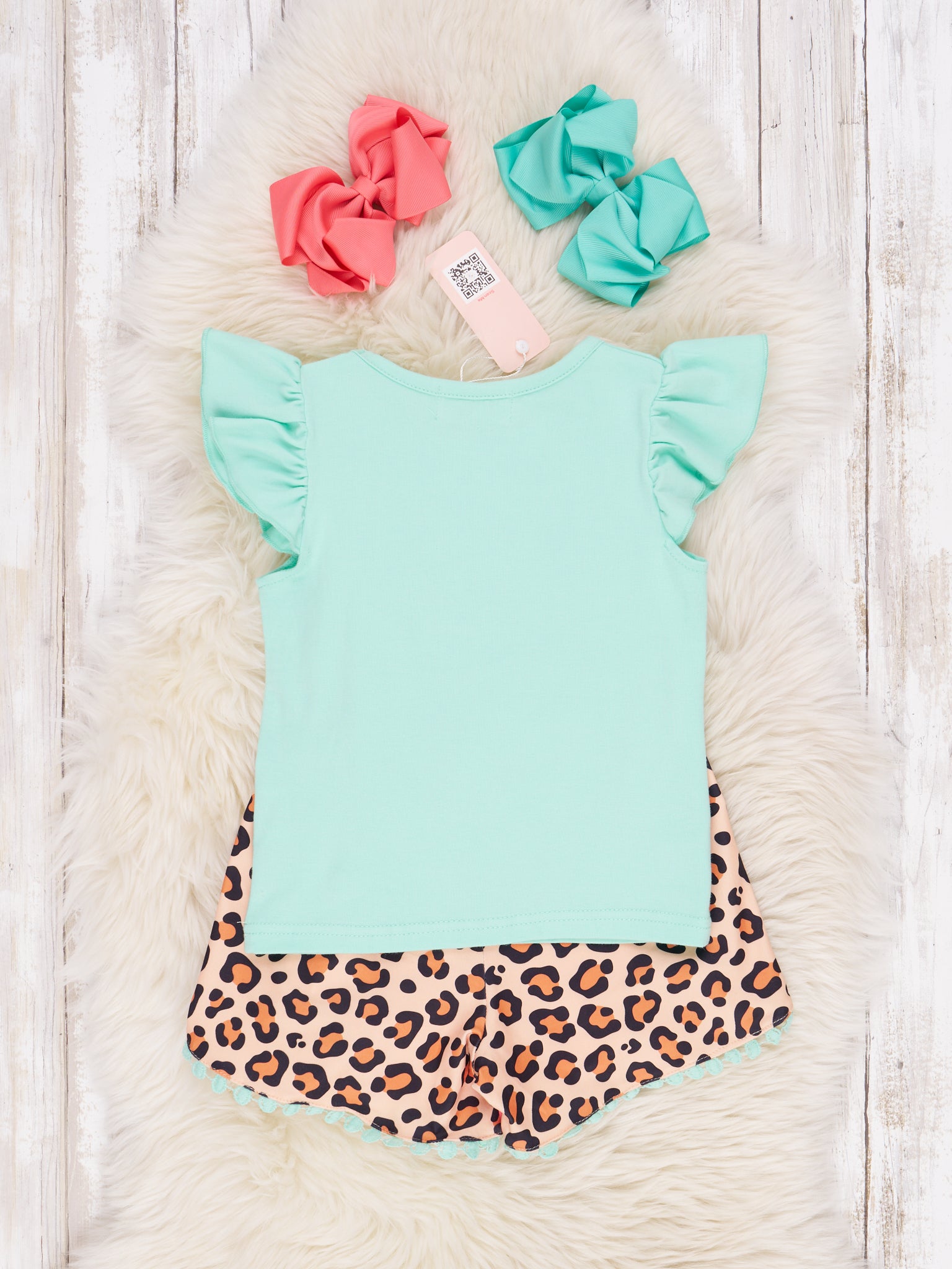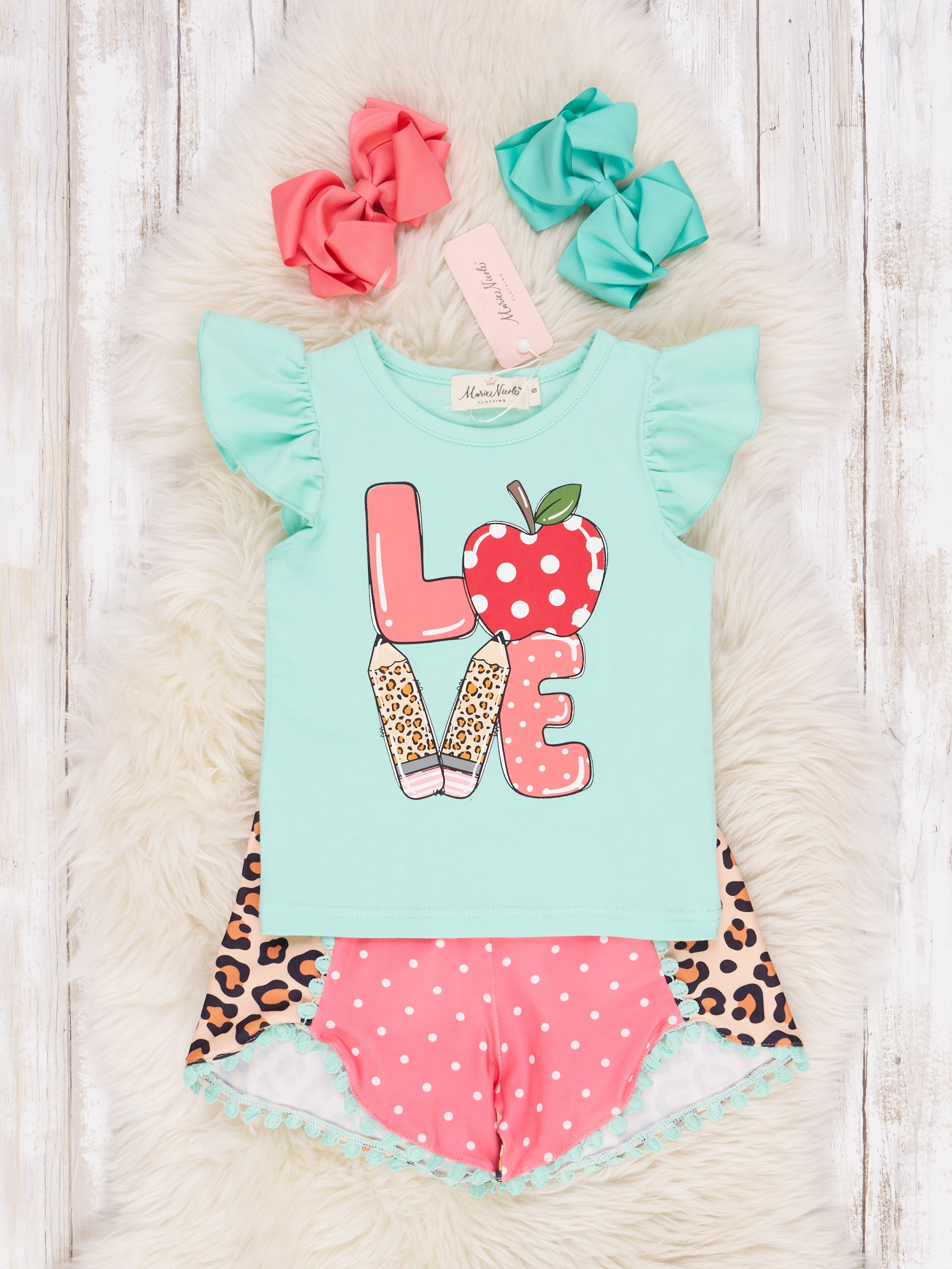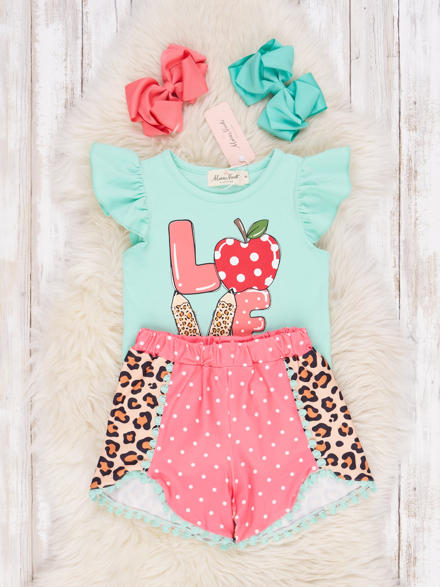 Style your little one in the cutest outfit of the season! This outfit features an awesome mint top, a pencil, apple detail with "LOVE" spelled on it, and spots and leopard print accents. It's perfect for your wild thing! The shorts have an elastic waistband, so you know they'll fit comfortably all day long.