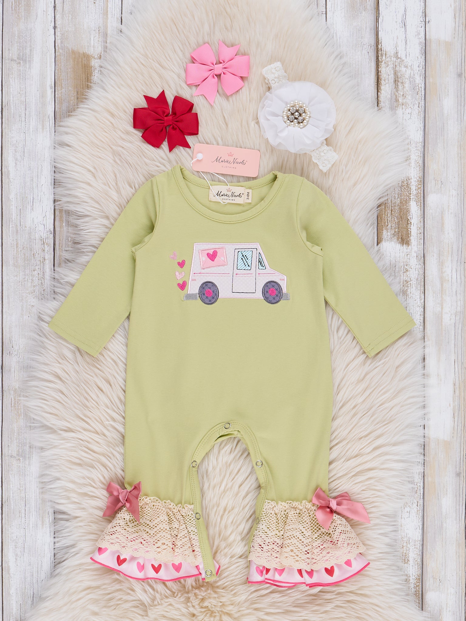 Spread the love with our Lime Embroidered Love Mail Ruffle Romper! Perfect for Valentine's Day, this girls' romper features an embroidered Valentine's mail truck and playful ruffle ankles. Match with the sister set by Marie Nicole Clothing for double the cuteness. XOXO!