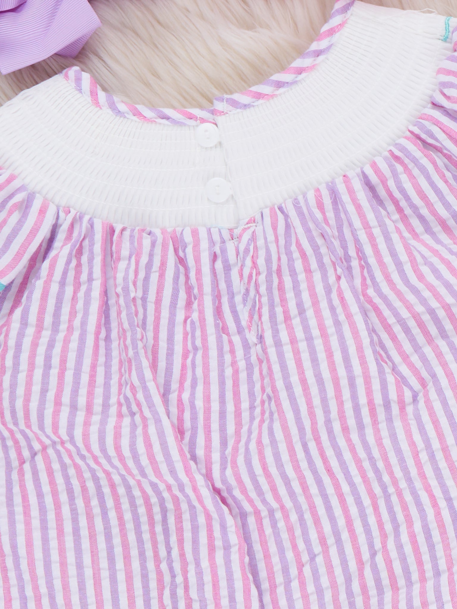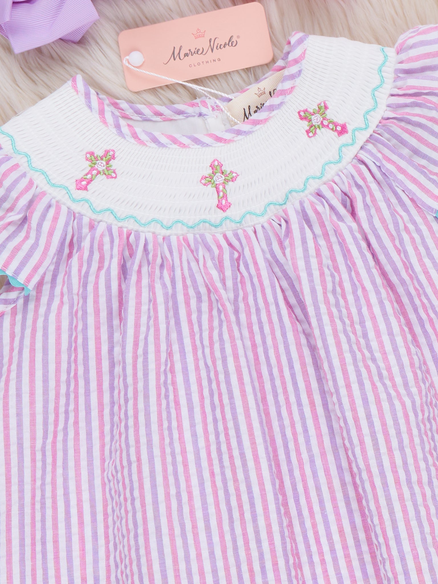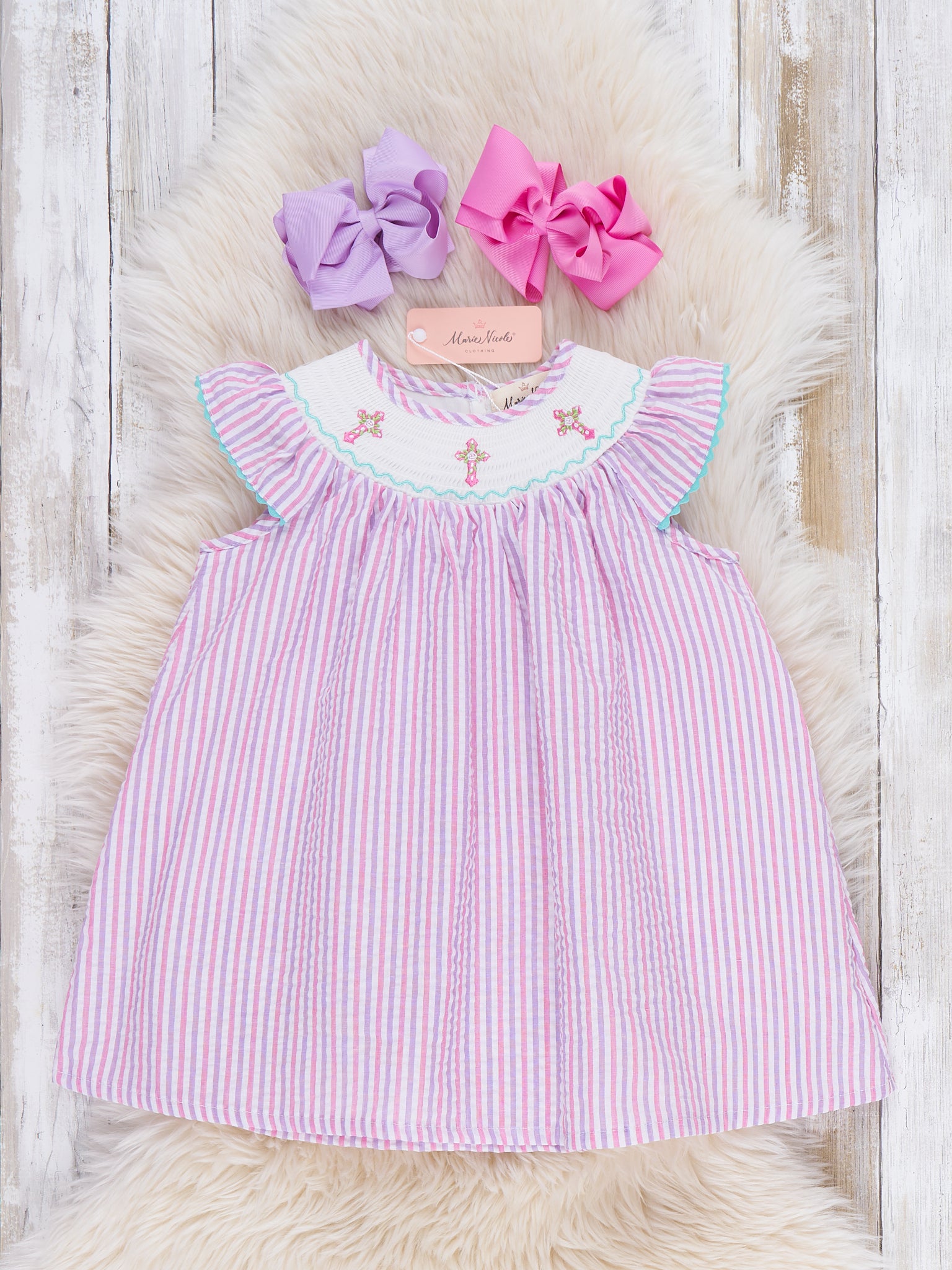 Little Blessings Cross Embroidered Dress by Marie Nicole Clothing features a sweet bishop silhouette with flutter sleeves and delicate cross embroidery around the smocked neckline. The soft, easy-fitting design lets little ones move comfortably, making it a lovely choice for church, holidays, and special family photos.