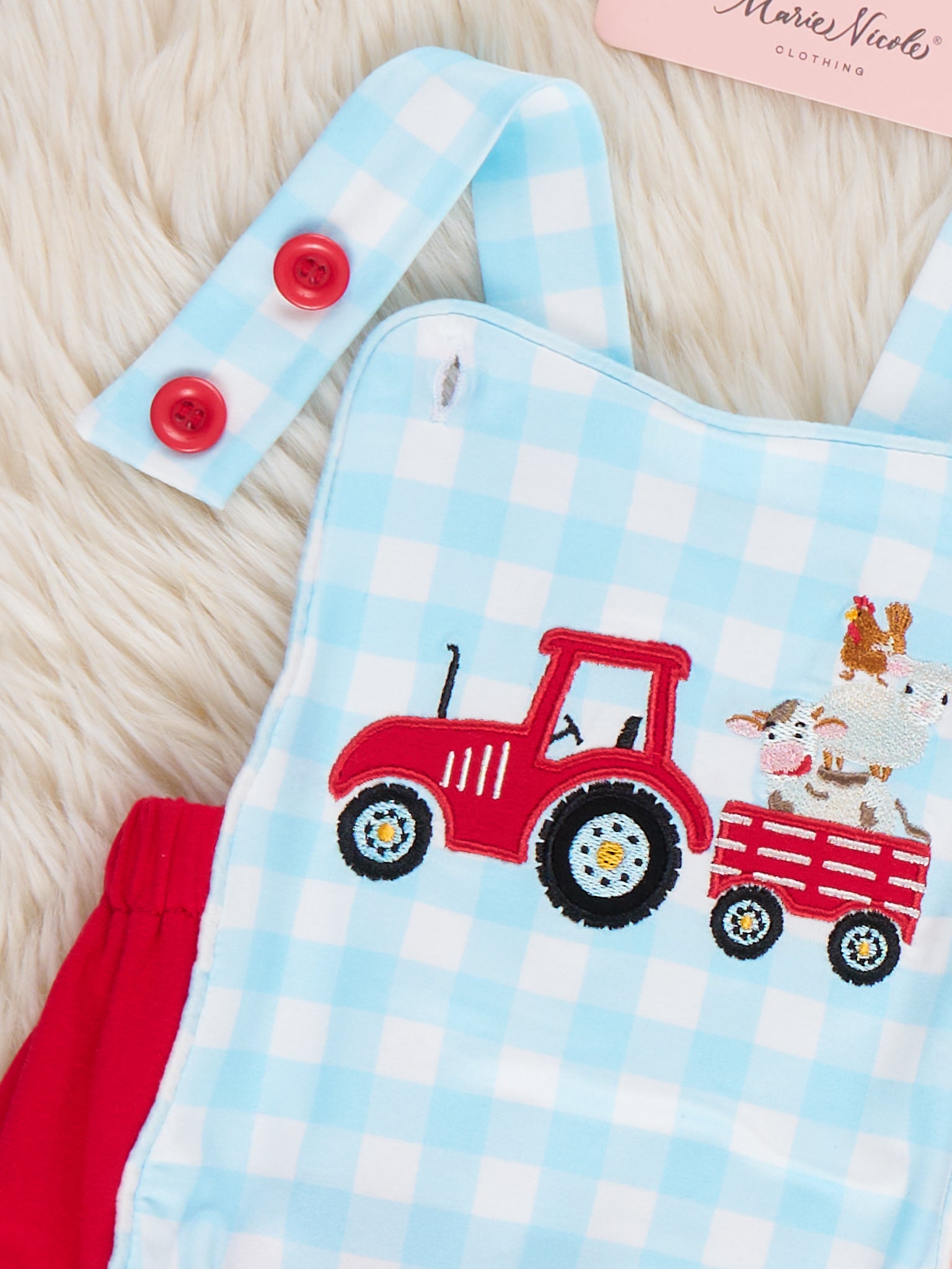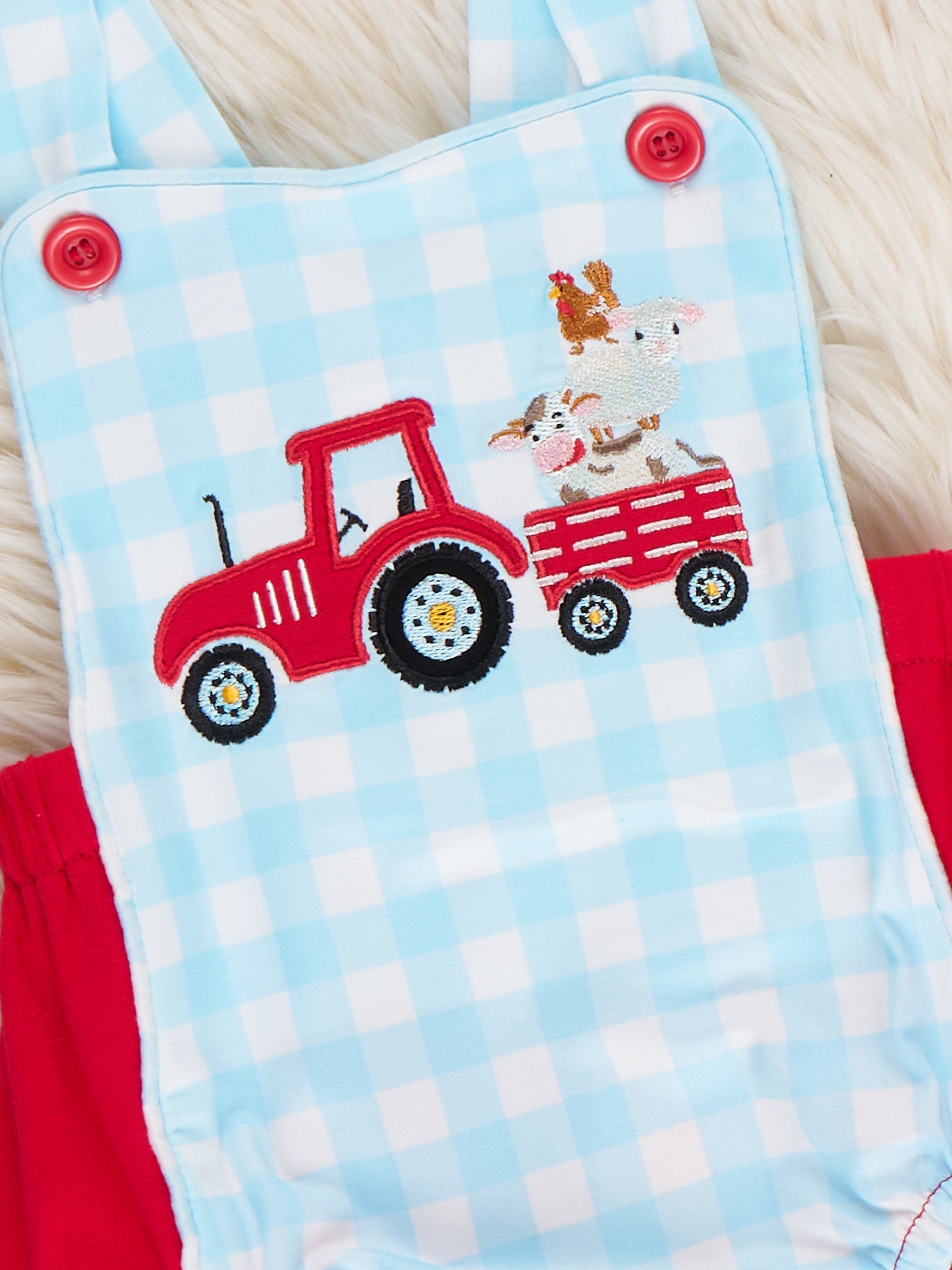 The Little Tractor Helper Embroidered Plaid Romper by Marie Nicole Clothing is a perfect blend of farm charm and comfort. Featuring a playful tractor and animal embroidery with contrasting red and gingham plaid fabric, this romper is perfect for farm-themed fun, family outings, and sunny day adventures. The easy snap closures ensure quick changes, making it a practical and adorable choice for little ones.