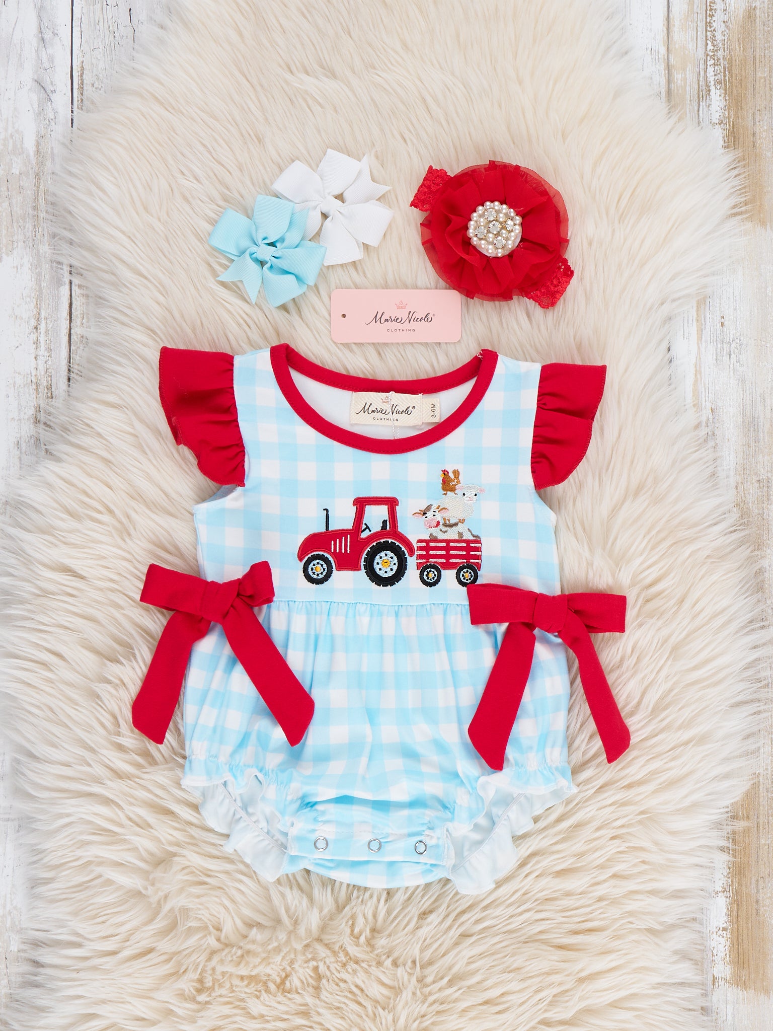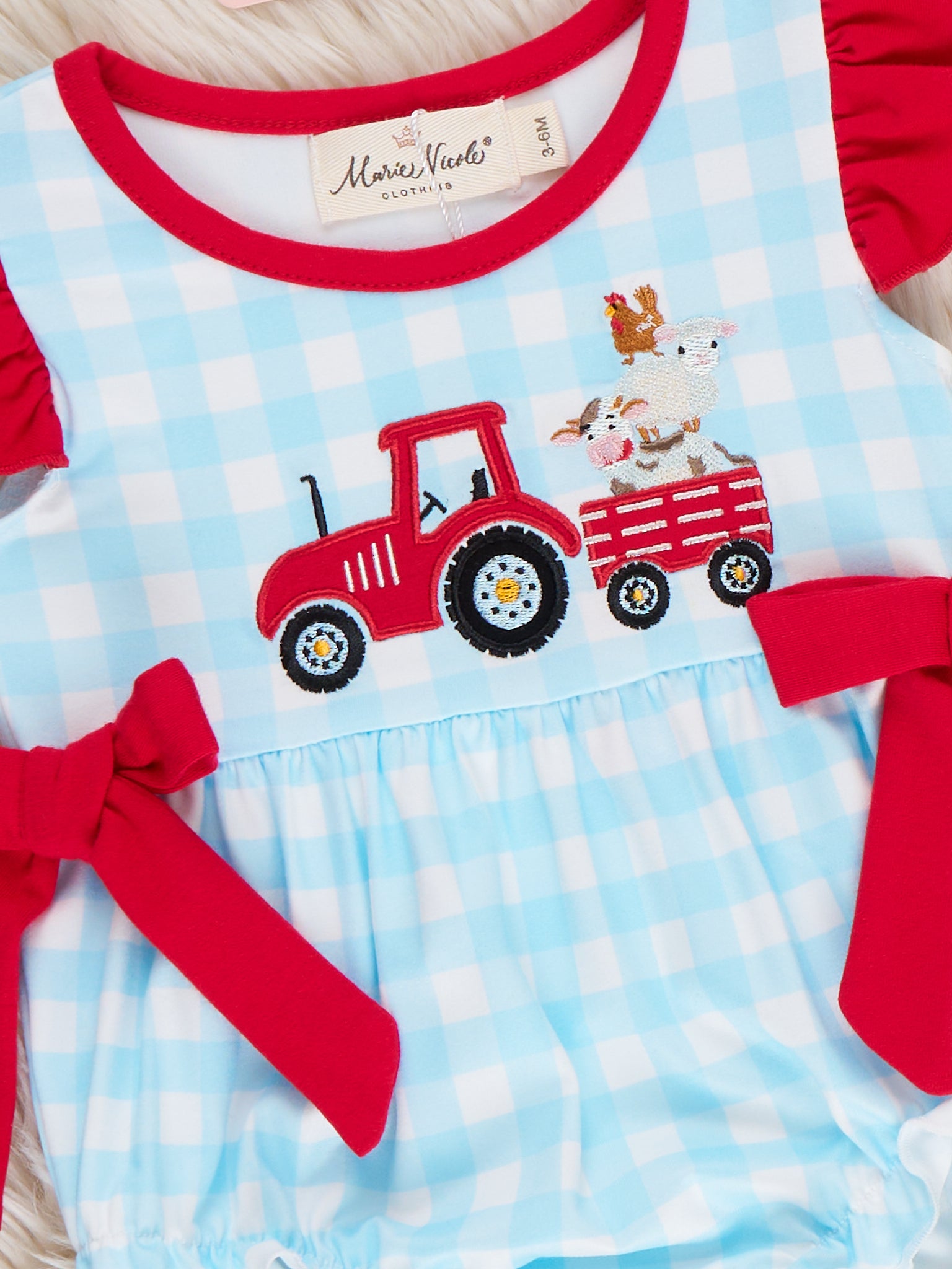 The Little Tractor Helper Embroidered Plaid Ruffle Bubble by Marie Nicole Clothing is a charming and comfy option for little ones. Featuring adorable tractor embroidery and bright red tie straps, this bubble romper is as playful as it is practical. The ruffled details and snap closures ensure ease of movement, making it perfect for farm-themed fun, family picnics, and sunny outdoor adventures.