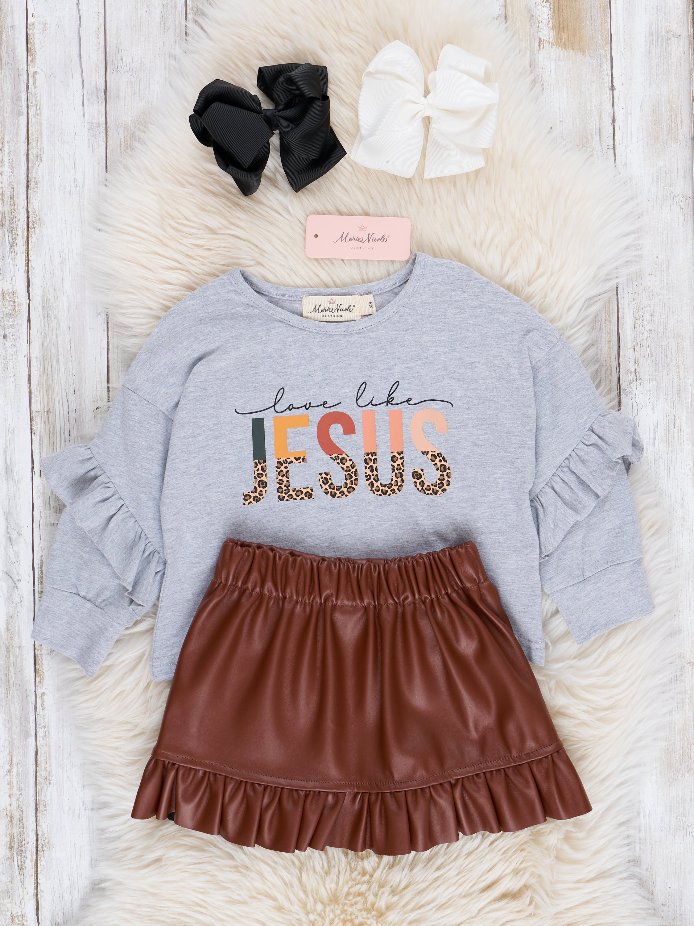 Spread love and fashion with this "Love Like Jesus" outfit! The grey longsleeve crewneck features the phrase "Love Like Jesus" while the brown faux leather skirt adds a touch of edgy style with its ruffle hem. Perfect for girls who want to rock their faith and style.