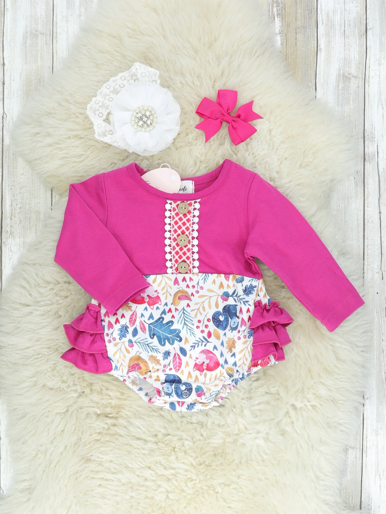 This sister set has us feeling squirrely! This bubble romper features nonfunctional wooden buttons, lace trim, layered ruffles, a cute fall forest animal print, & snap buttons.