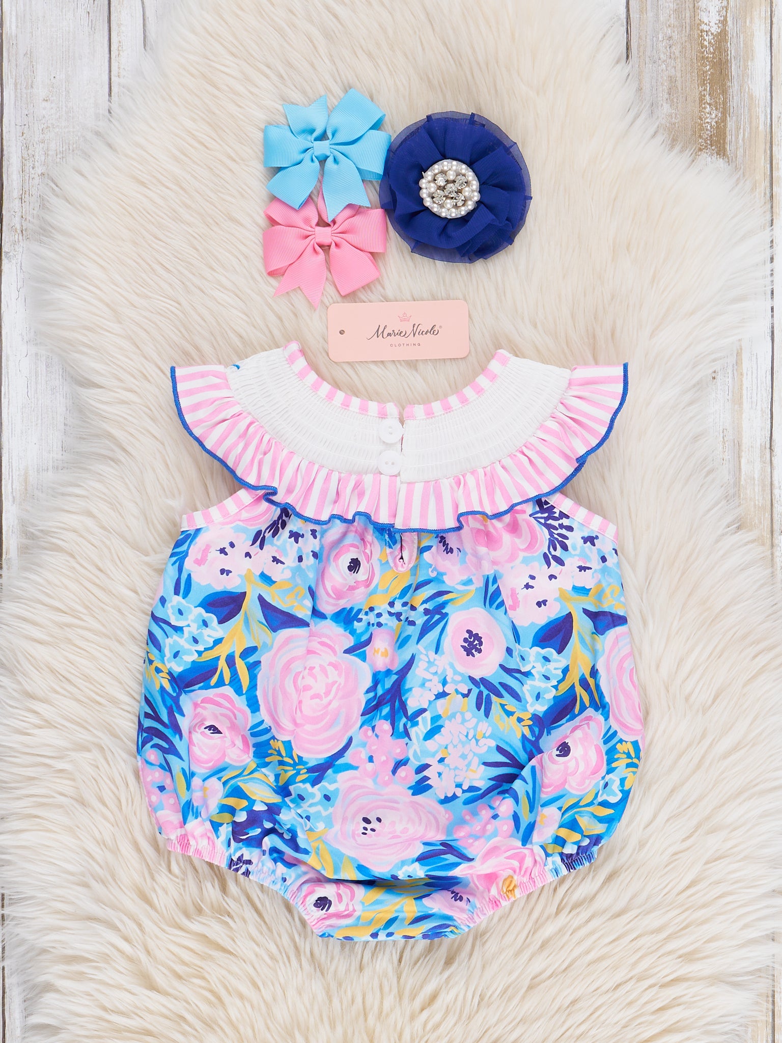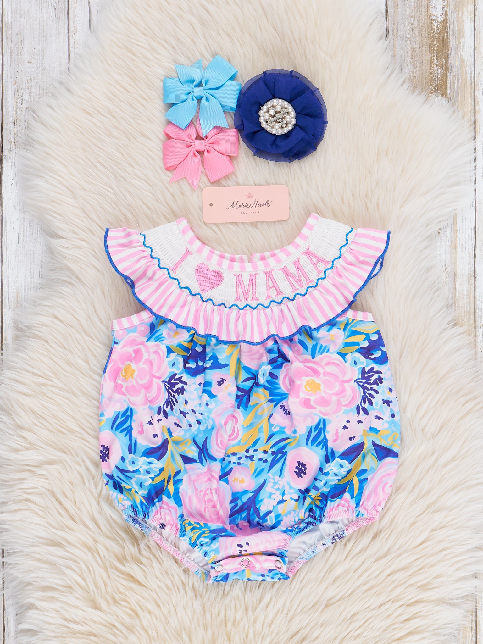 Get ready for summer with our Mama Love Smocked Bubble! This adorable bubble features a blue floral design and an embroidered "I ❤️ MAMA" over a smocked bib collar. Perfect for sisters, this set from Marie Nicole Clothing is sure to show some mama love.
