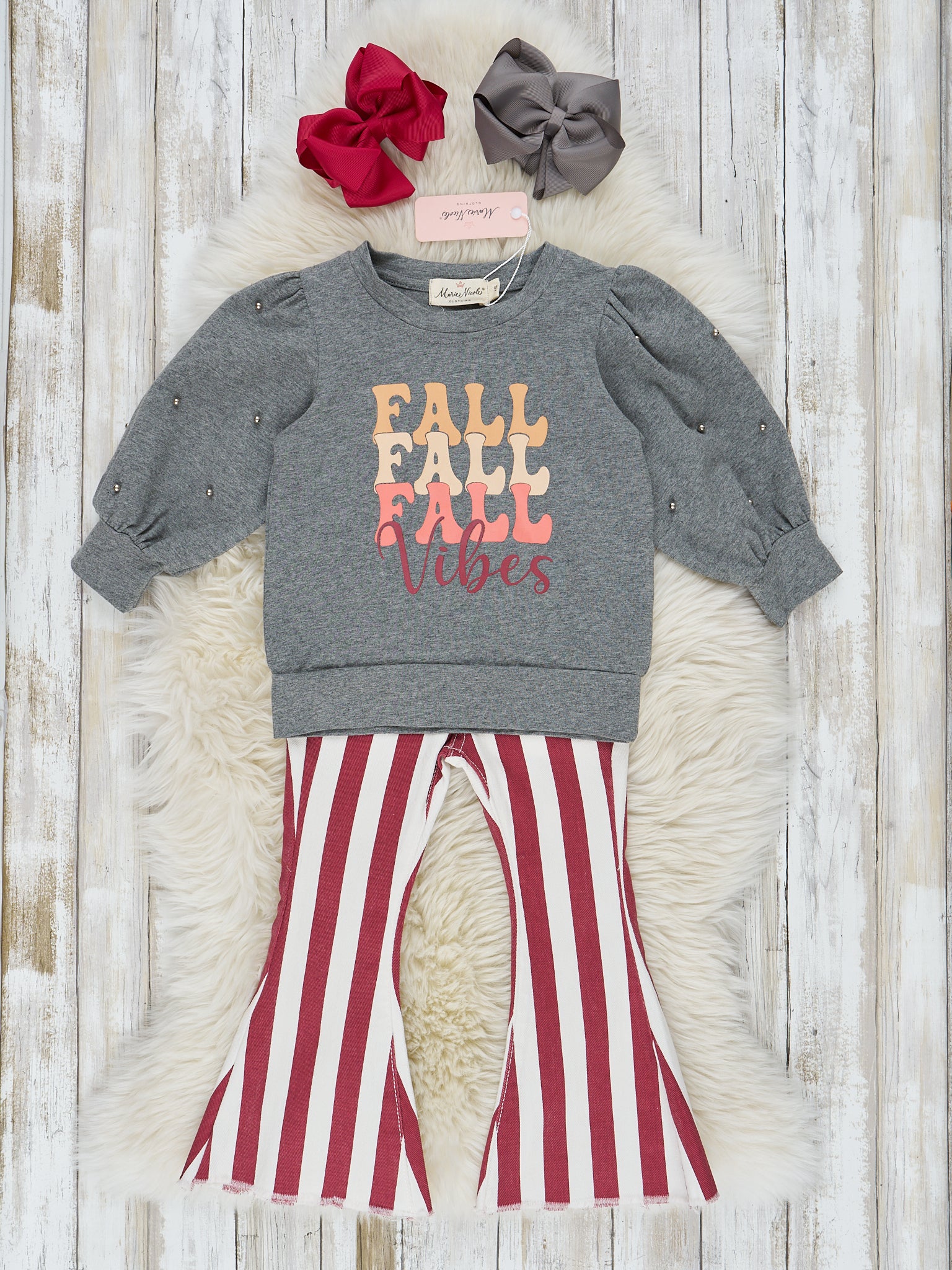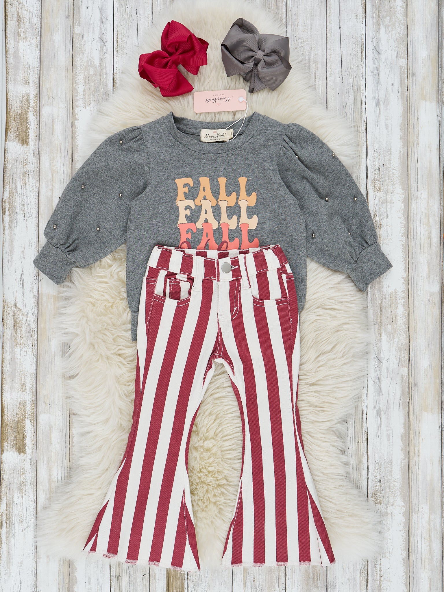 Fall into everyone's favorite season with this outfit featuring a grey puff sleeve top with dark pearl detail. The perfectly coordinating maroon and white striped bell bottoms create the perfect fall look!