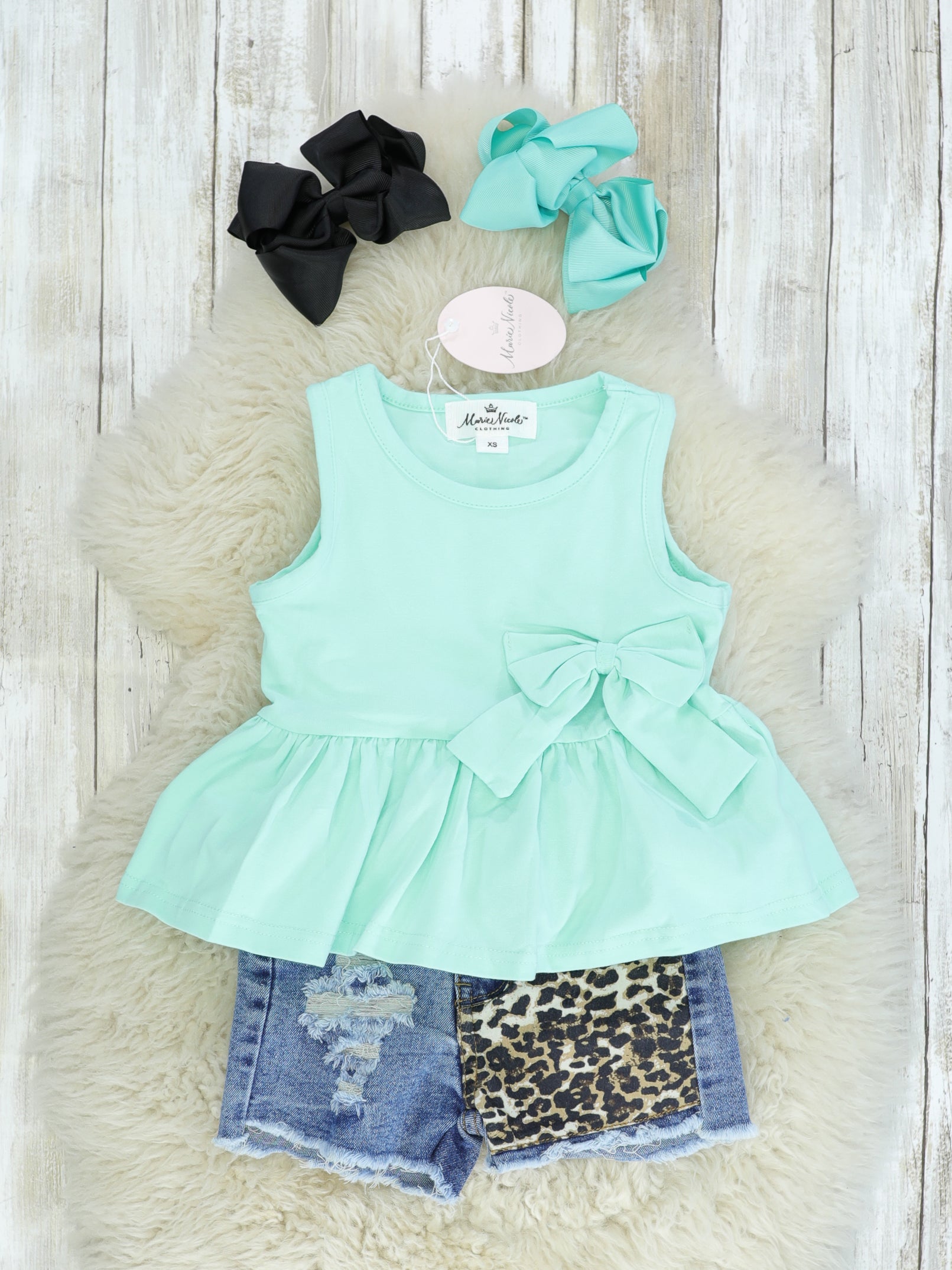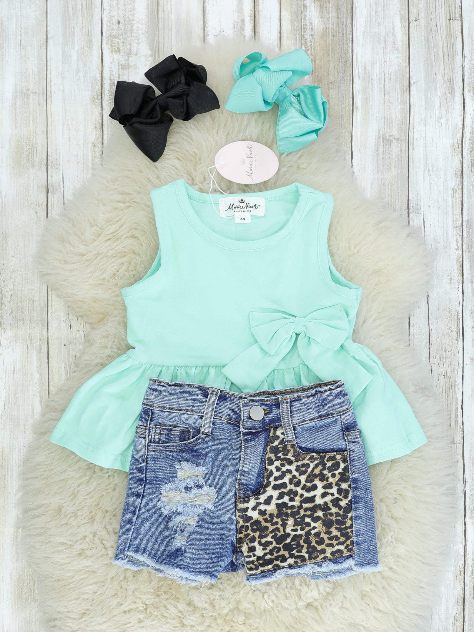 Pretty in mint in this adorable tank and short outfit. This top features a mint bow with ruffle hem and distressed shorts with leopard patchwork.