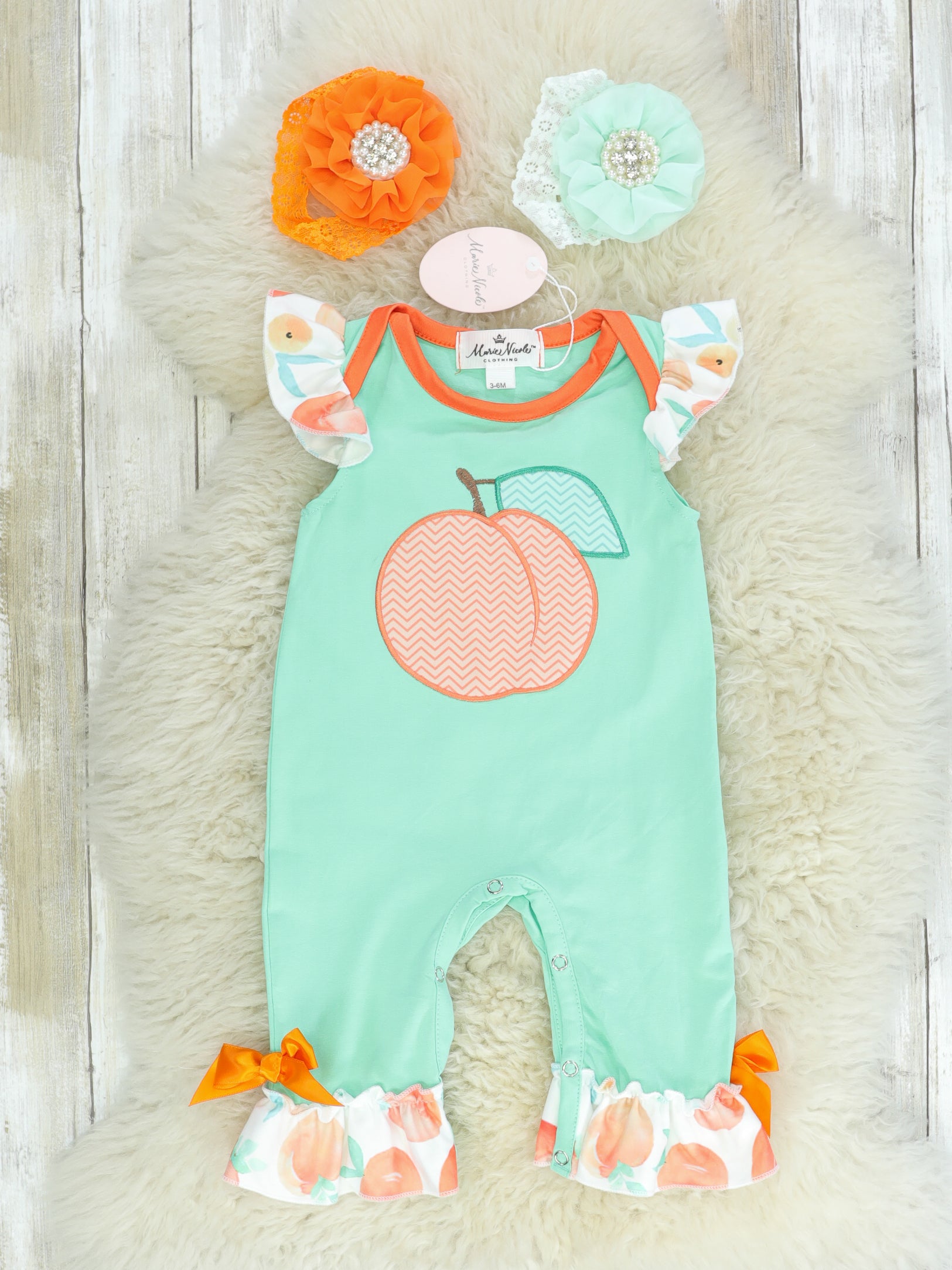 This sister set has a peach of our hearts! This mint romper features an orange neck trim, peach detail flutter sleeves & ruffles, a peach appliqué, & pretty orange bows on the outside of both legs.