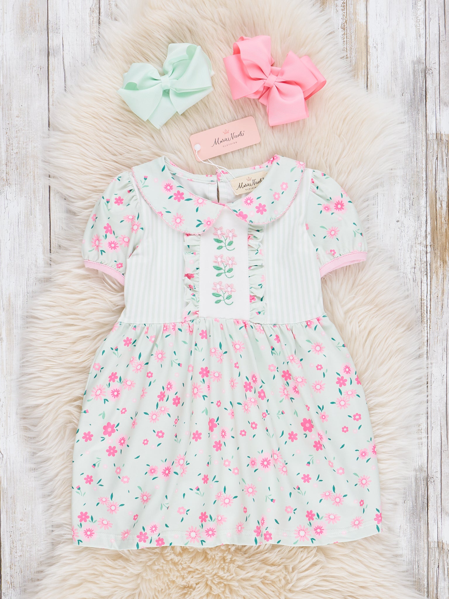 Introducing the sweet and stylish Minty Florals Ruffle Dress from Marie Nicole Clothing! This girls dress features a charming striped bodice with a delicate button and ruffle detail. The floral print skirt adds a fun and feminine touch. Perfect for your little fashionista! Don't forget to shop the sister set option.
