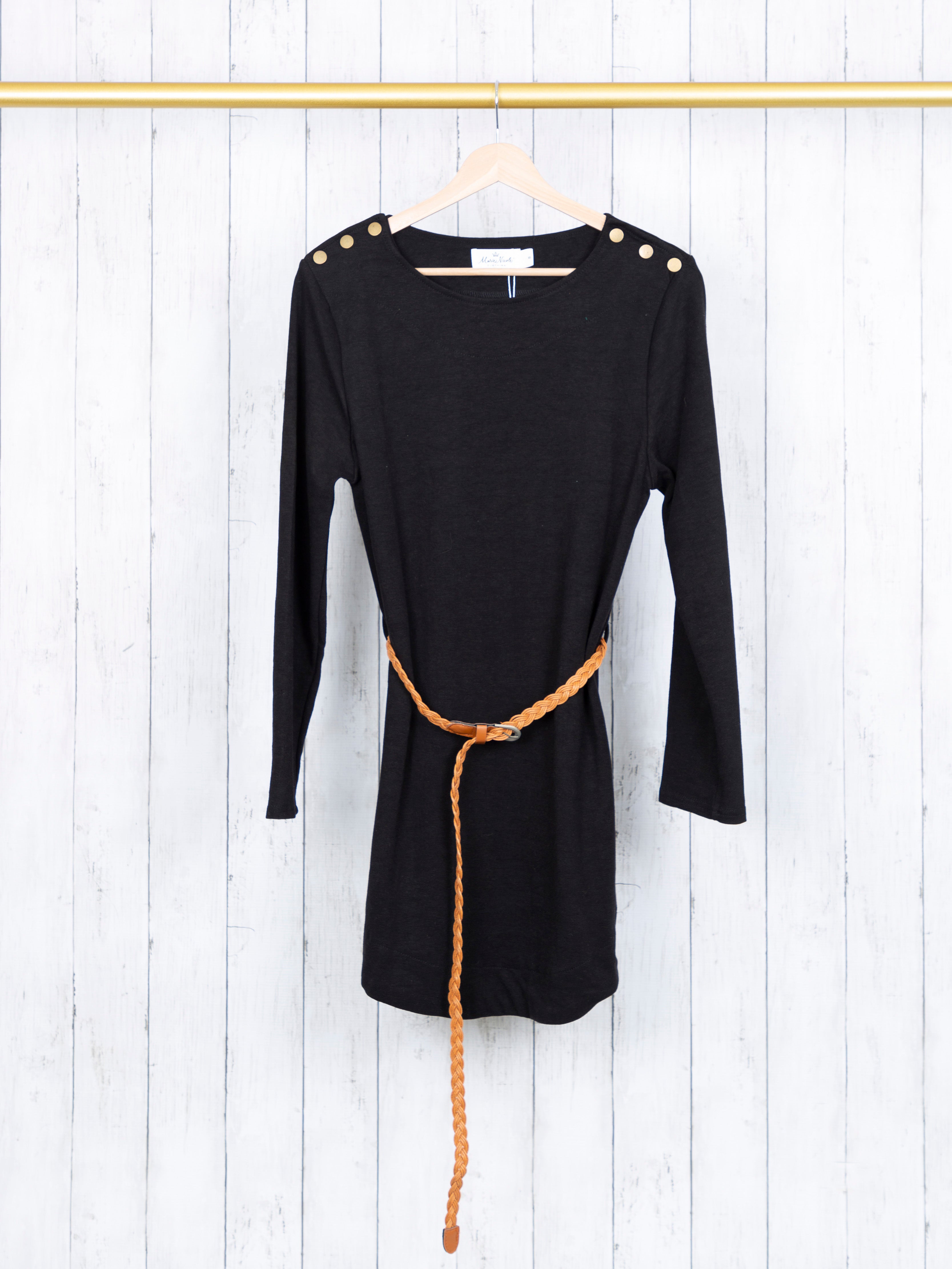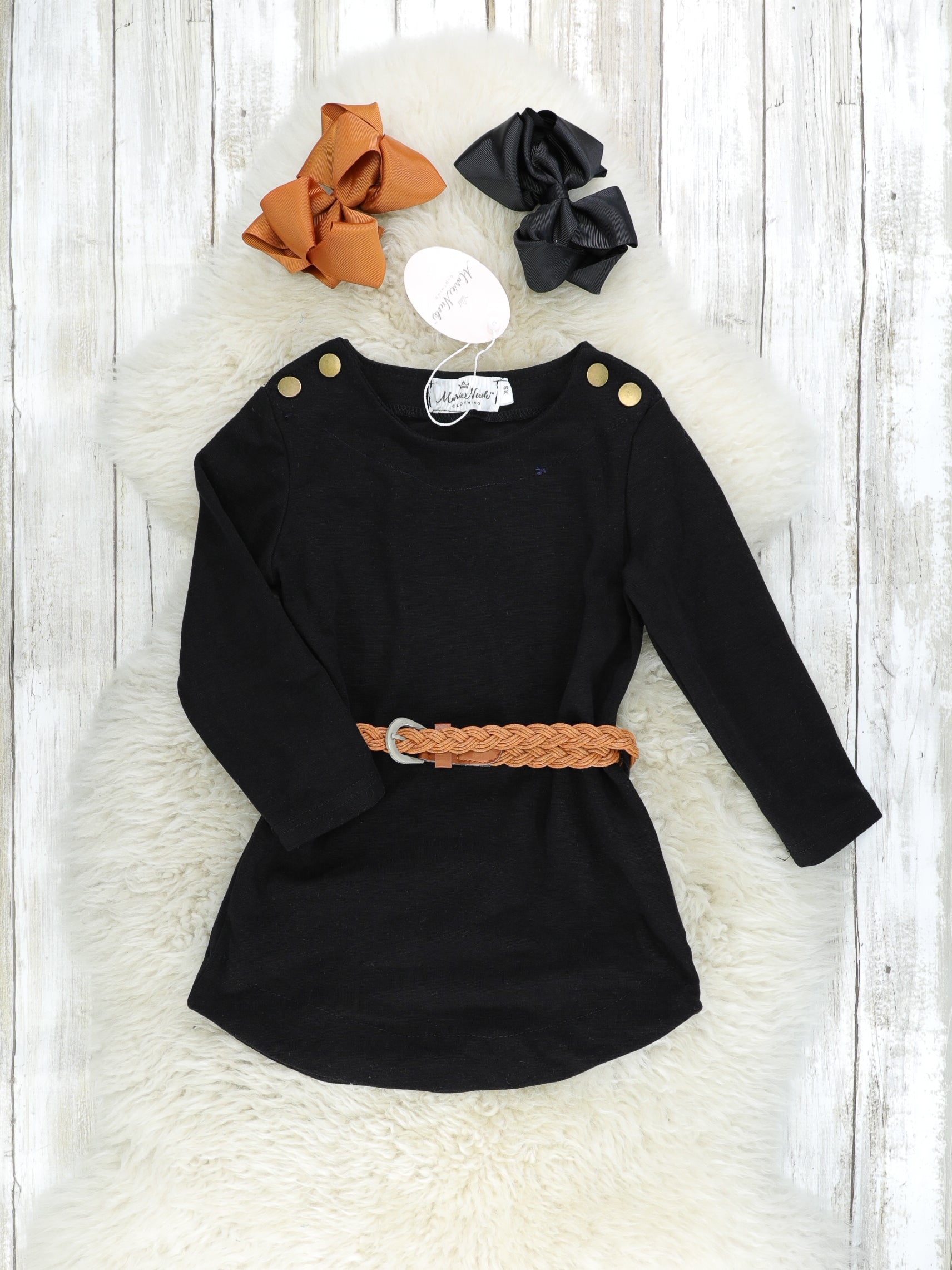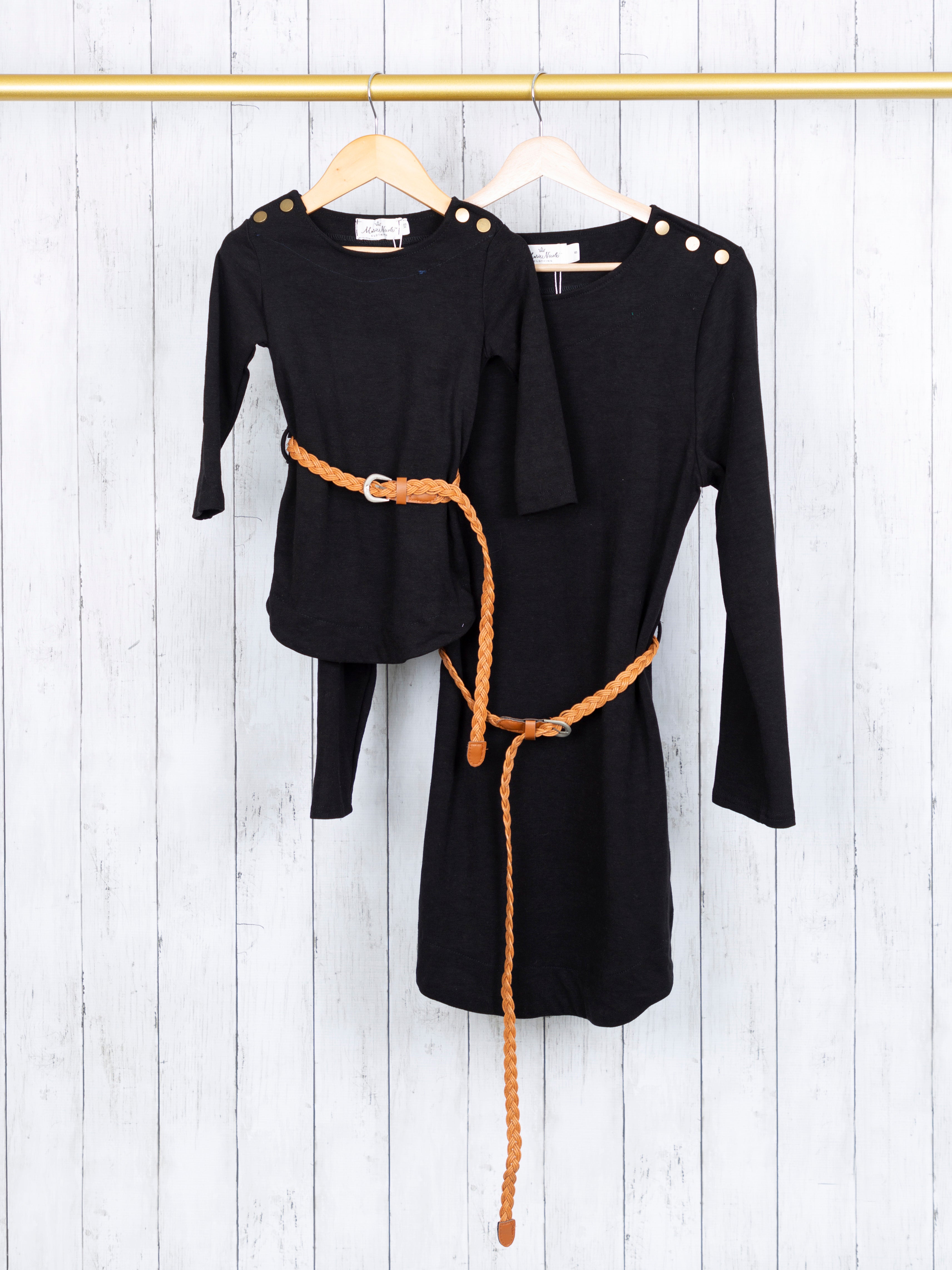 The sweetest dresses for you & your gal! These black dresses feature decorative buttons on the shoulders & a braided belt.