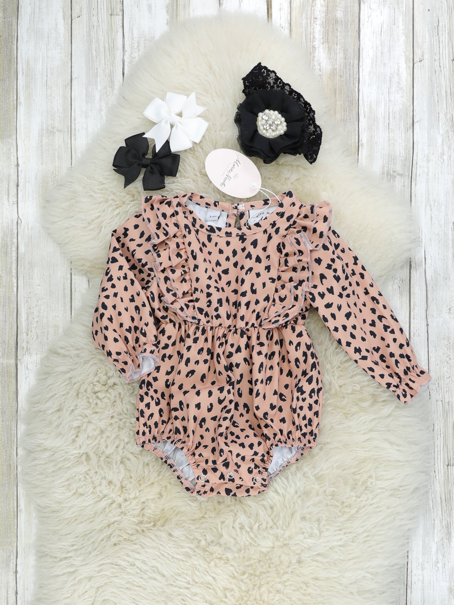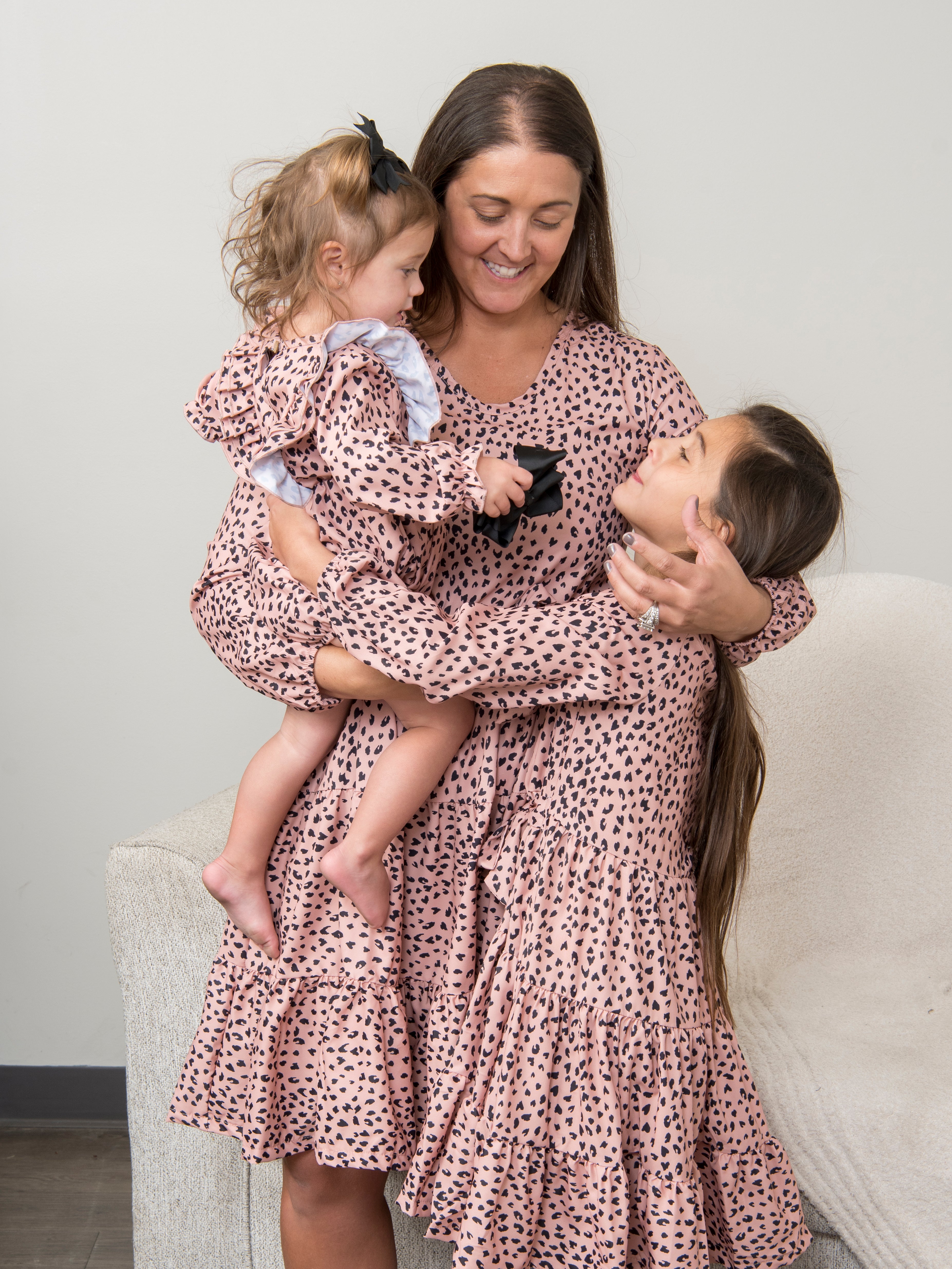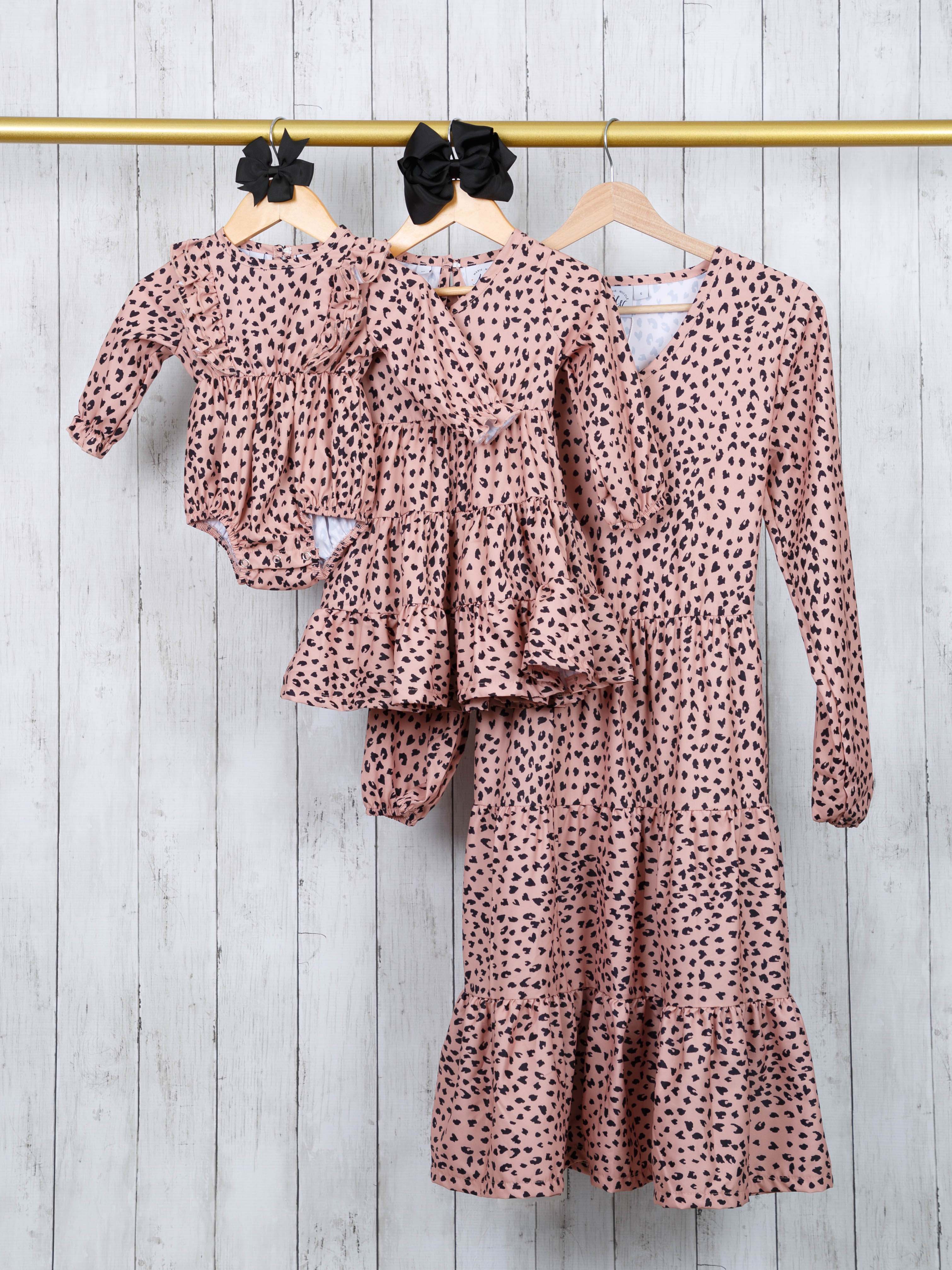 Match both your minis in style this season! These tiered dresses feature cheetah print, cinches at the wrist, & a tie at the waist. The little girl's dress features a keyhole at the nape of the neck for easy changing. The romper features cheetah print, cinches at the wrists, flutter trim, snap buttons, & a key hole for easy changing.