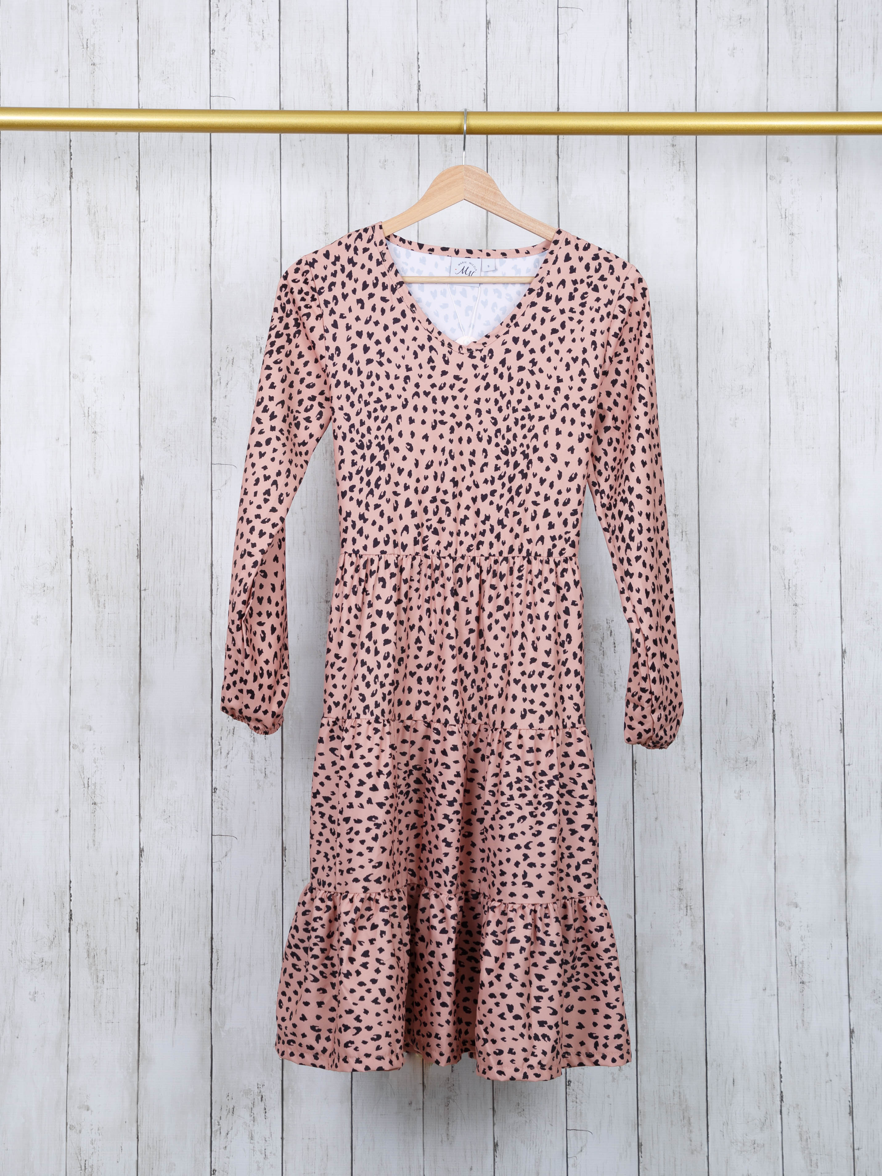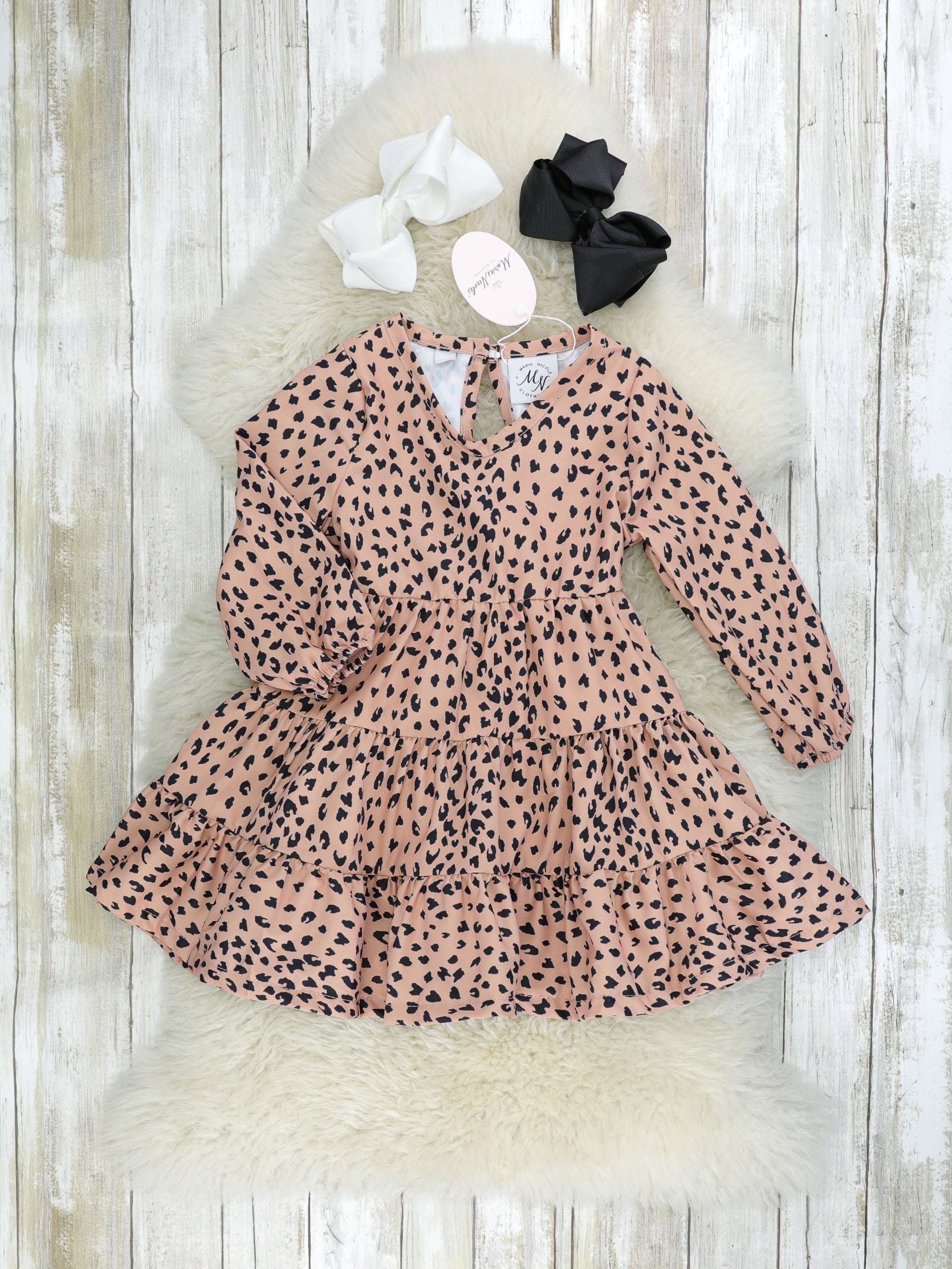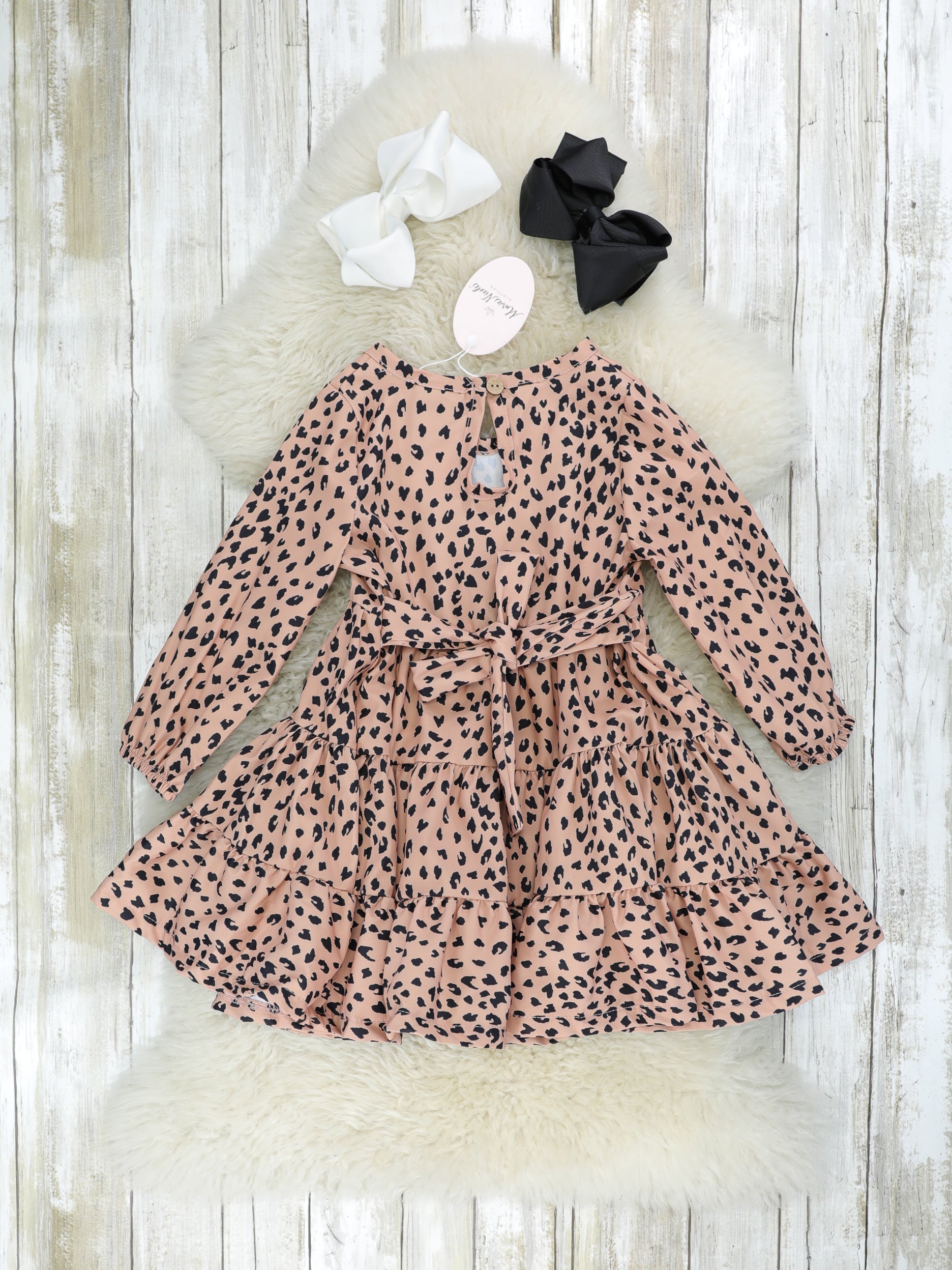 Match both your minis in style this season! These tiered dresses feature cheetah print, cinches at the wrist, & a tie at the waist. The little girl's dress features a keyhole at the nape of the neck for easy changing. The romper features cheetah print, cinches at the wrists, flutter trim, snap buttons, & a key hole for easy changing.