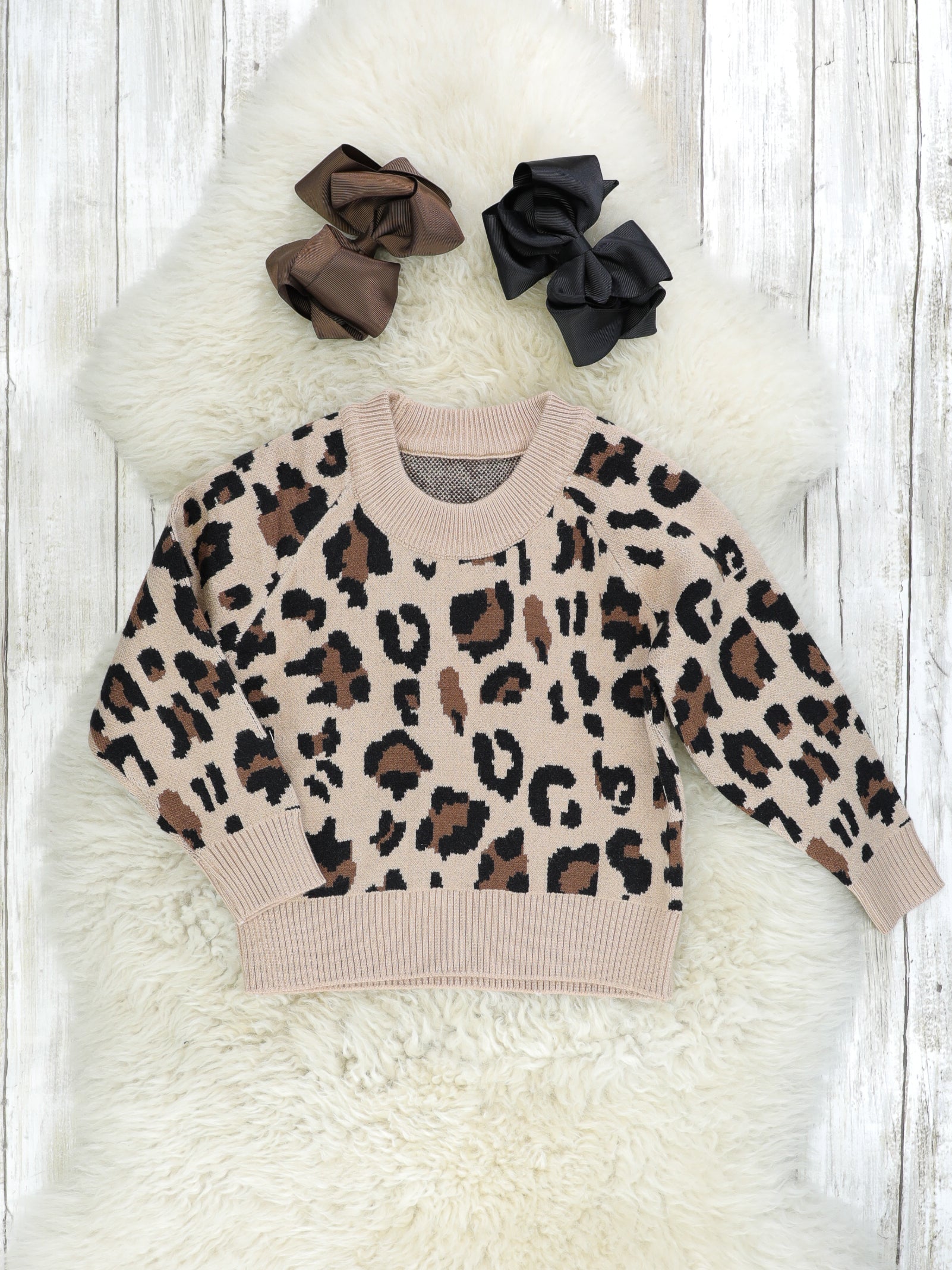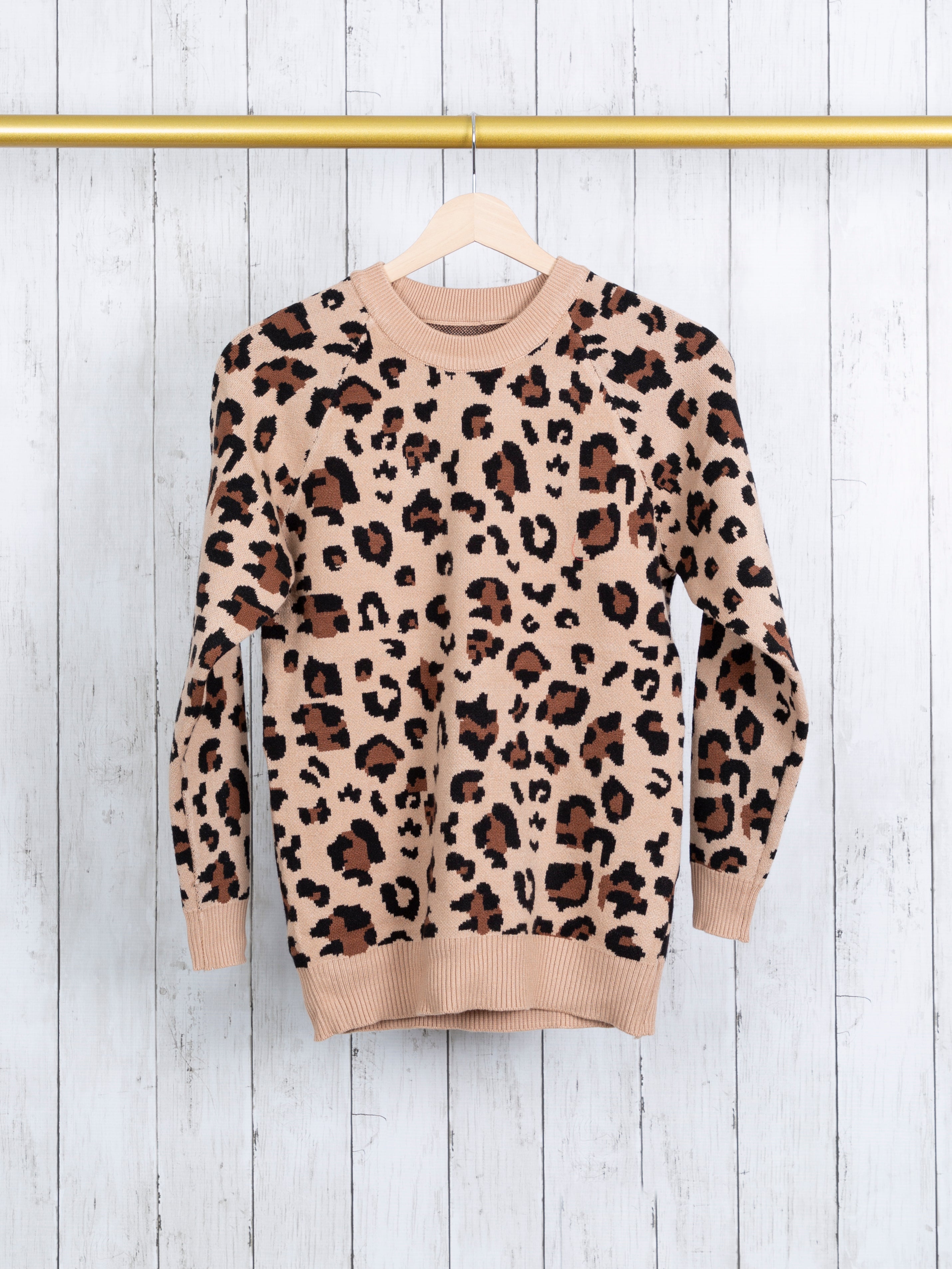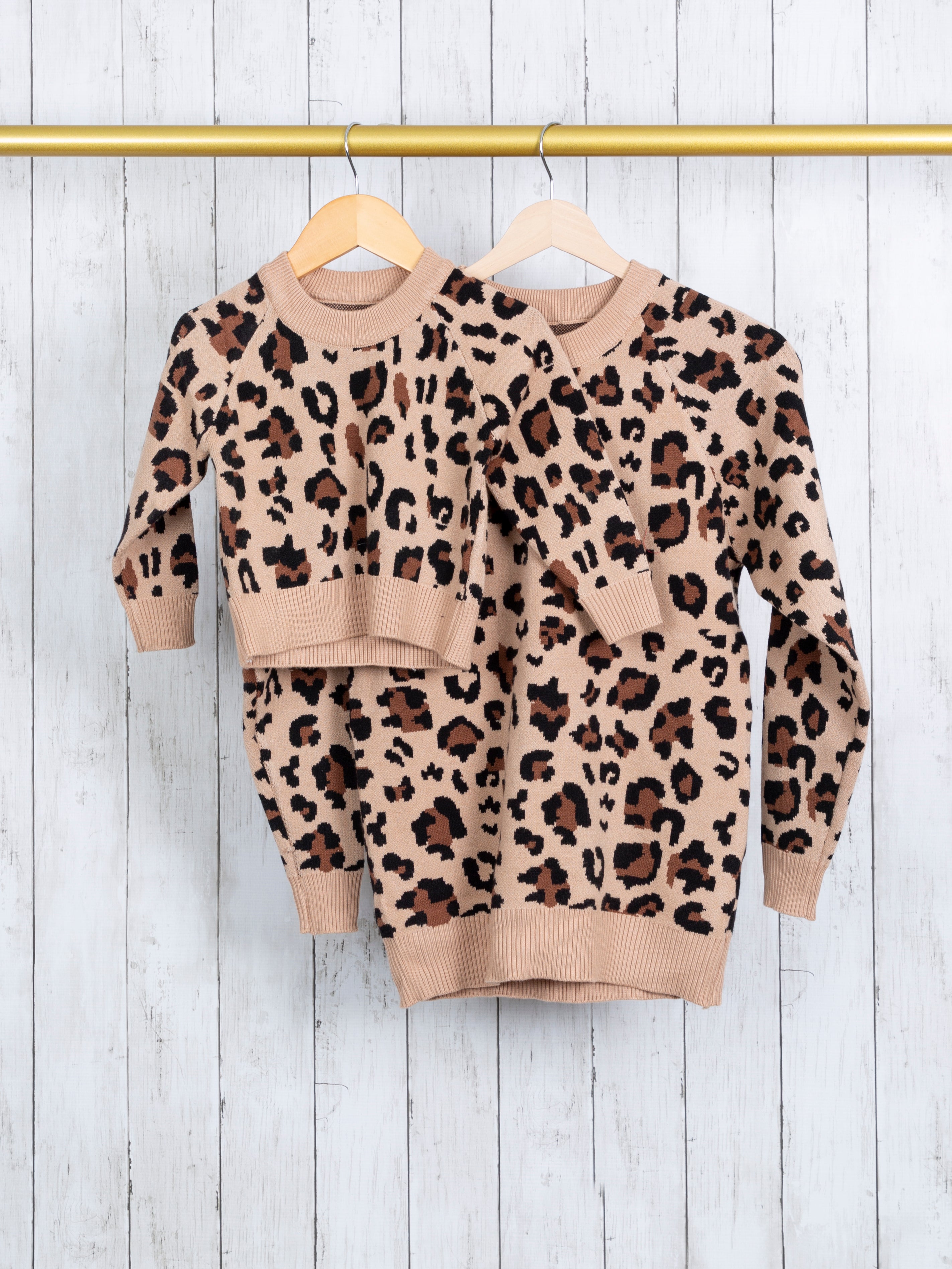 This stunning sweater is perfect for mom & me days! This sweater features leopard print with tan trim.