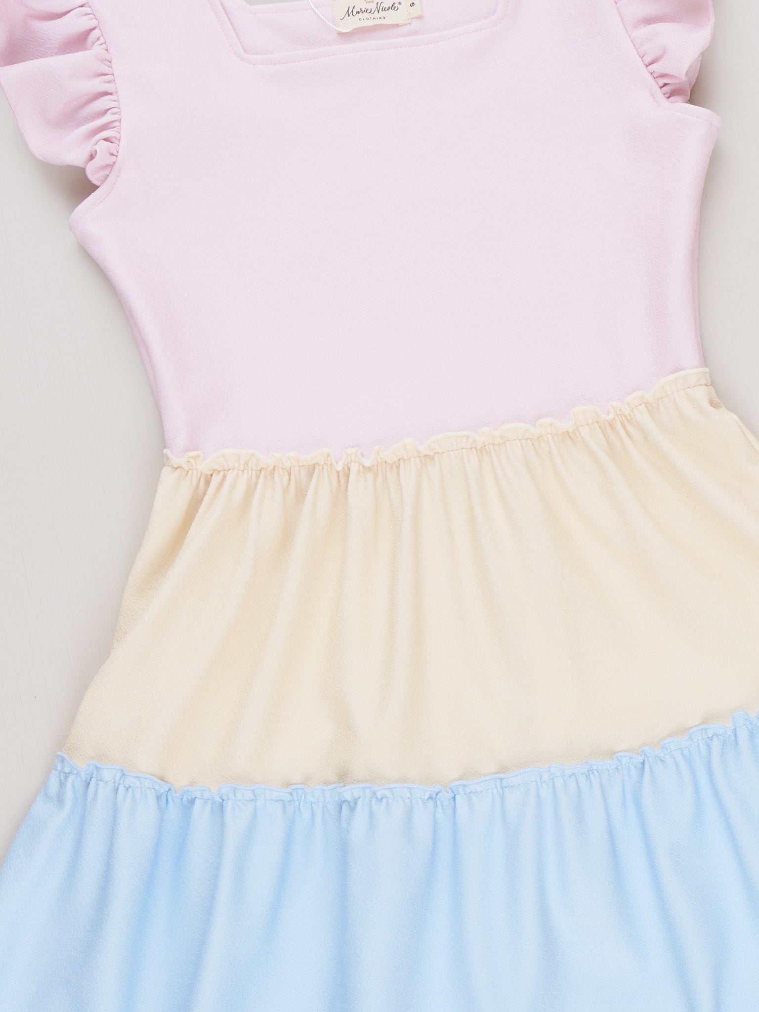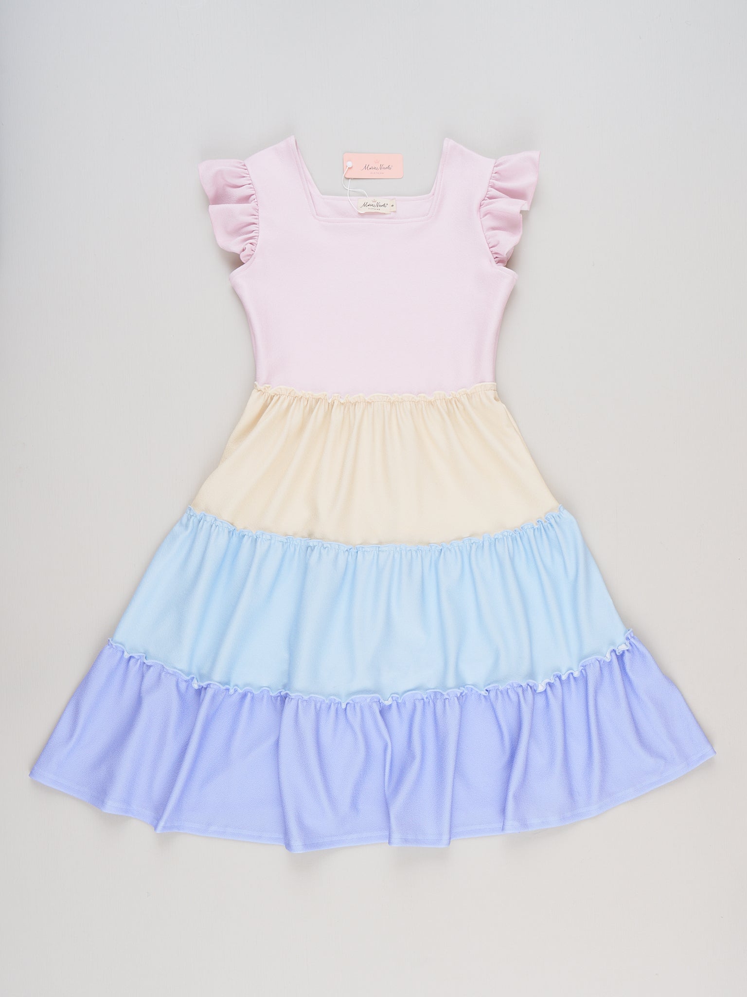 Mom & Me Dreamy Layered Twirl Dress by Marie Nicole Clothing is a pastel rainbow color-block flutter-sleeve dress with three soft, ruffled tiers designed for maximum twirl. Matching girl and mom sizes make it perfect for coordinated Easter photos, birthday parties, and sweet spring outings together.