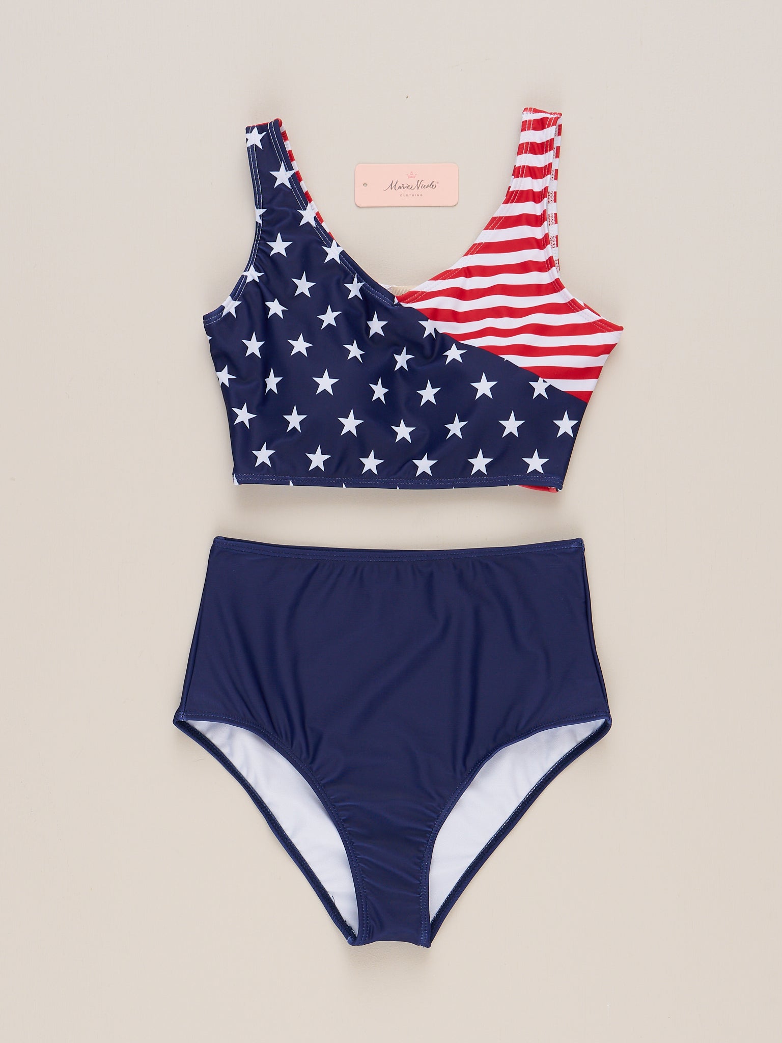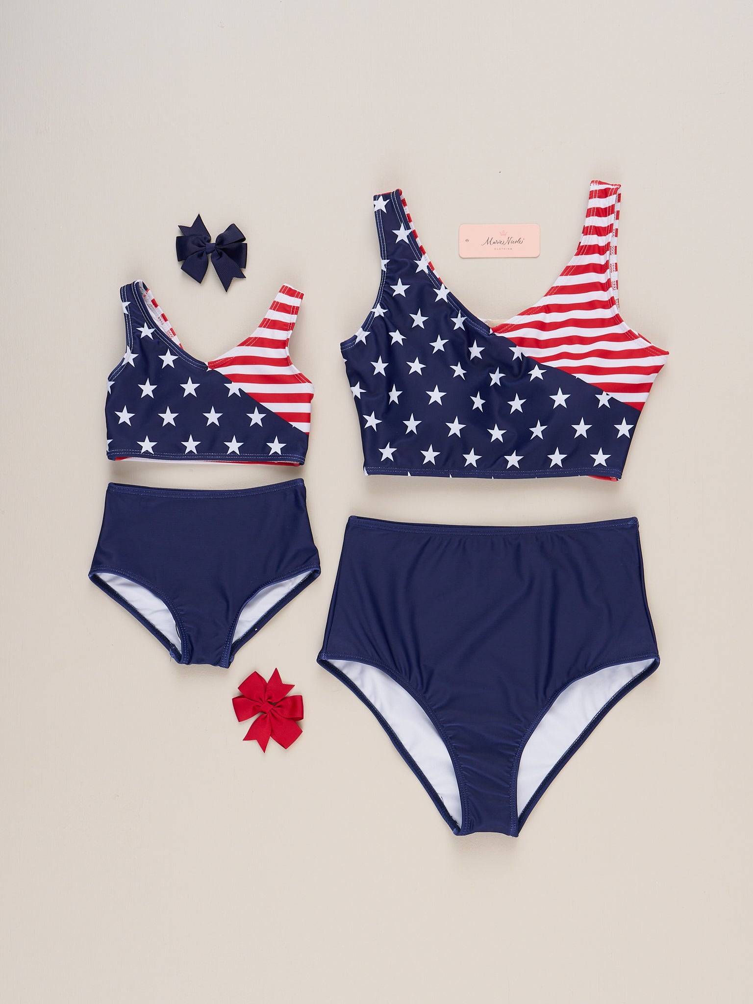Celebrate independence in style with our Mom & Me Independence Day Swimsuit! Featuring an American flag top and navy high waist bottoms, this mom's two-piece suit from Marie Nicole Clothing is perfect for matching family swimsuit days. Show off your patriotism and summer vibes with this must-have!