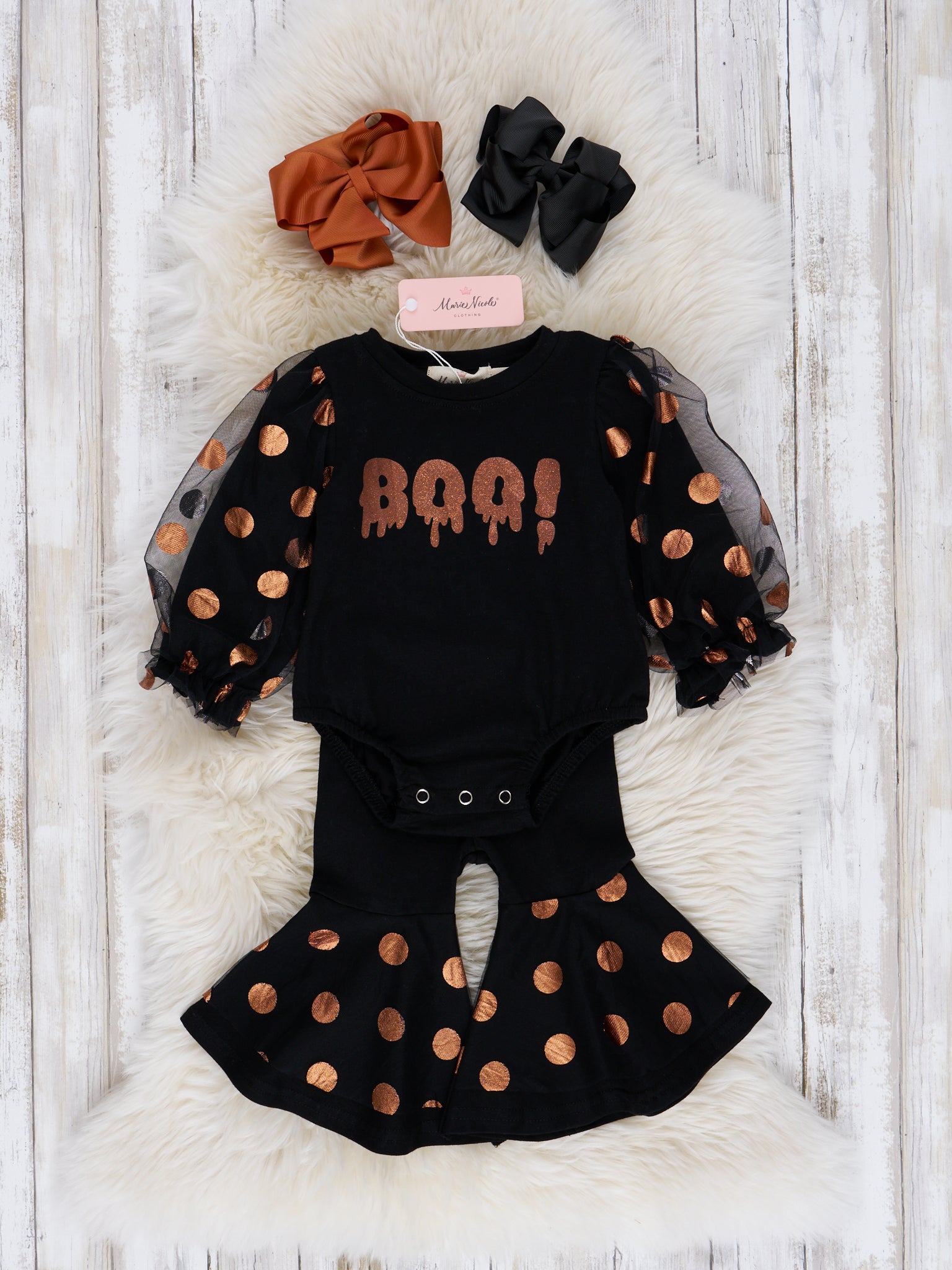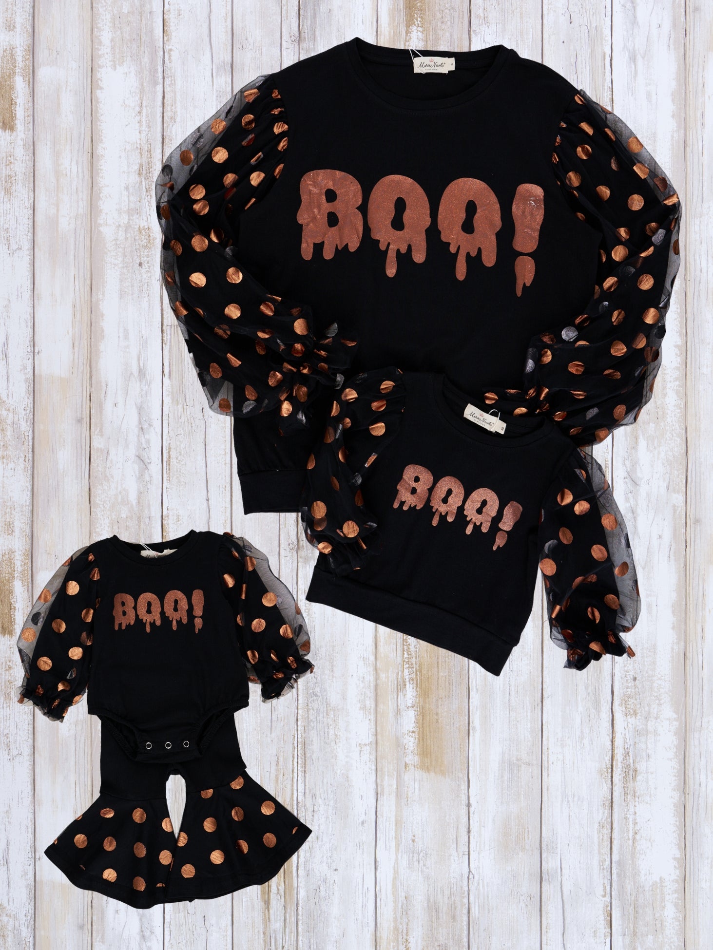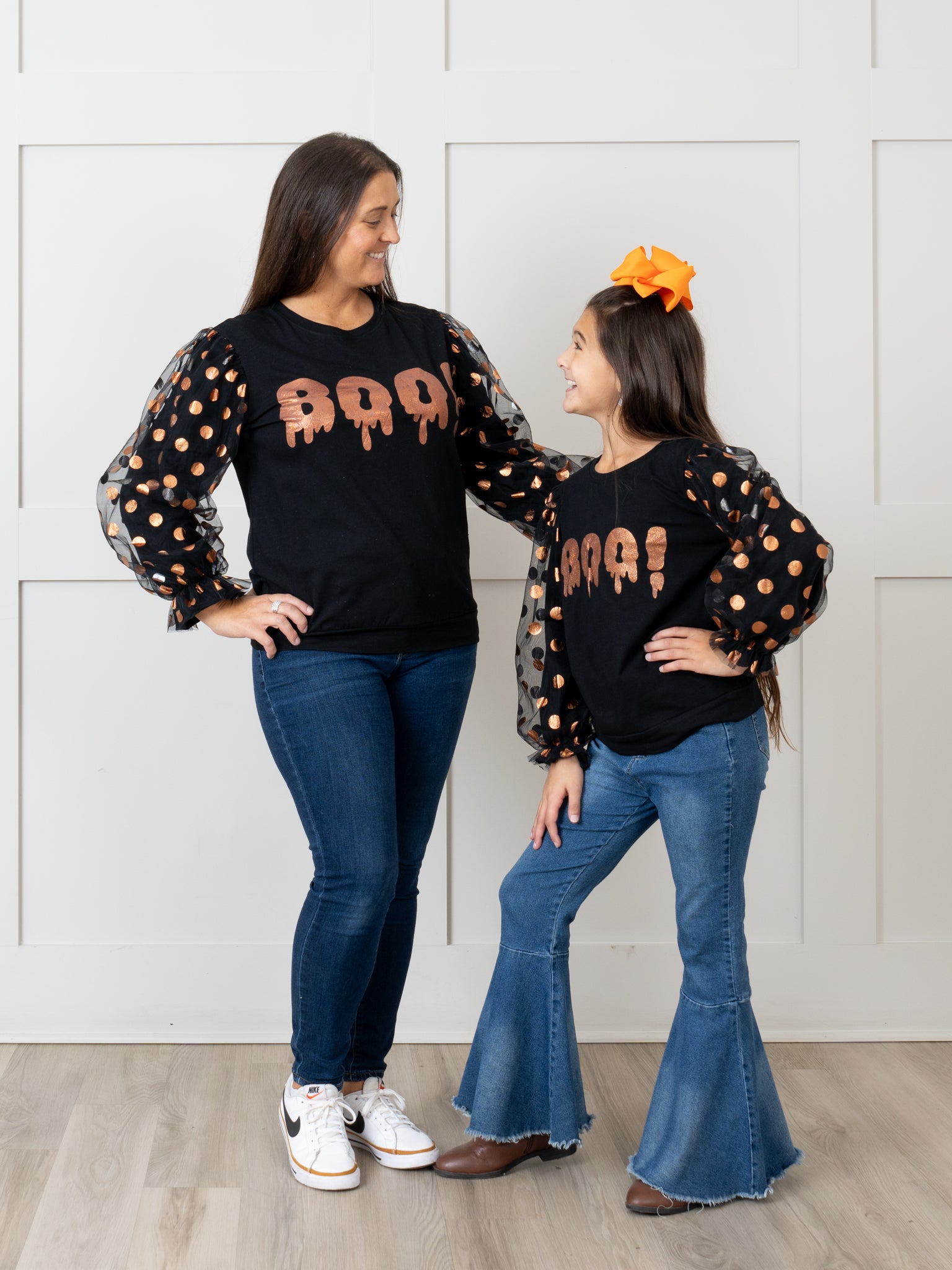 It's a 'Boo!' bash with this Mom & Me Orange & Black Polka Dot Top! With a chic mesh sleeve featuring an explosion of orange polka dots, this 'Boo!' top is perfect for your matching mini, and the bell-bottom romper will have your littlest mini happily haunting the town!