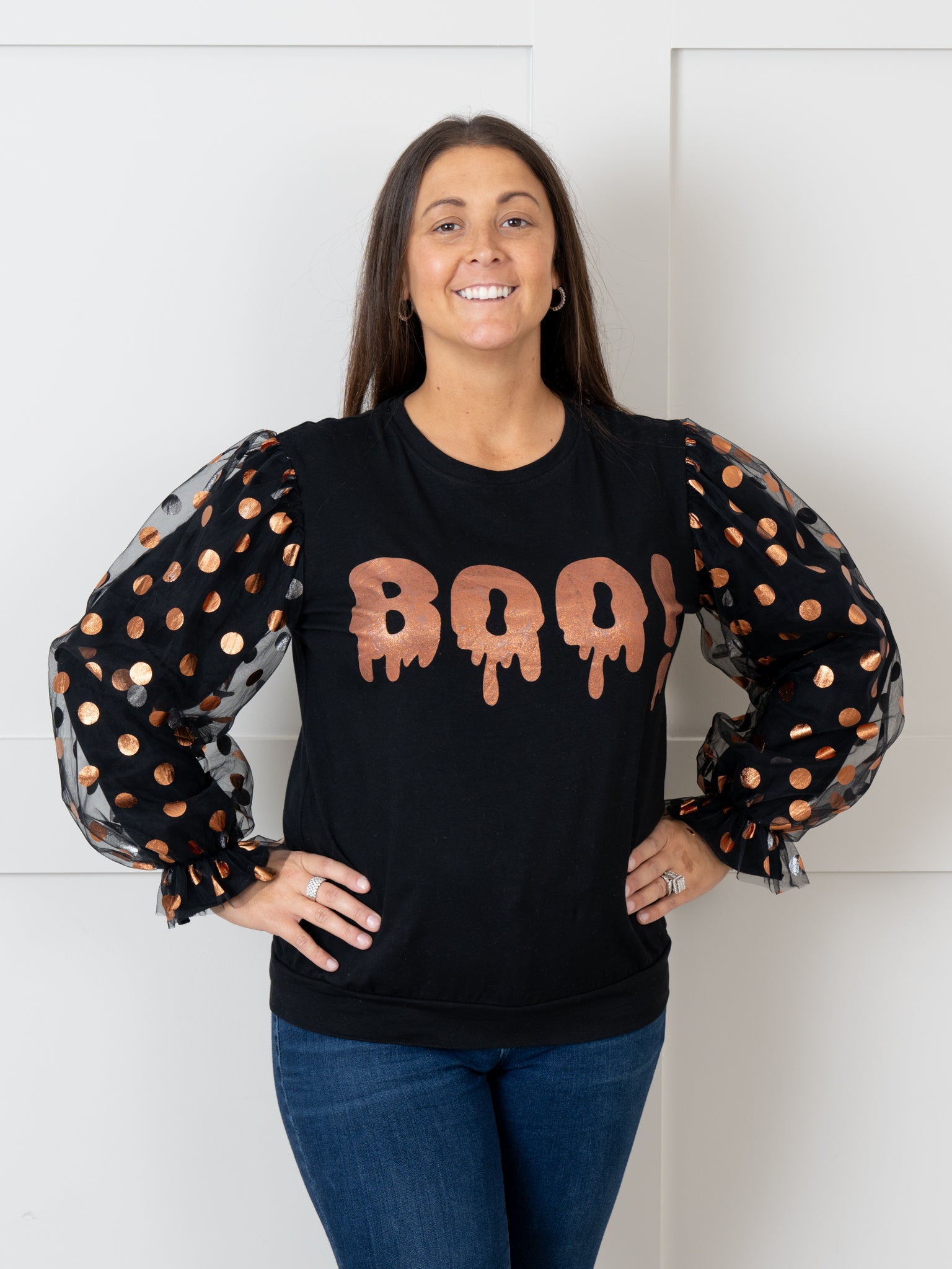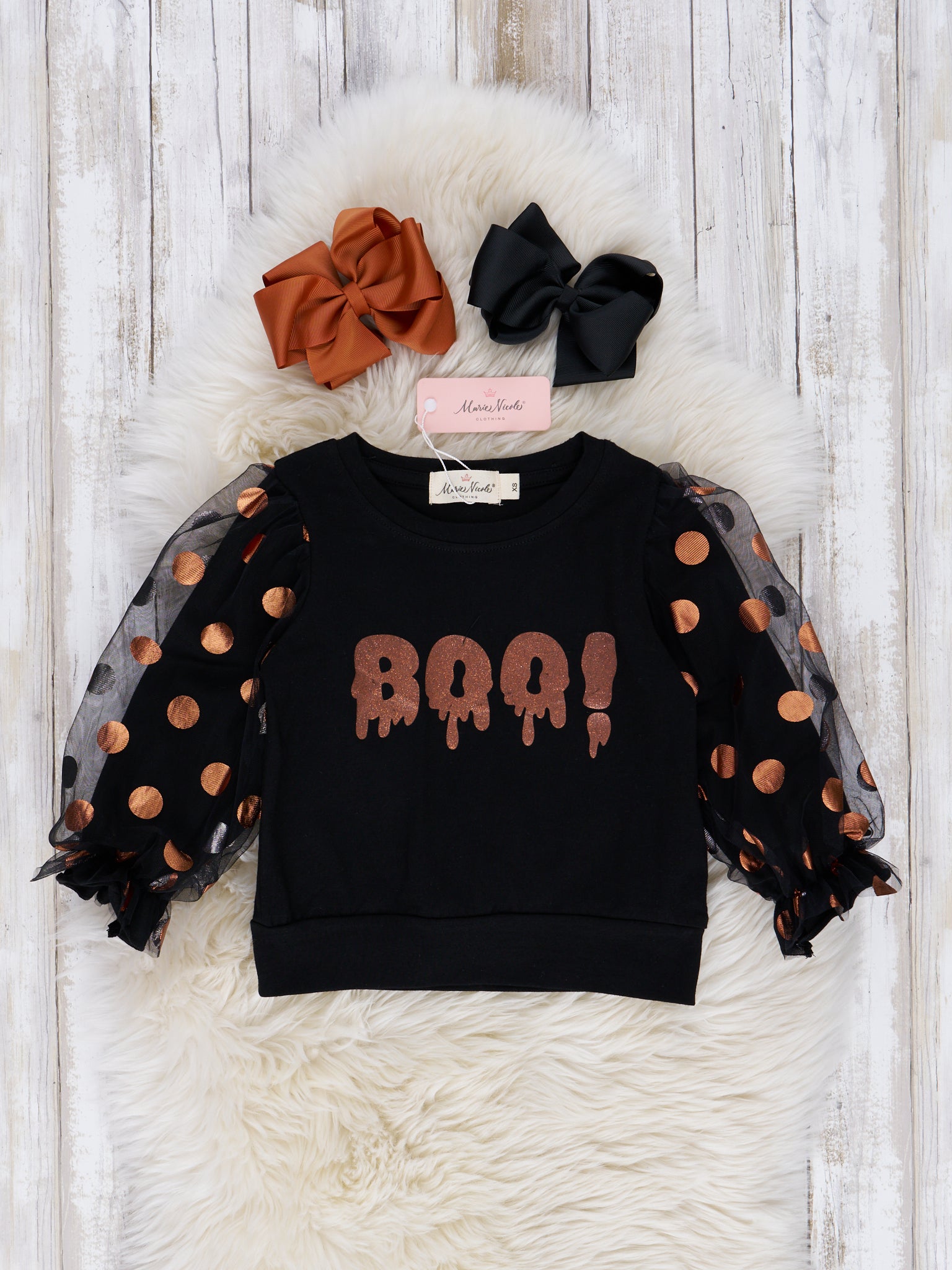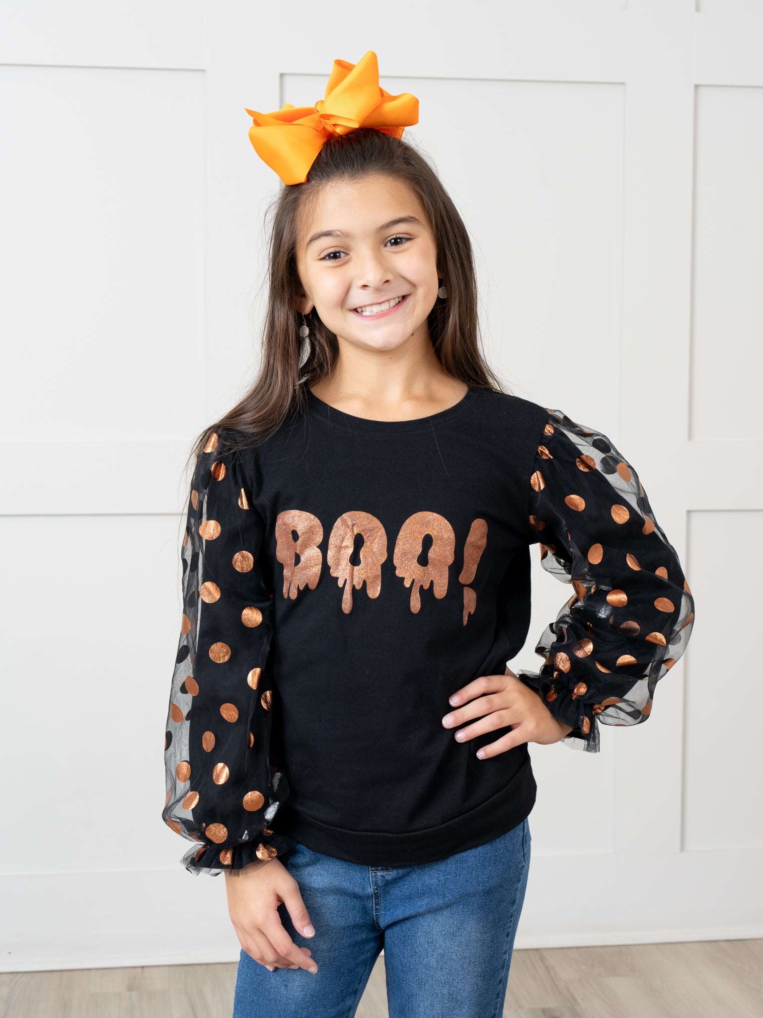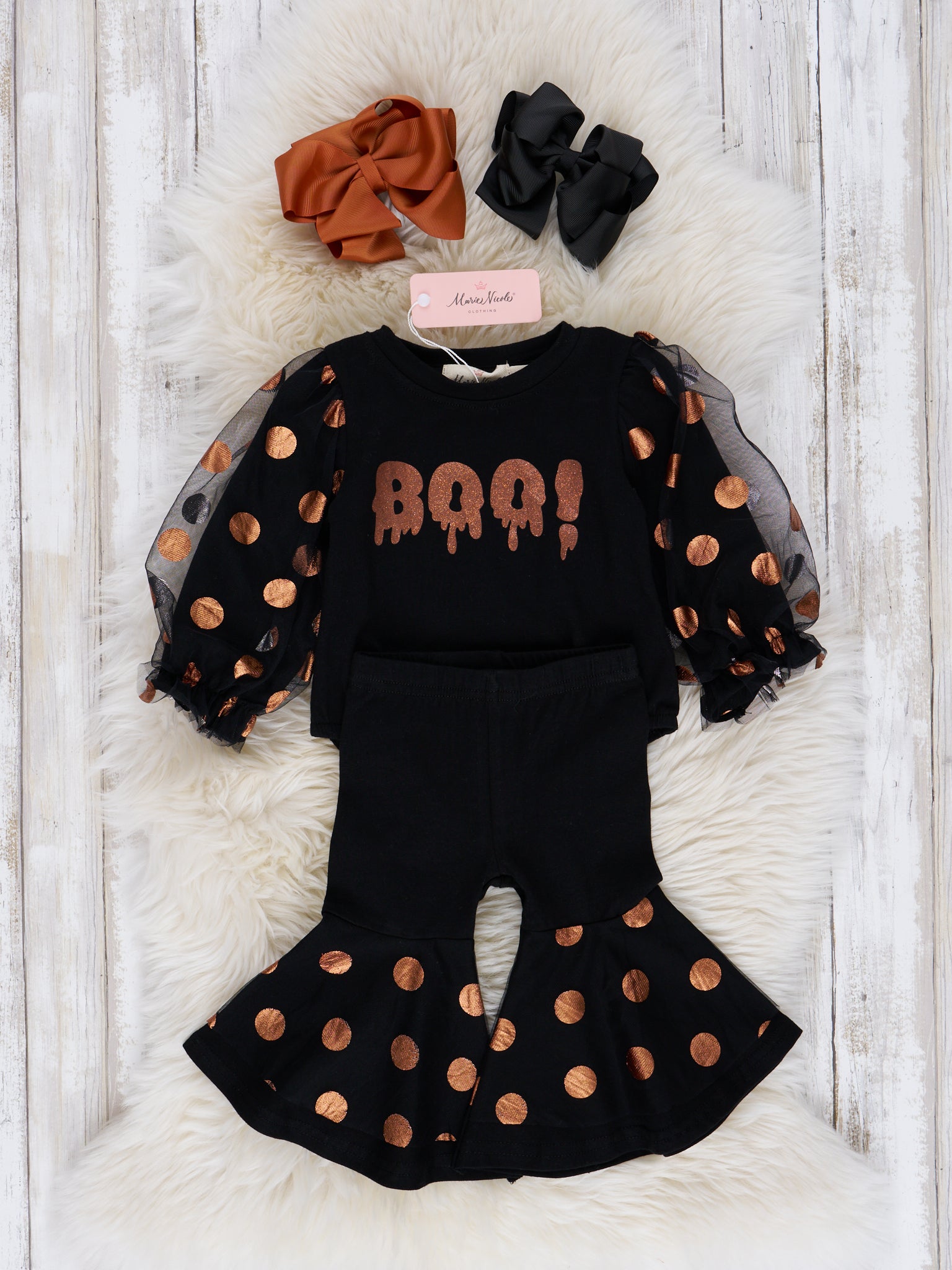 It's a 'Boo!' bash with this Mom & Me Orange & Black Polka Dot Top! With a chic mesh sleeve featuring an explosion of orange polka dots, this 'Boo!' top is perfect for your matching mini, and the bell-bottom romper will have your littlest mini happily haunting the town!