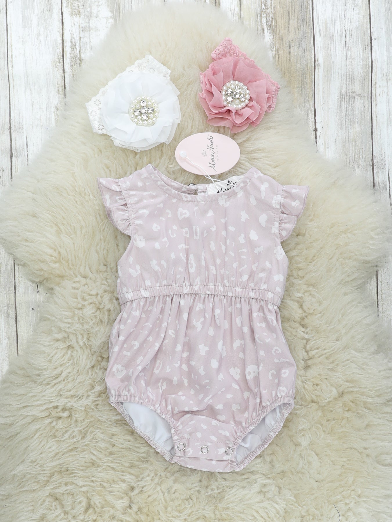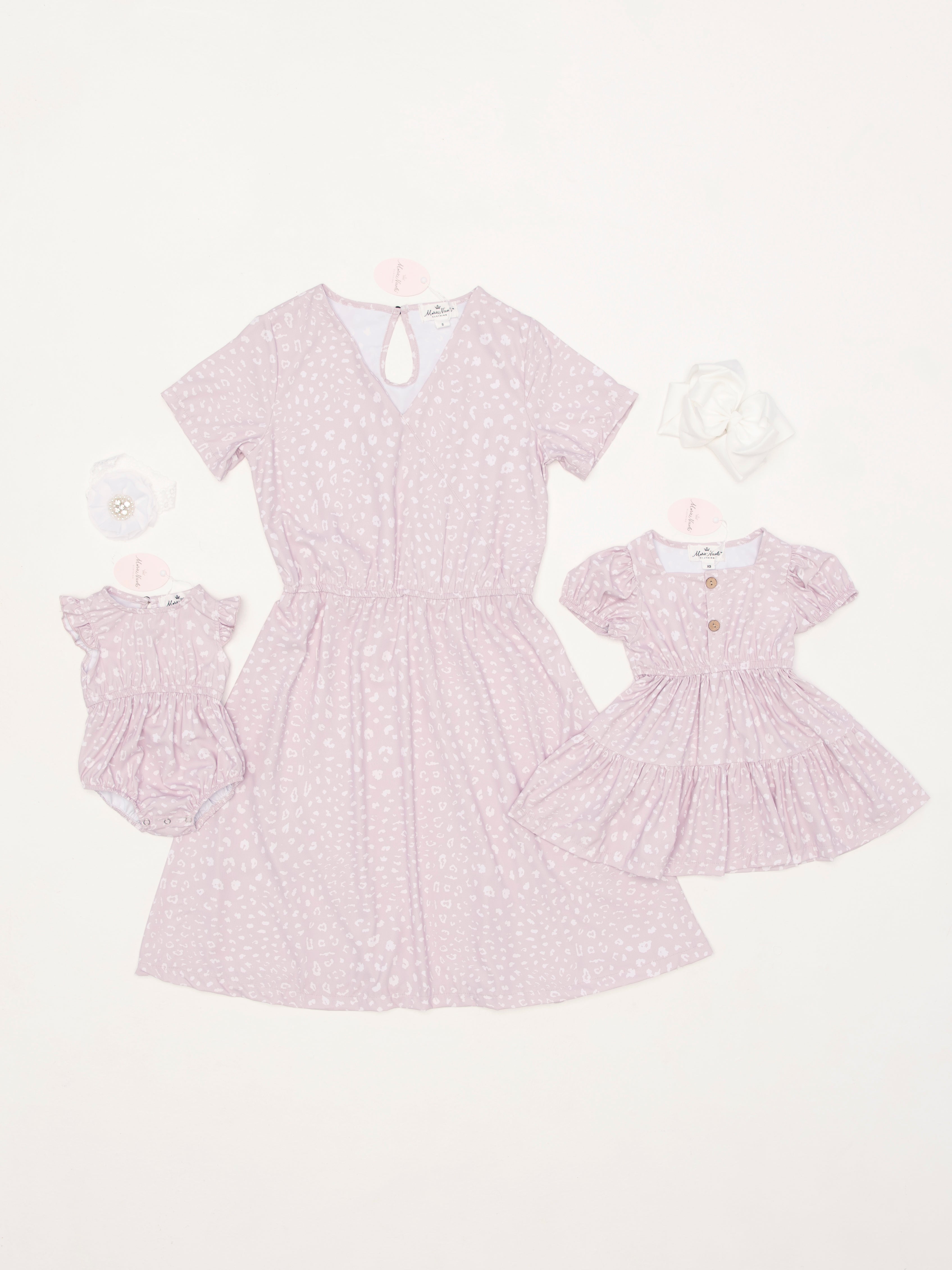 Match your girls in this mauve animal print dress or romper! Mom's dress is a faux wrap dress, so you'll get the style of a wrap dress without the risk of it coming untied! Big sister's dress is a tiered a-line dress with a square neckline. Little sister's romper has flutter sleeves and an elastic waist.