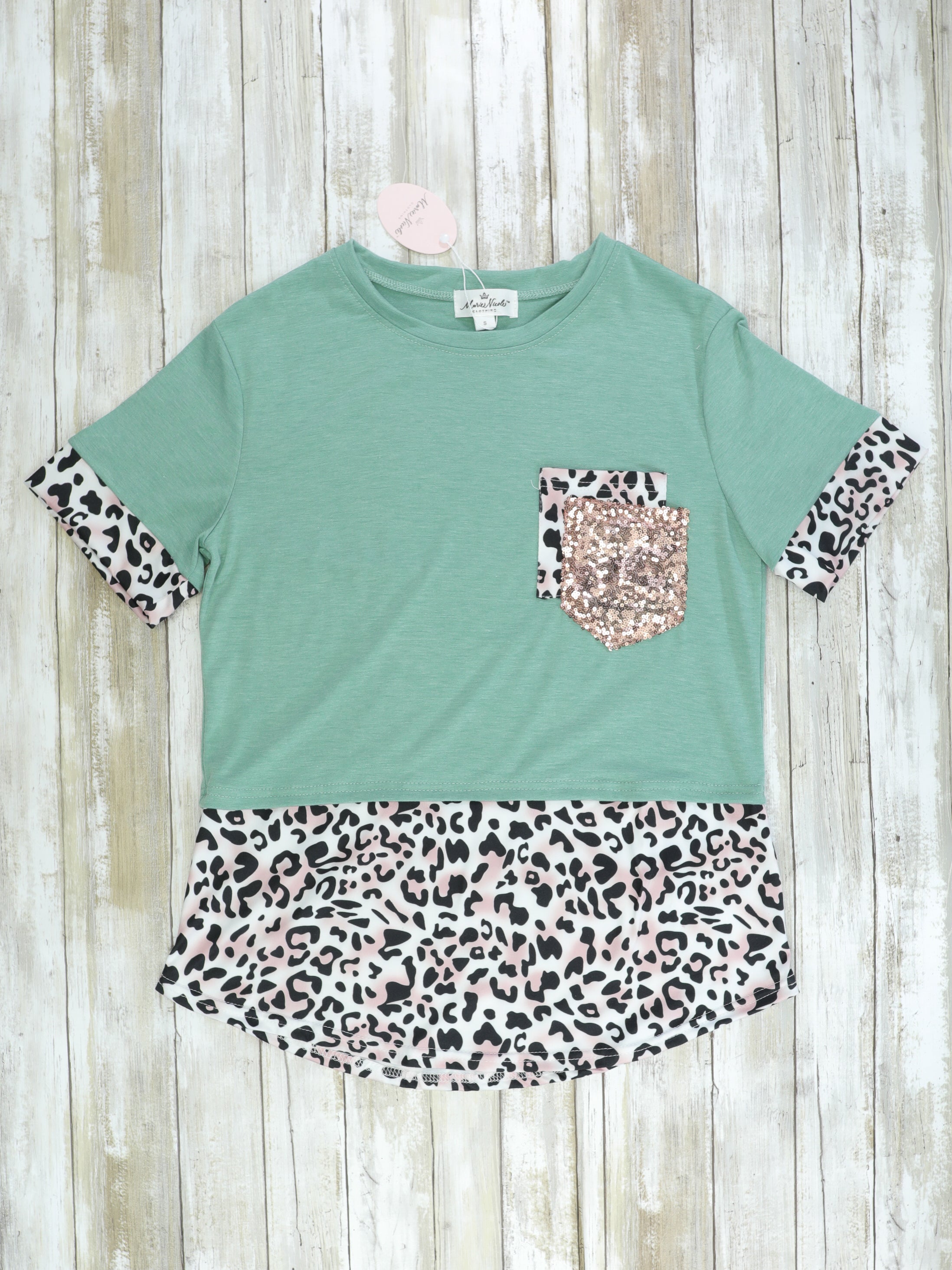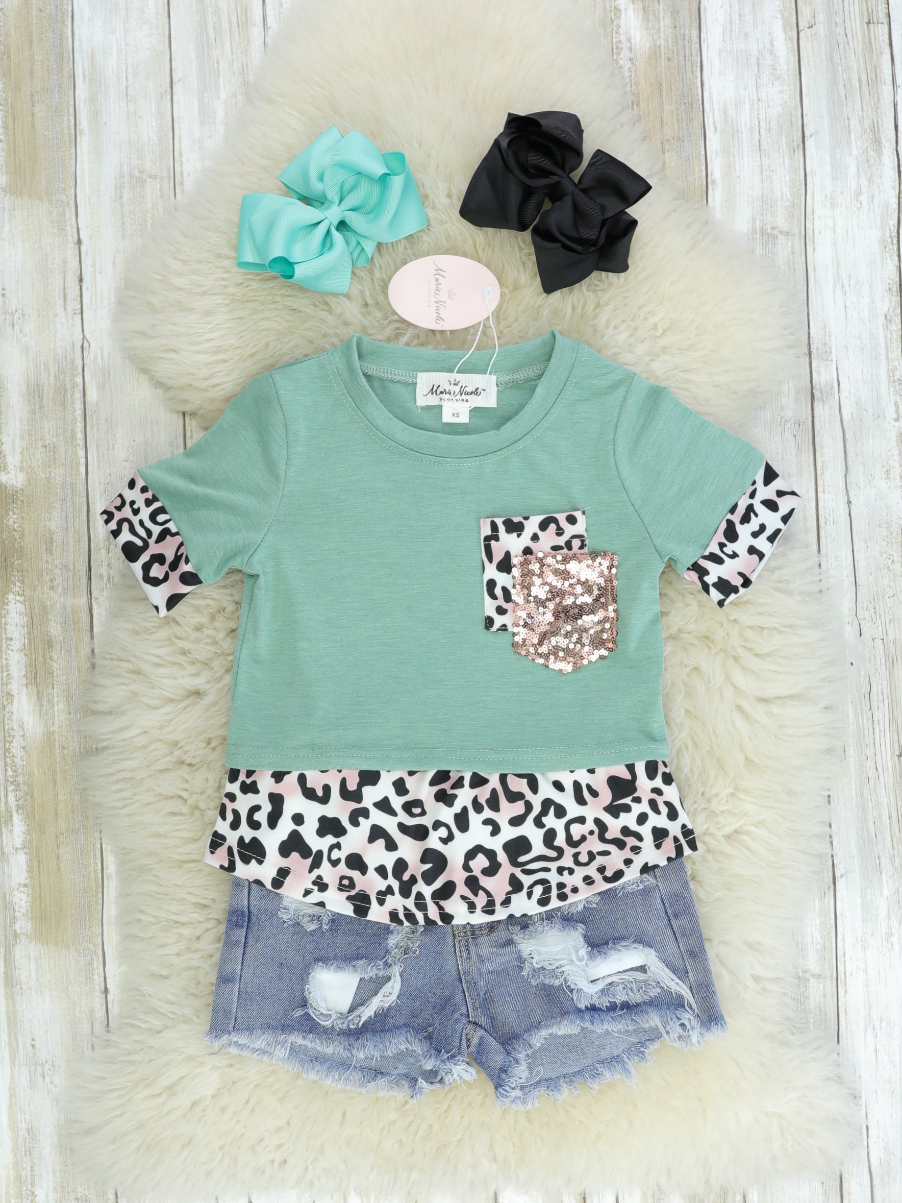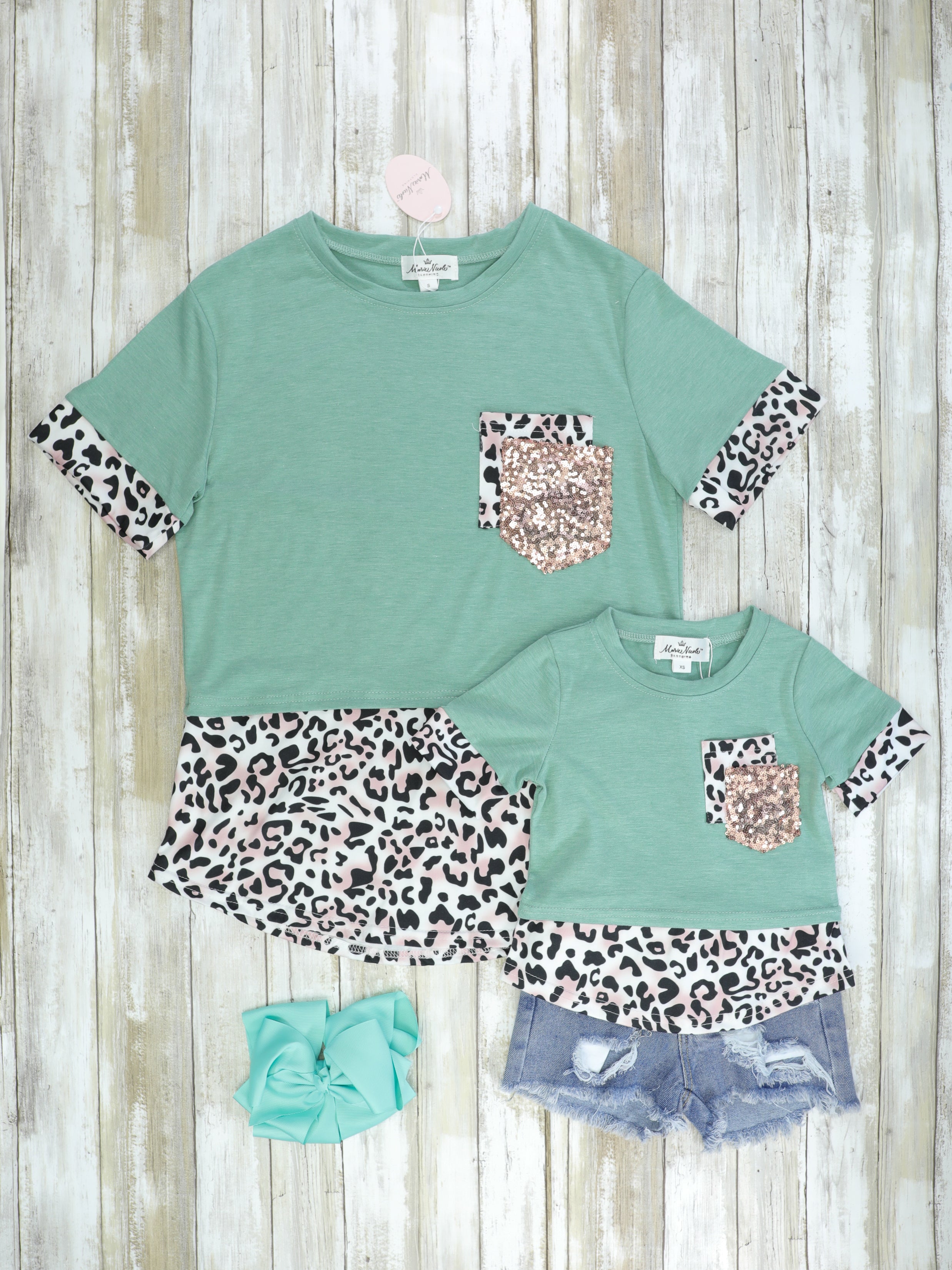 The cutest tops for you & your little to match in on those WILD days! These sage shirts feature leopard details on the sleeves and bottom, as well as a matching leopard pocket & rose gold pocket. Shorts included with girls shirt.
